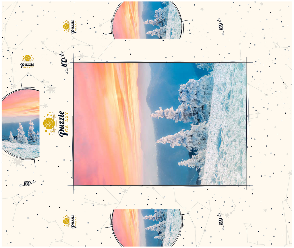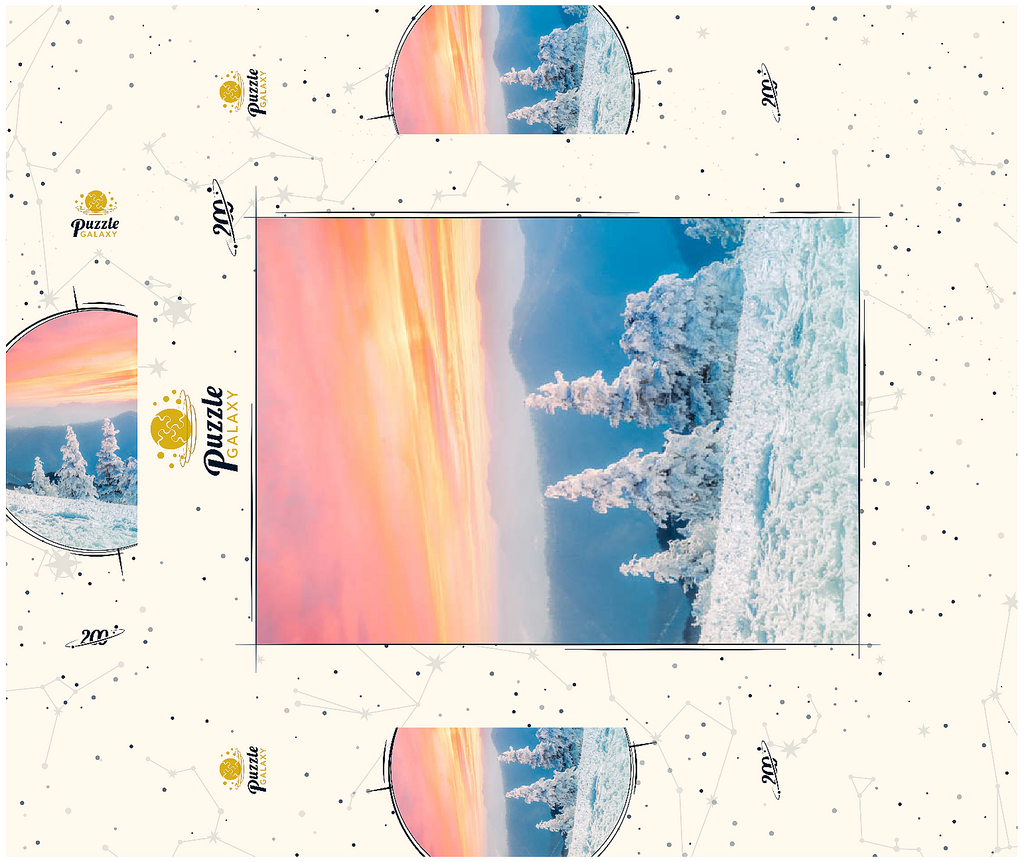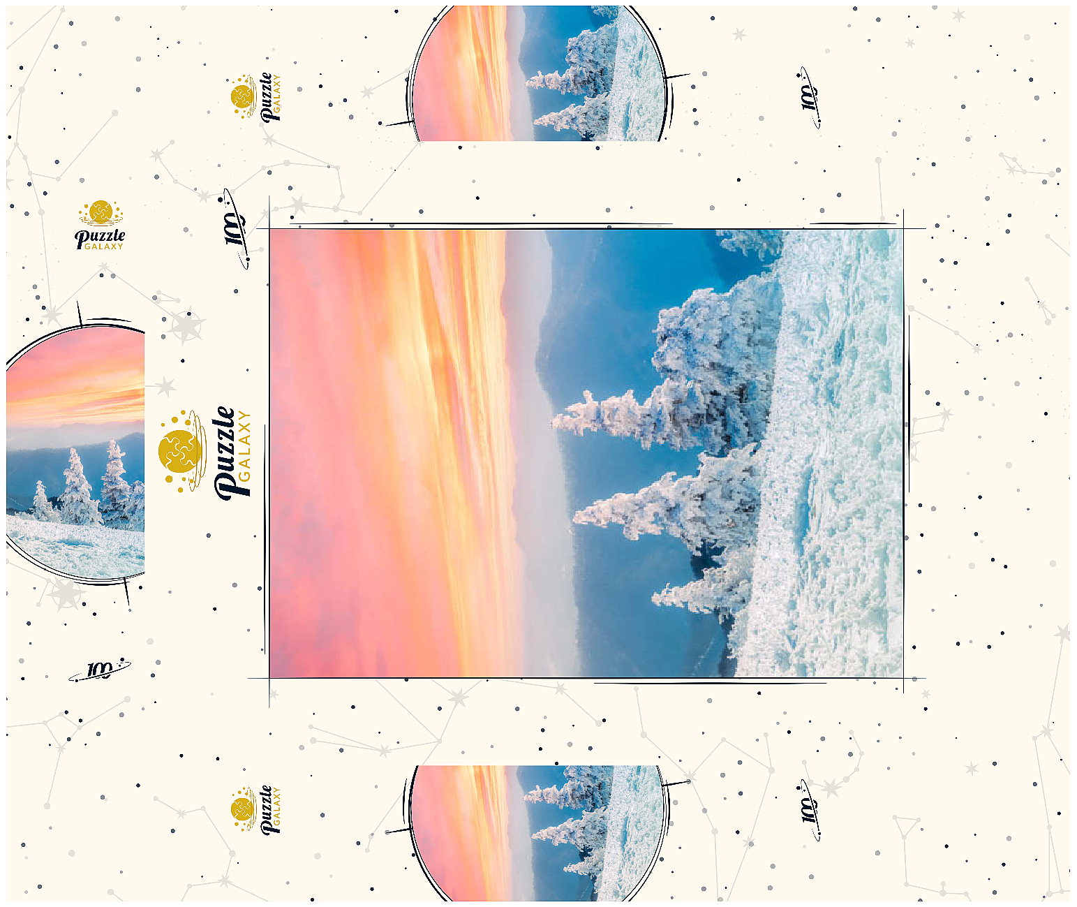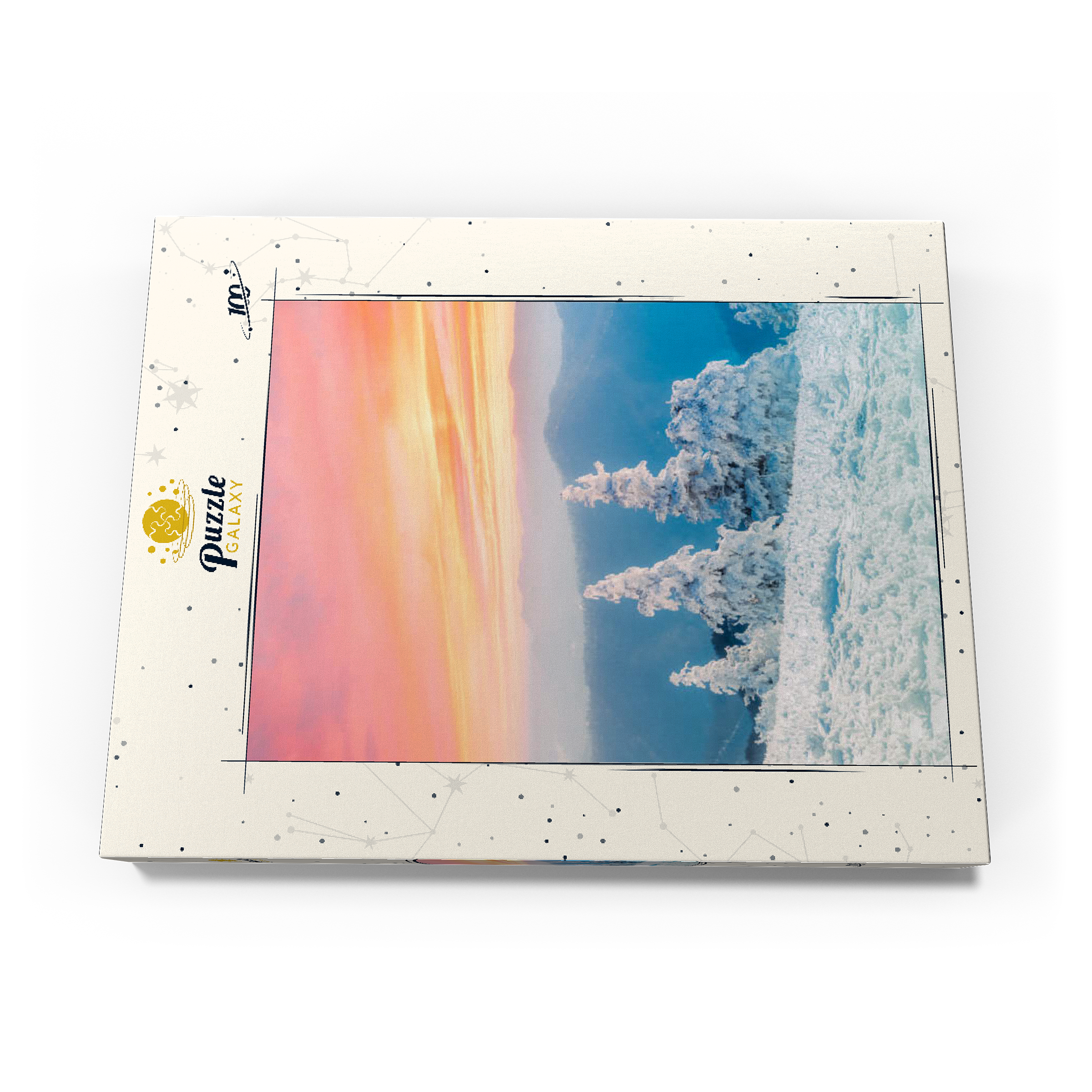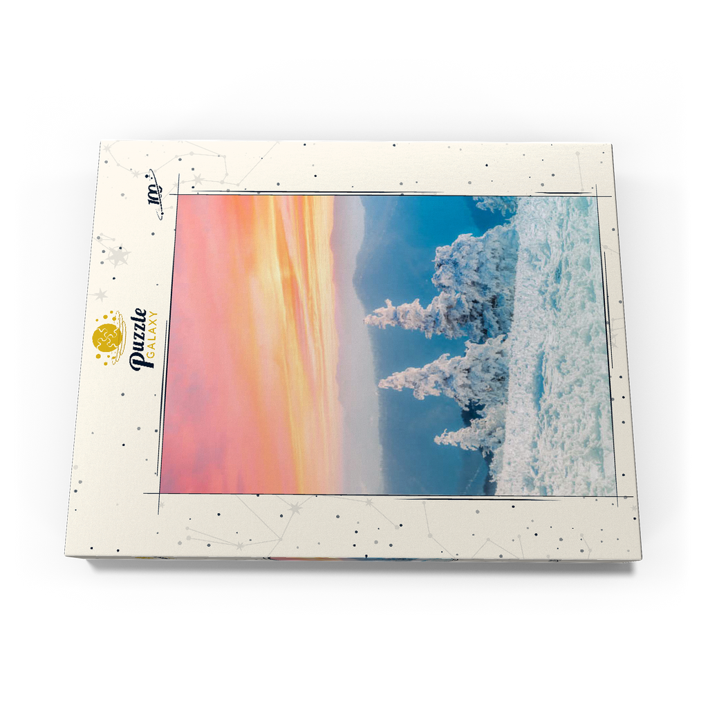 Diese atemberaubende Winterszene zeigt schneebedeckte Bäume auf einem frostigen Berg, der in die warmen Farbtöne eines lebhaften Sonnenuntergangs getaucht ist. Der rosafarbene und orangefarbene Himmel verschmilzt nahtlos mit den sanften Blautönen der entfernten Bergketten und schafft eine friedliche und magische Atmosphäre. Die eisigen Details auf den Bäumen und dem Boden sorgen für Struktur und Kontrast und unterstreichen die ruhige Schönheit einer Winterlandschaft.