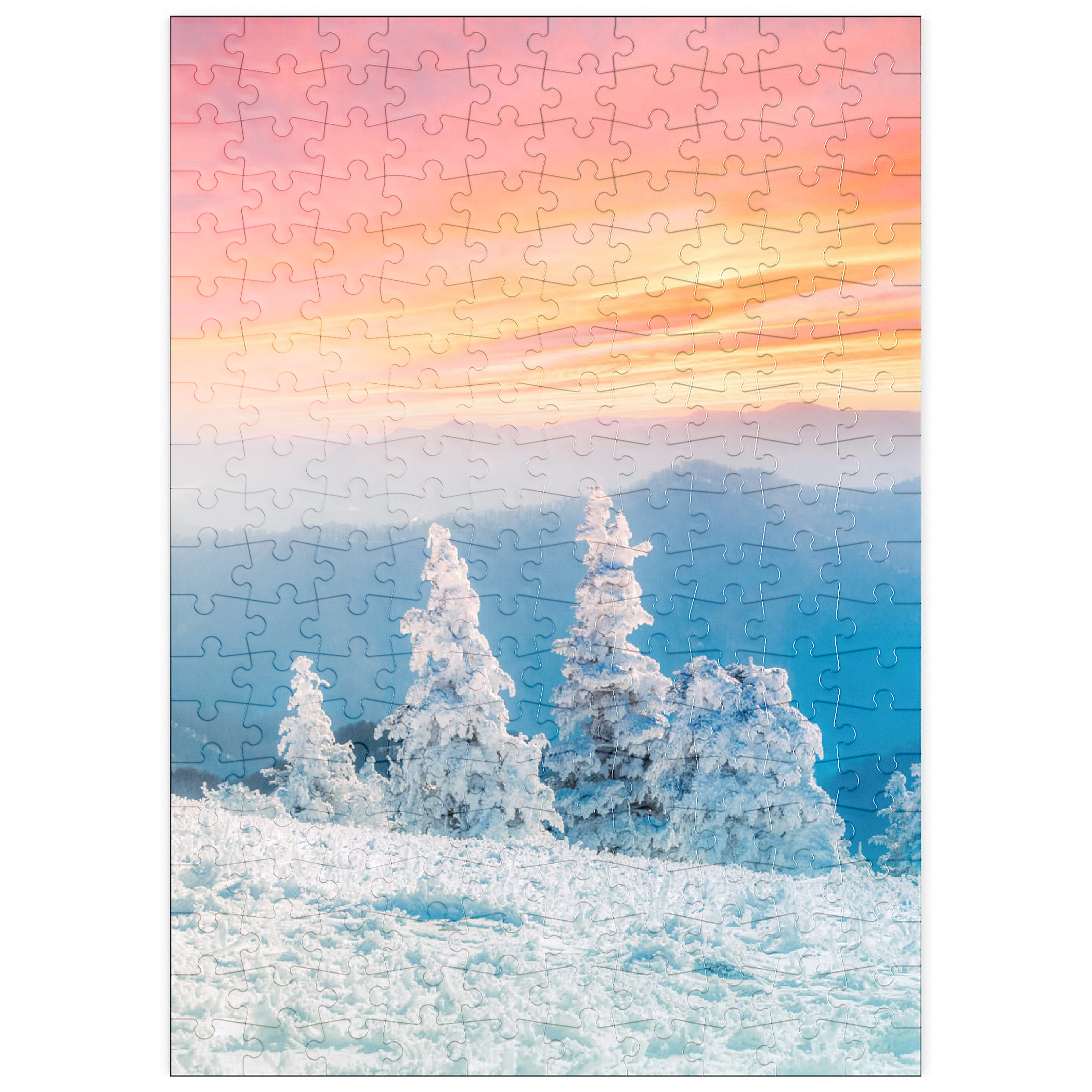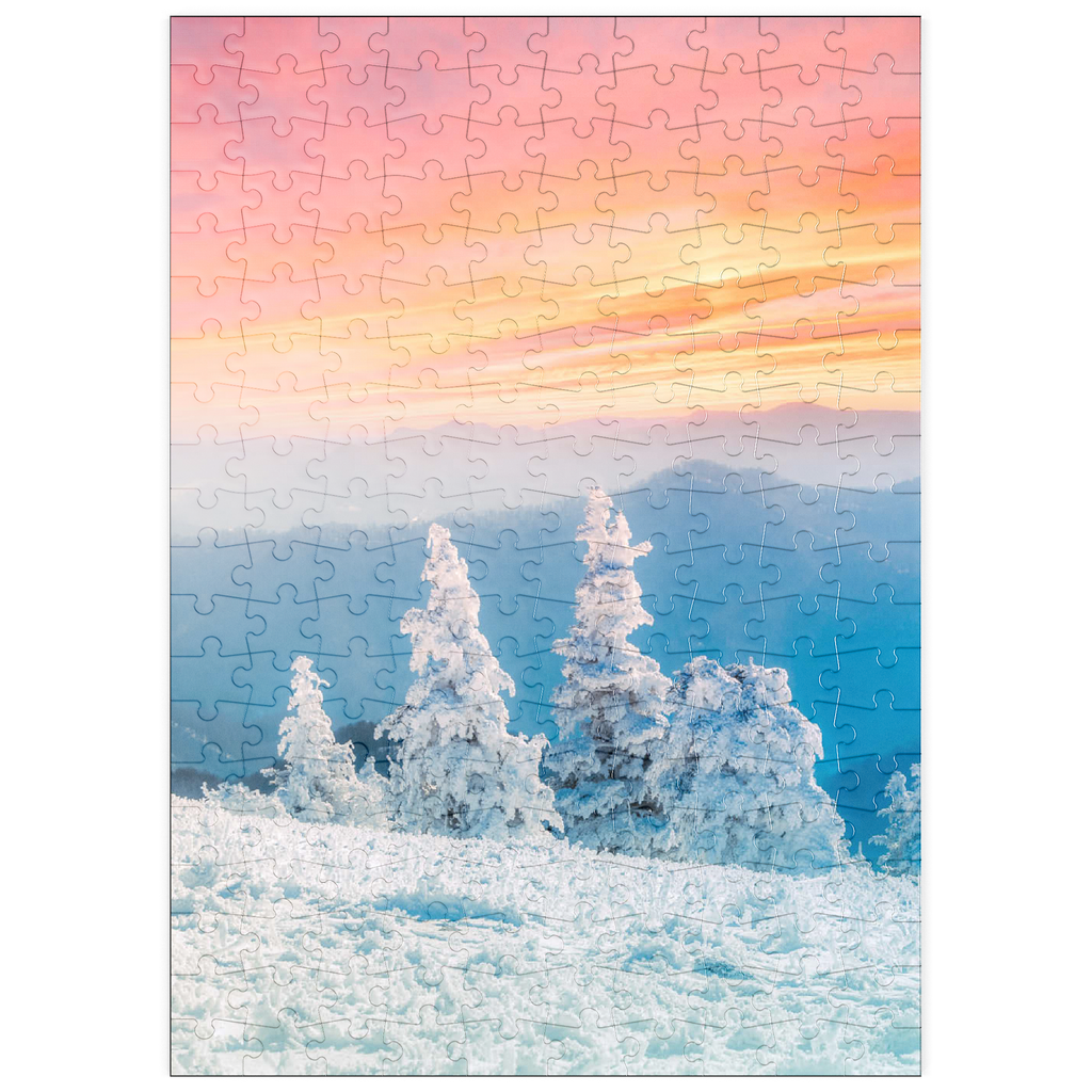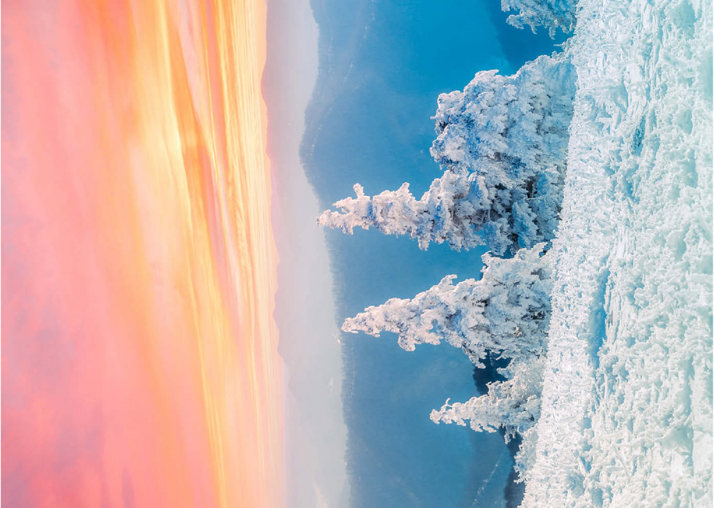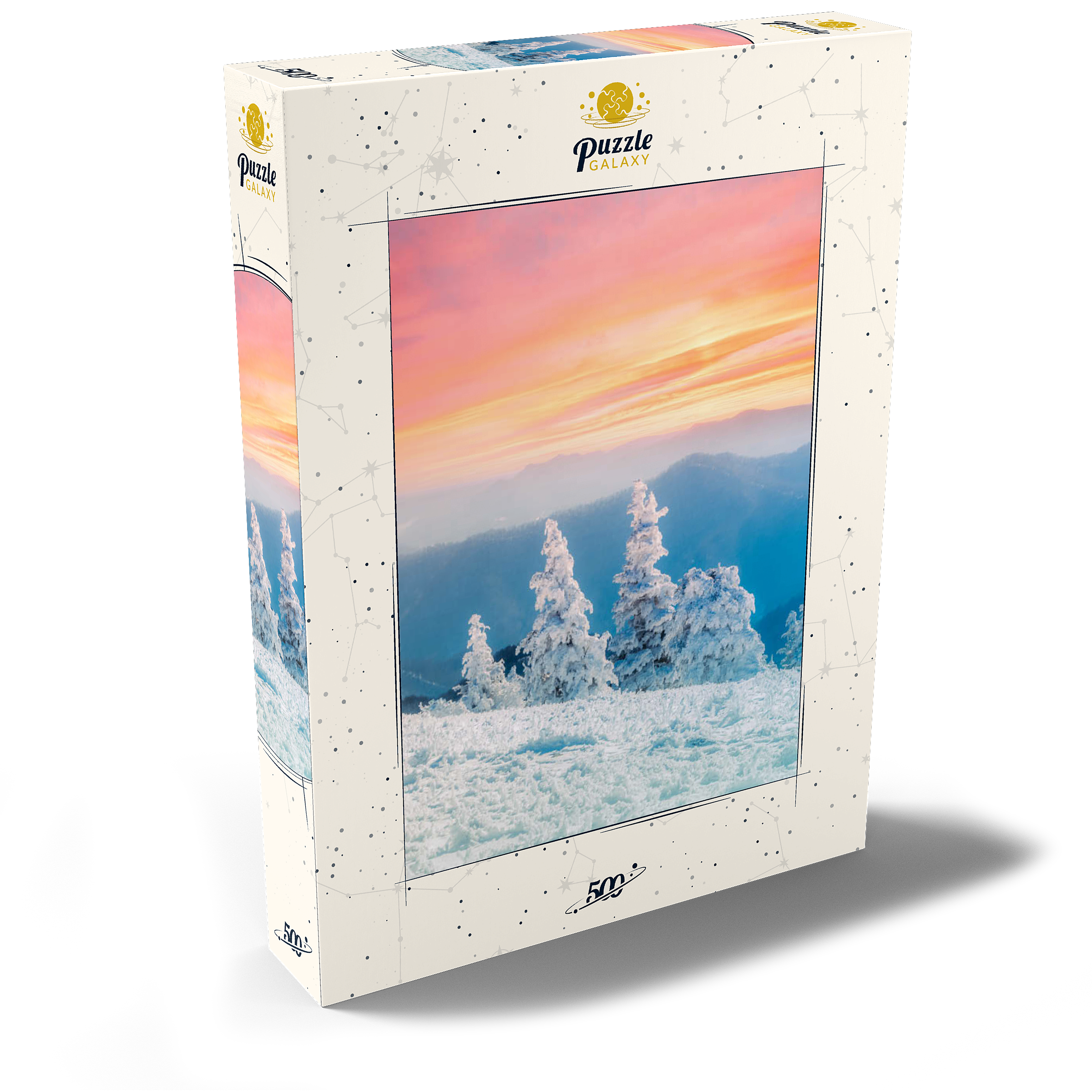 Diese atemberaubende Winterszene zeigt schneebedeckte Bäume auf einem frostigen Berg, der in die warmen Farbtöne eines lebhaften Sonnenuntergangs getaucht ist. Der rosafarbene und orangefarbene Himmel verschmilzt nahtlos mit den sanften Blautönen der entfernten Bergketten und schafft eine friedliche und magische Atmosphäre. Die eisigen Details auf den Bäumen und dem Boden sorgen für Struktur und Kontrast und unterstreichen die ruhige Schönheit einer Winterlandschaft.