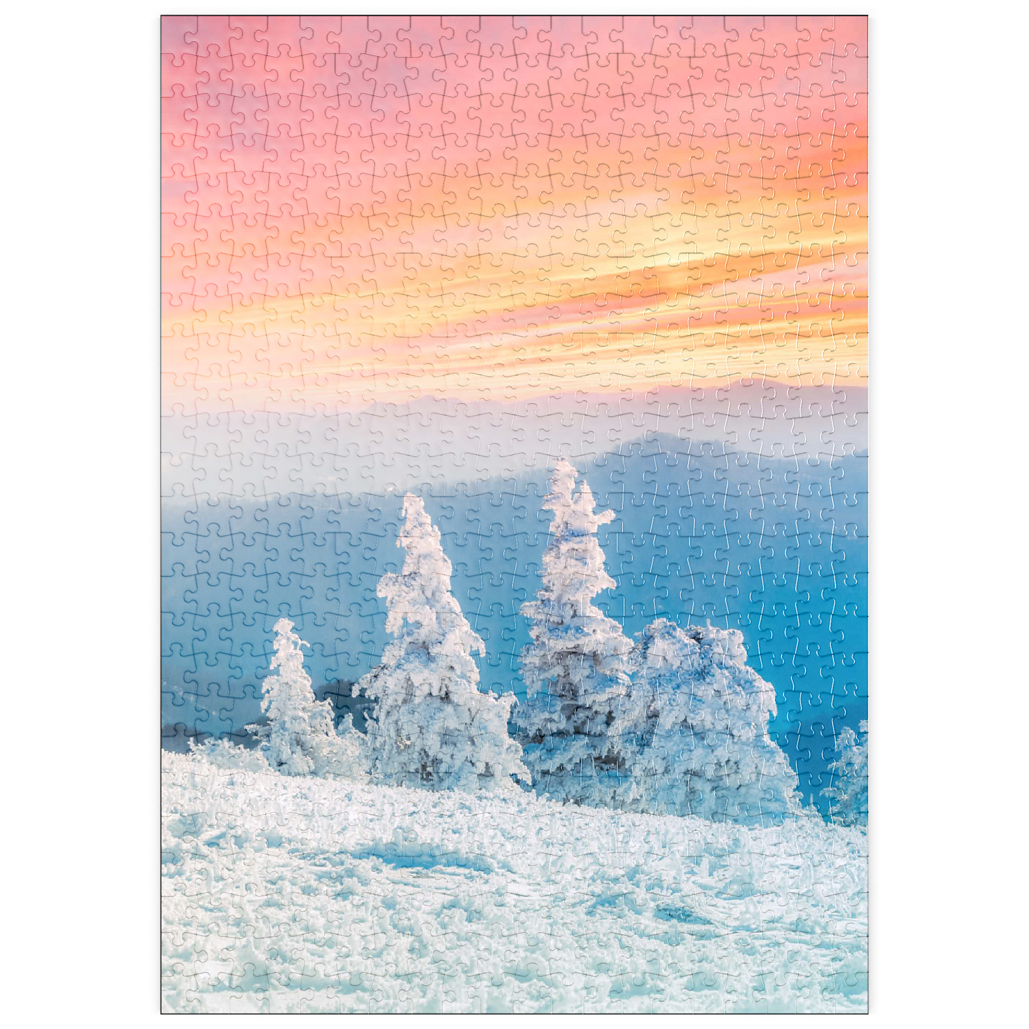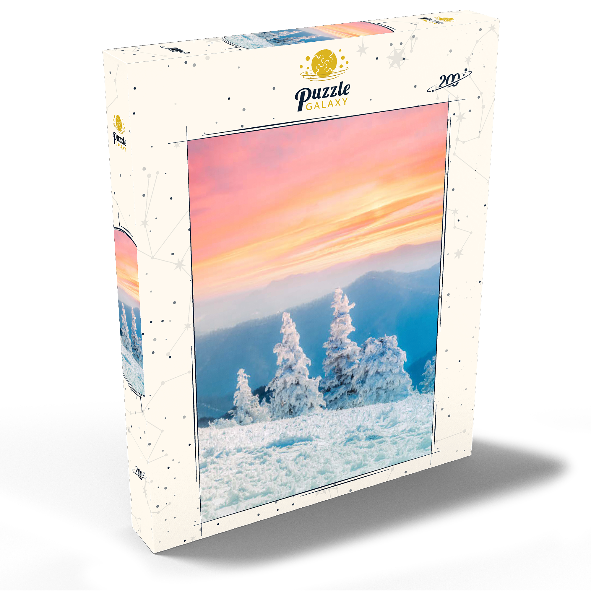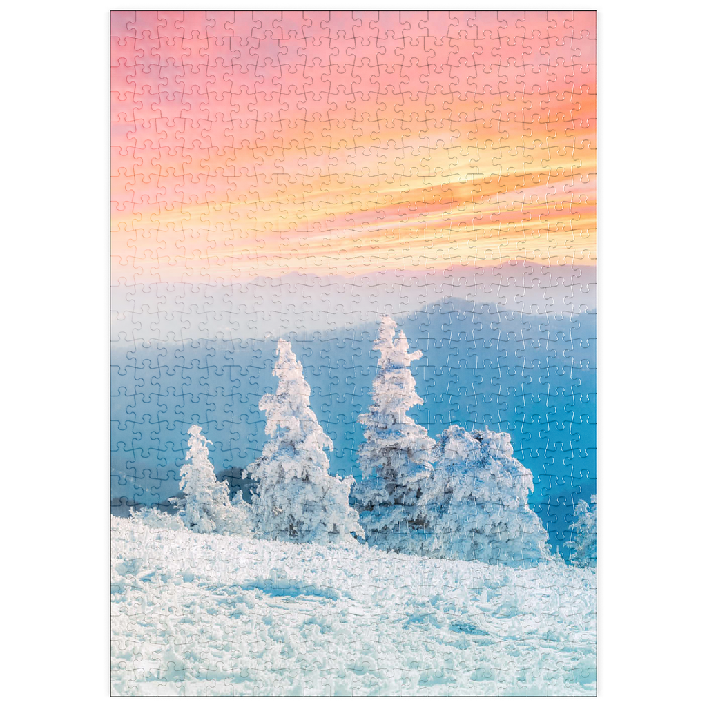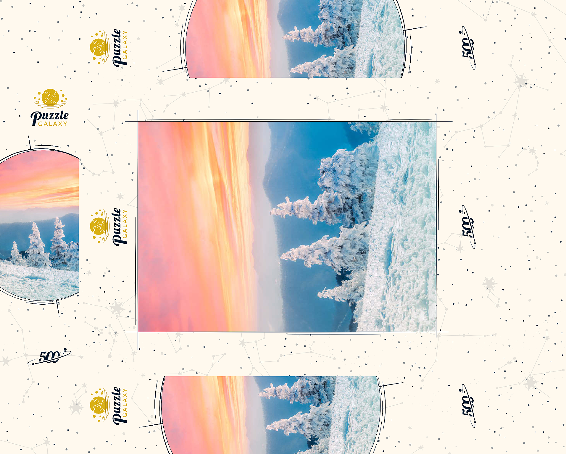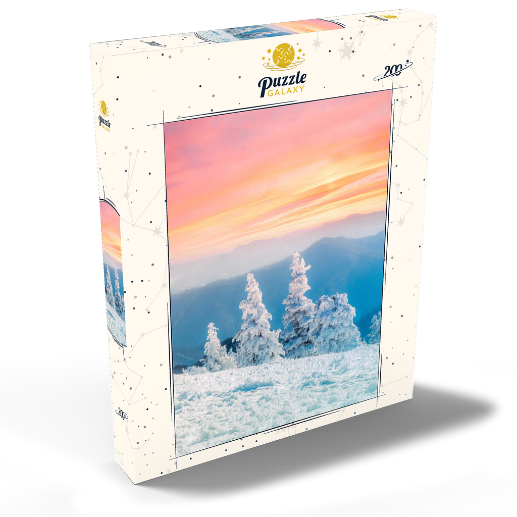 Diese atemberaubende Winterszene zeigt schneebedeckte Bäume auf einem frostigen Berg, der in die warmen Farbtöne eines lebhaften Sonnenuntergangs getaucht ist. Der rosafarbene und orangefarbene Himmel verschmilzt nahtlos mit den sanften Blautönen der entfernten Bergketten und schafft eine friedliche und magische Atmosphäre. Die eisigen Details auf den Bäumen und dem Boden sorgen für Struktur und Kontrast und unterstreichen die ruhige Schönheit einer Winterlandschaft.