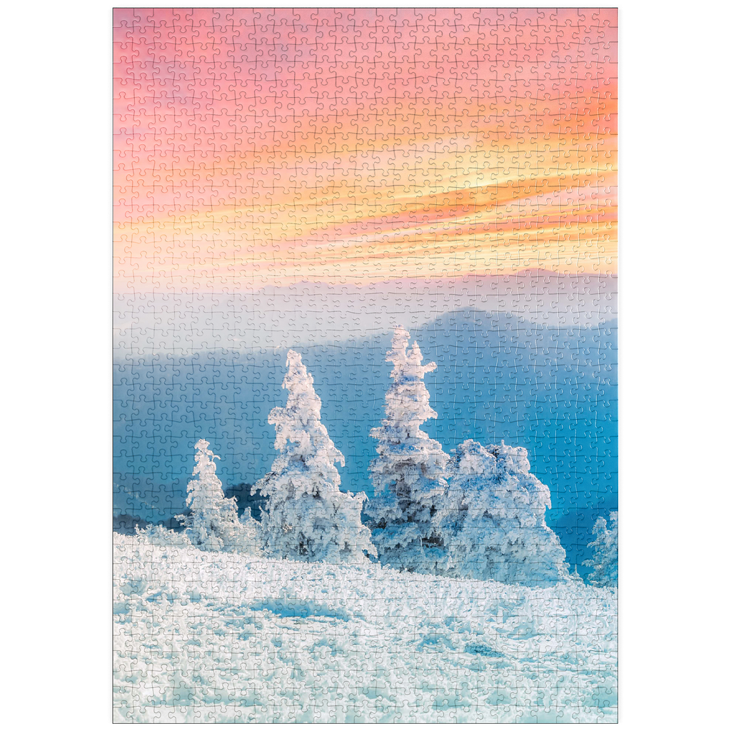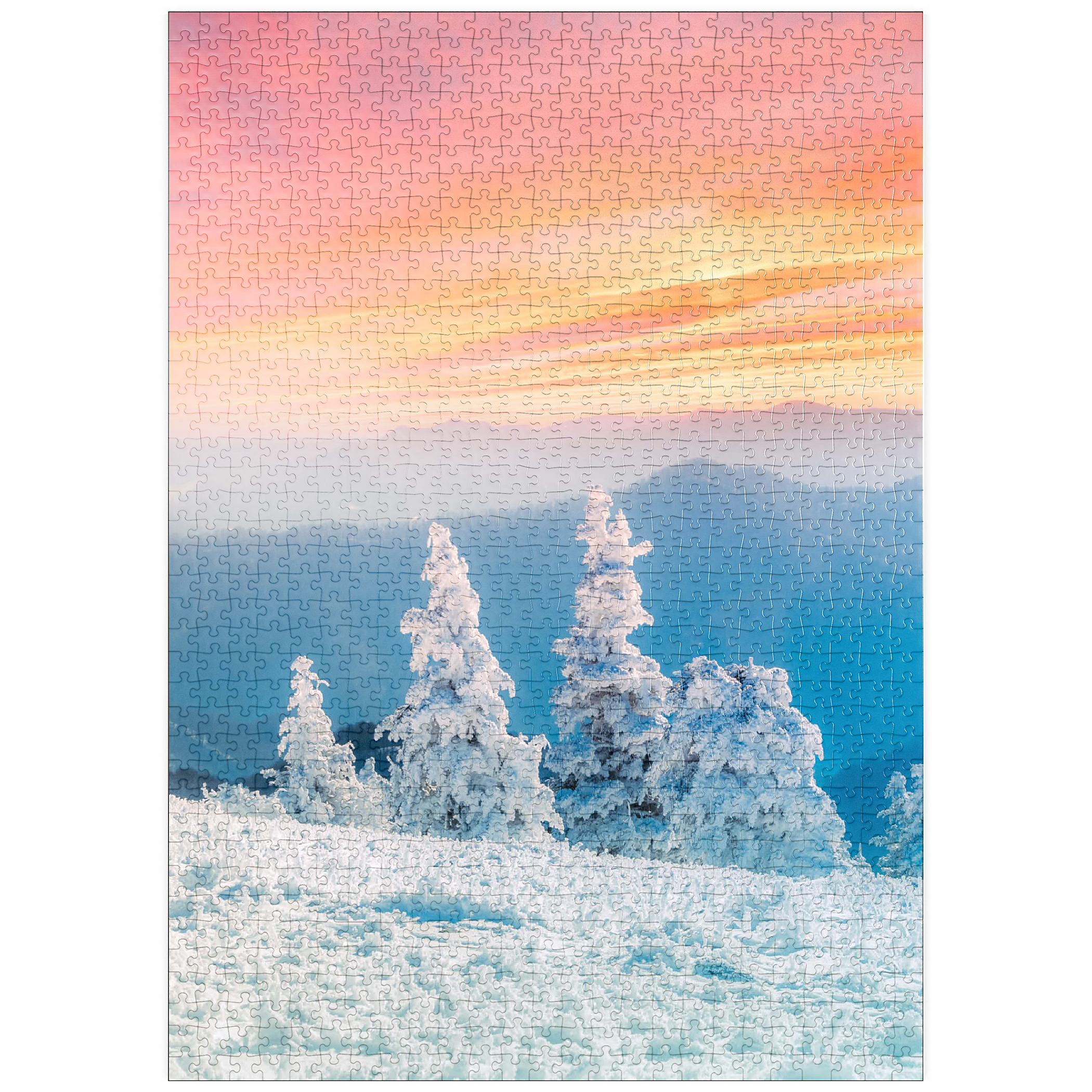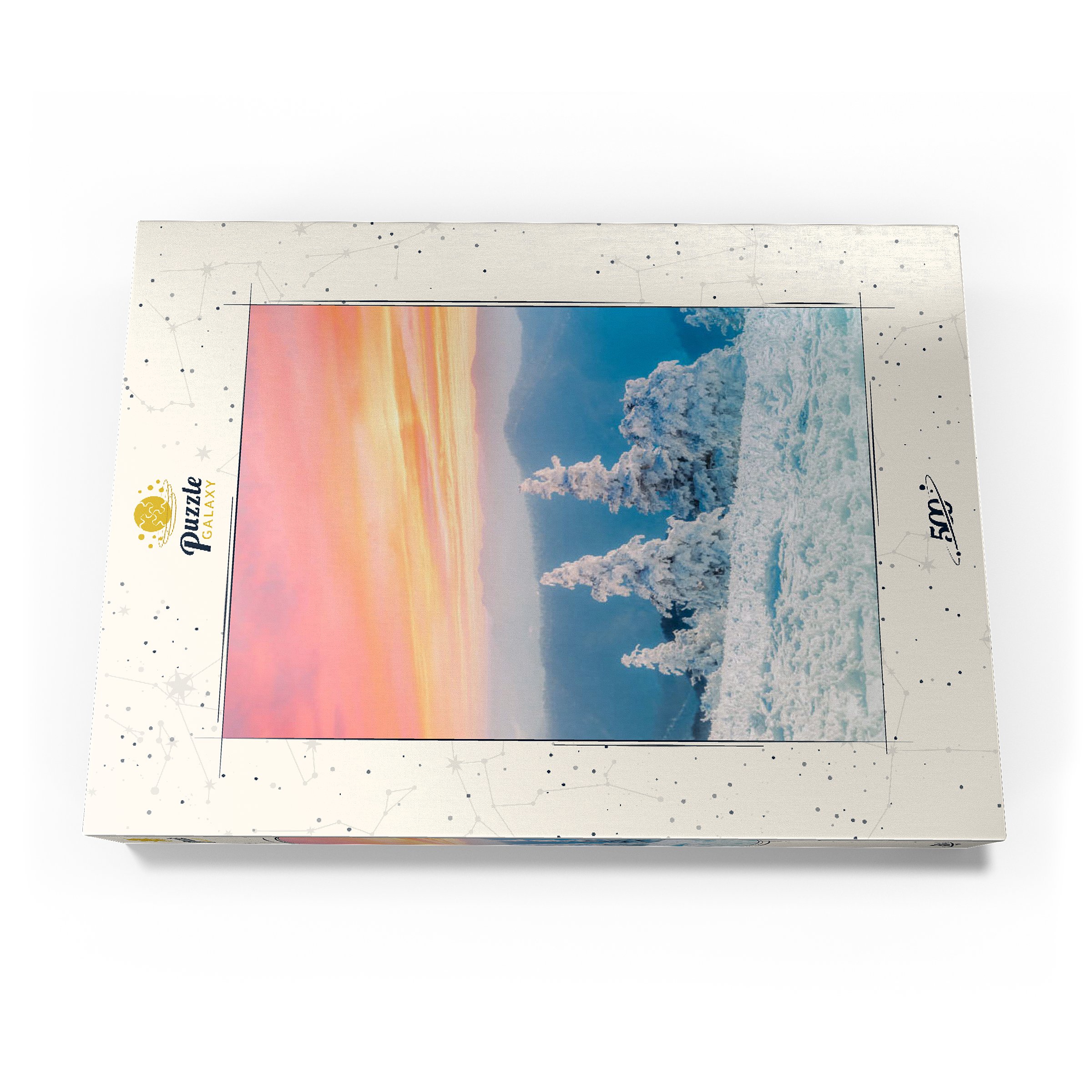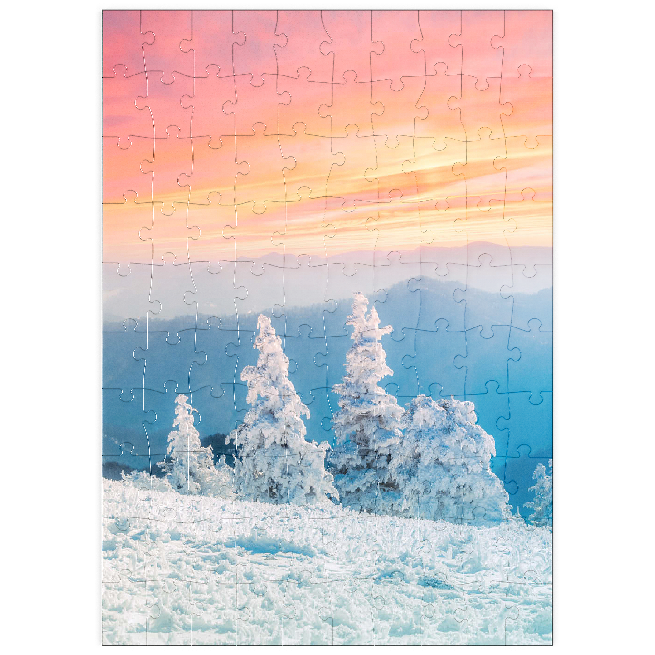 Diese atemberaubende Winterszene zeigt schneebedeckte Bäume auf einem frostigen Berg, der in die warmen Farbtöne eines lebhaften Sonnenuntergangs getaucht ist. Der rosafarbene und orangefarbene Himmel verschmilzt nahtlos mit den sanften Blautönen der entfernten Bergketten und schafft eine friedliche und magische Atmosphäre. Die eisigen Details auf den Bäumen und dem Boden sorgen für Struktur und Kontrast und unterstreichen die ruhige Schönheit einer Winterlandschaft.