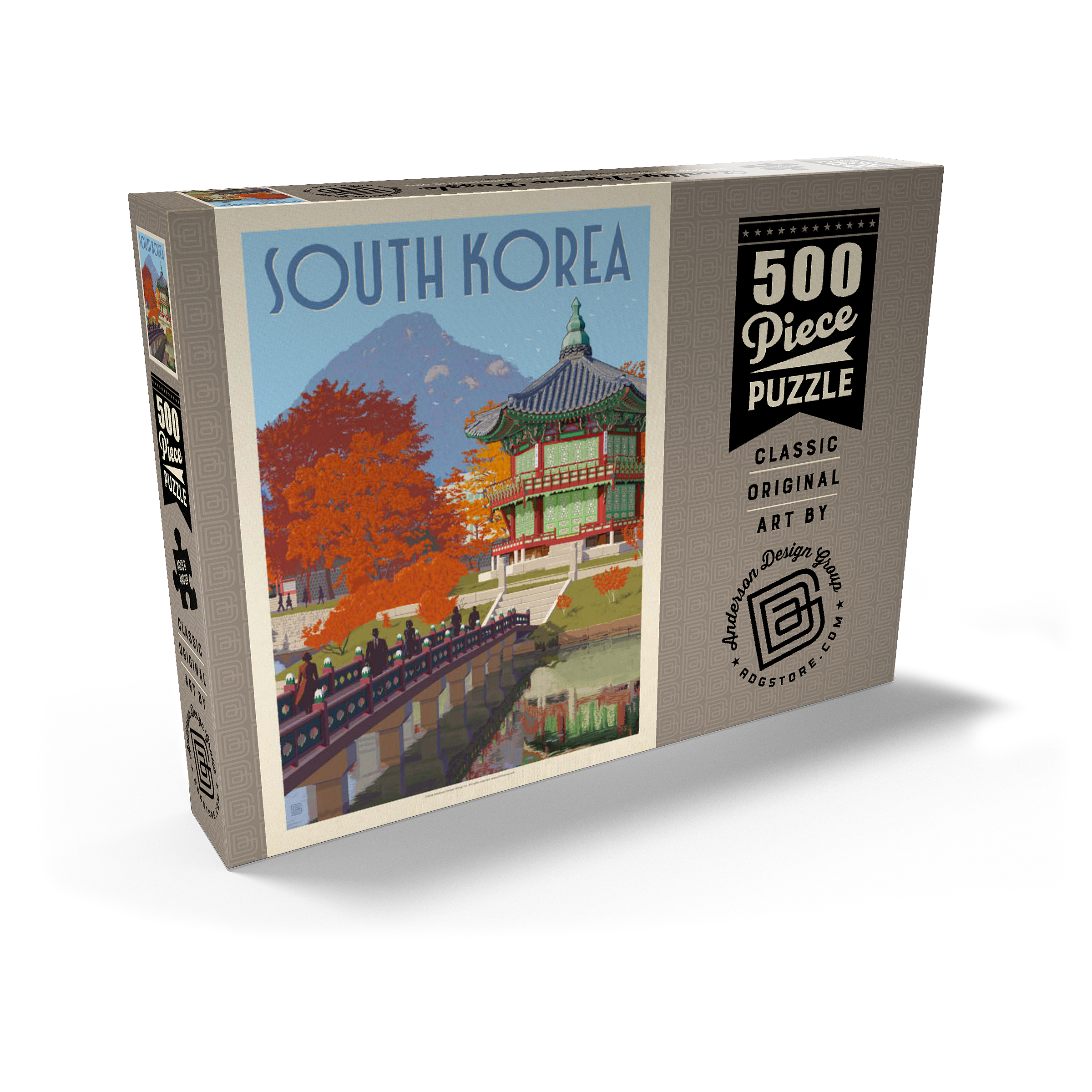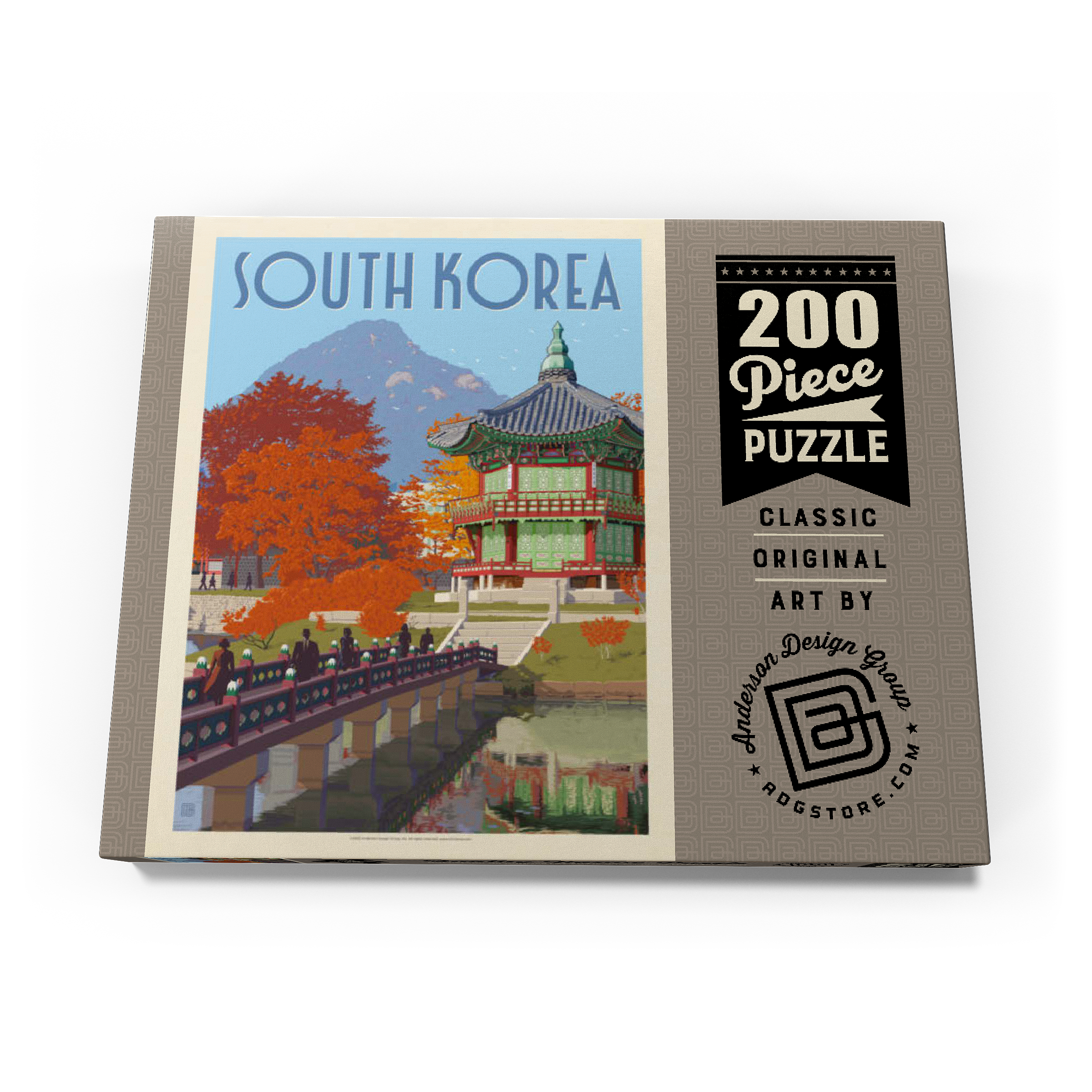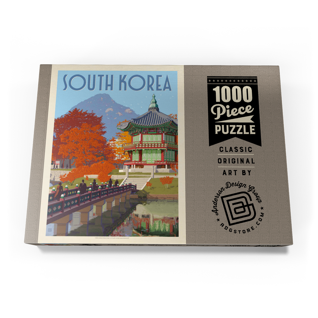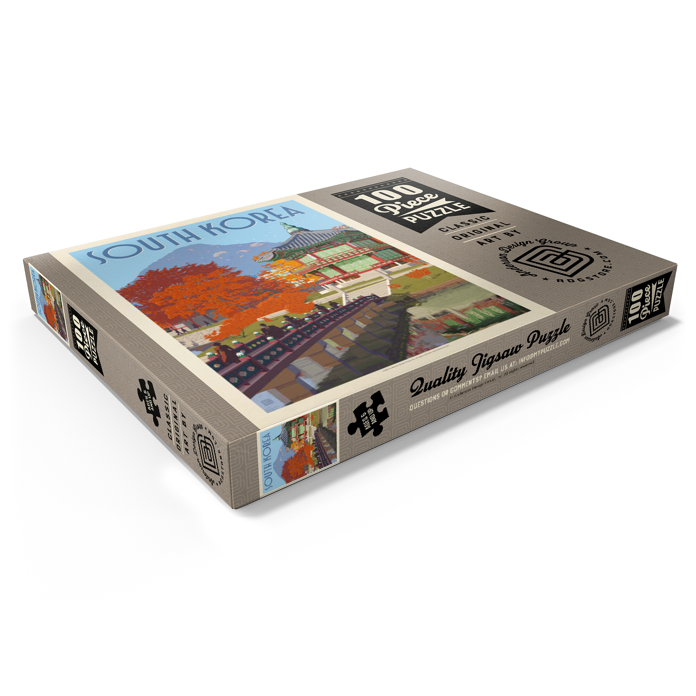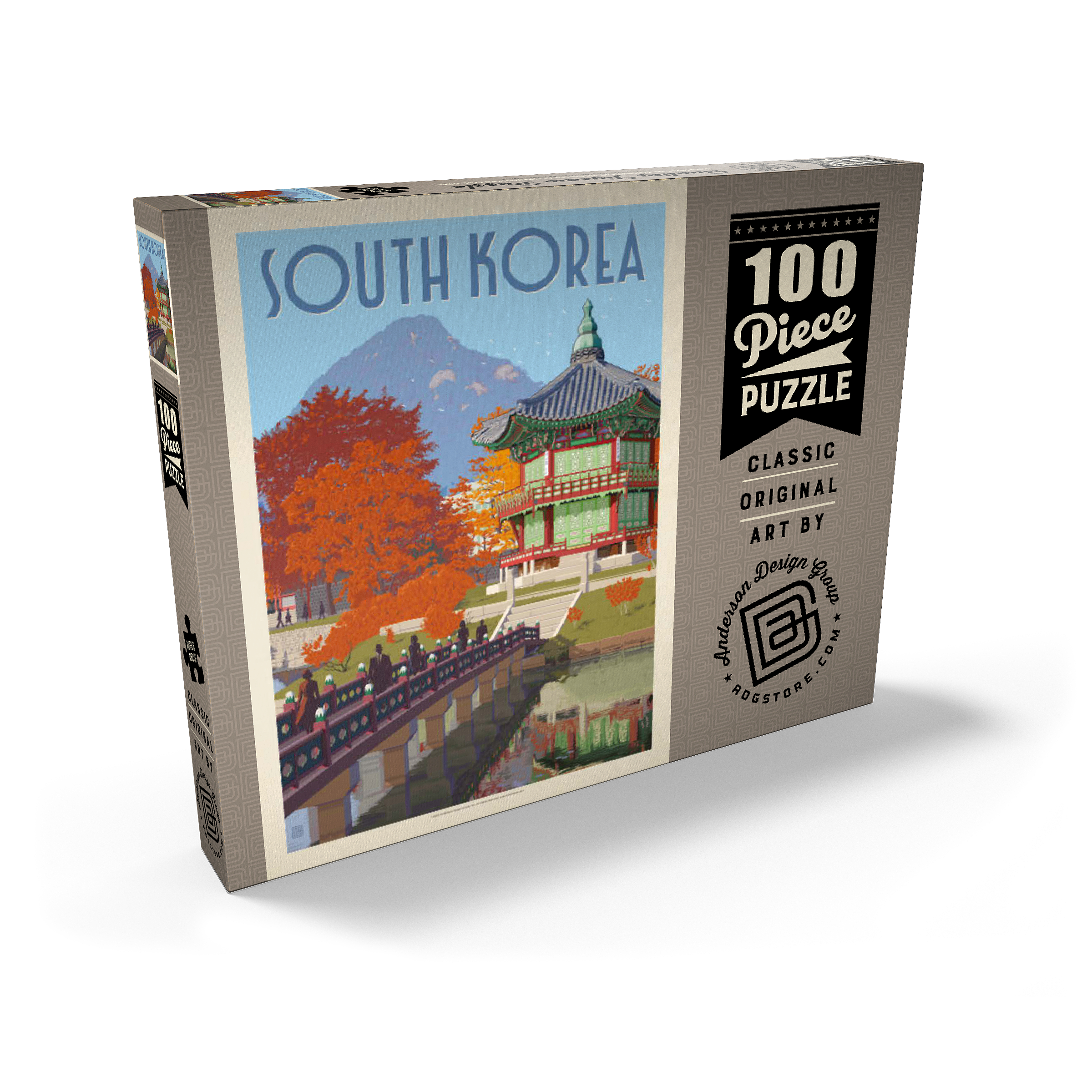 Der Gyeongbokgung-Palast in Seoul zeigt sich im Herbst in leuchtendem Rot und Orange. Im Mittelpunkt steht der Hyangwonjeong-Pavillon, ein elegantes, sechseckiges Gebäude des 19. Jahrhunderts, malerisch auf einer Insel im Teich gelegen und über eine traditionelle Holzbrücke erreichbar. Vor der Kulisse des Bugaksan-Berges spiegeln sich Pavillon und Bäume im stillen Wasser und verbinden kulturelles Erbe mit Naturharmonie. Der 1395 errichtete Gyeongbokgung ist der größte der Fünf Paläste Seouls und ein bedeutendes Symbol der Joseon-Dynastie. Die Szene vereint Architektur, Geschichte und Landschaft zu einem zeitlosen Bild koreanischer Tradition.