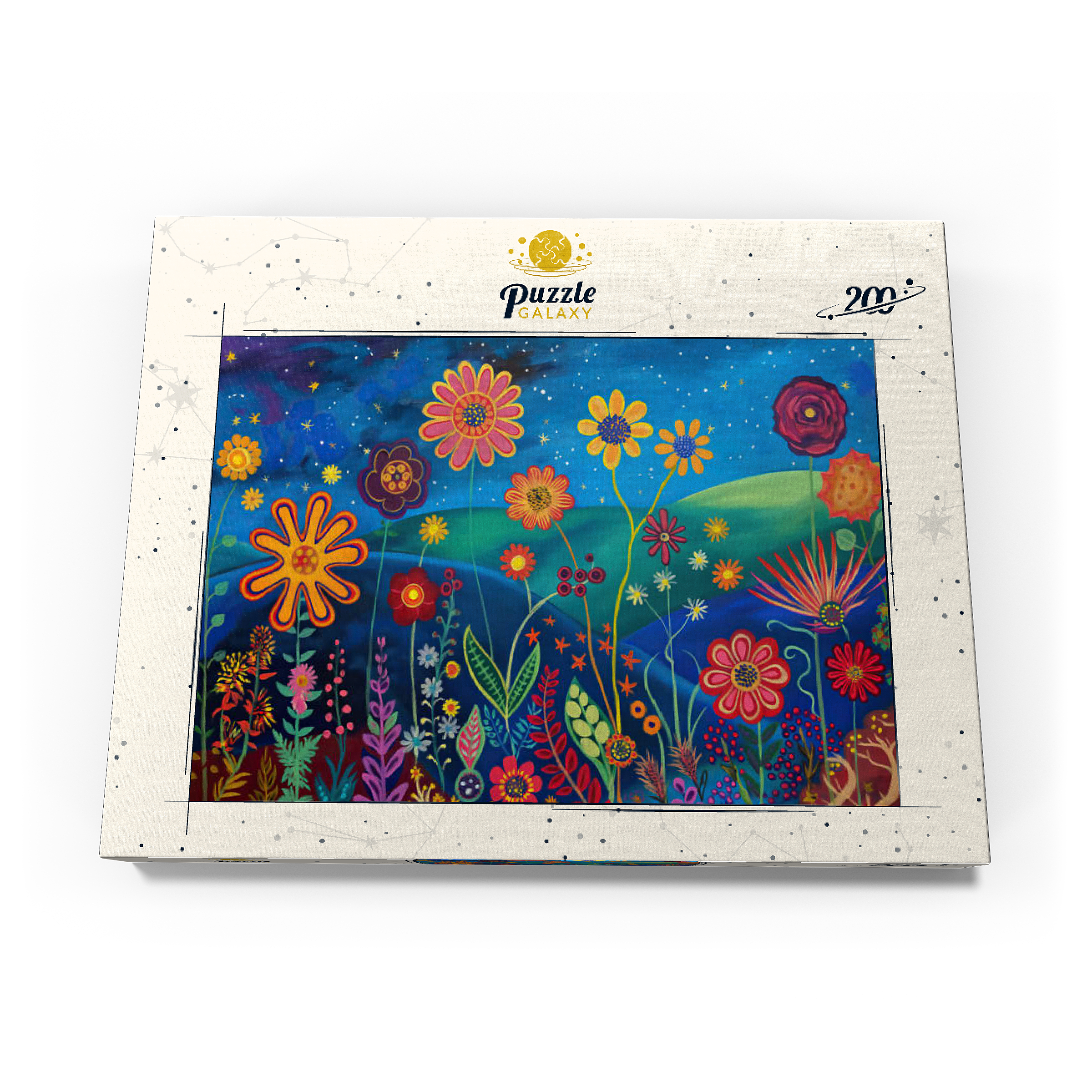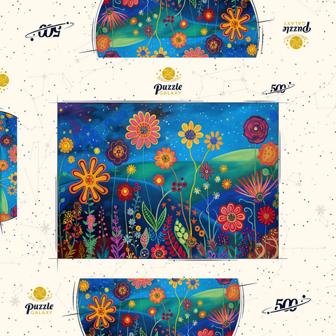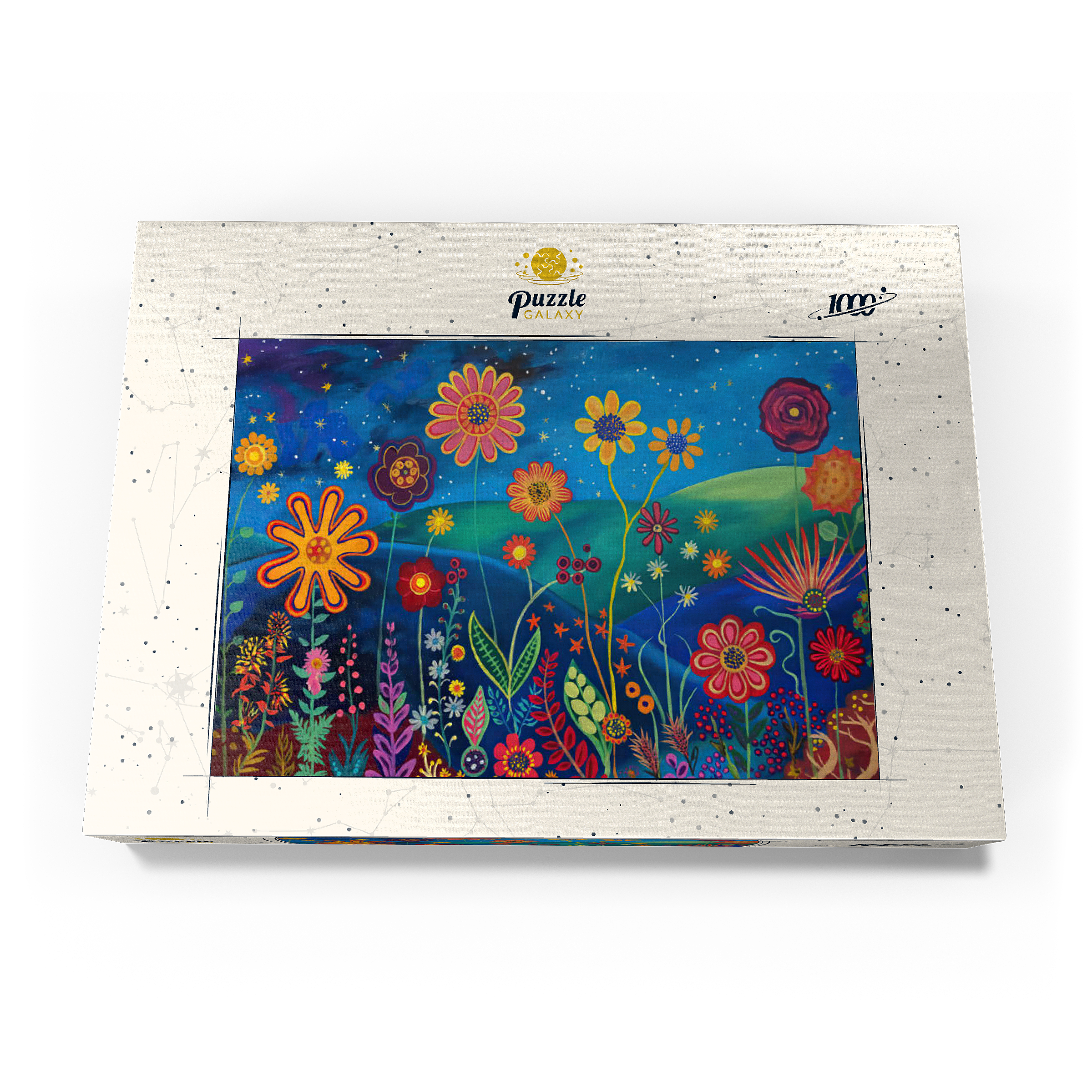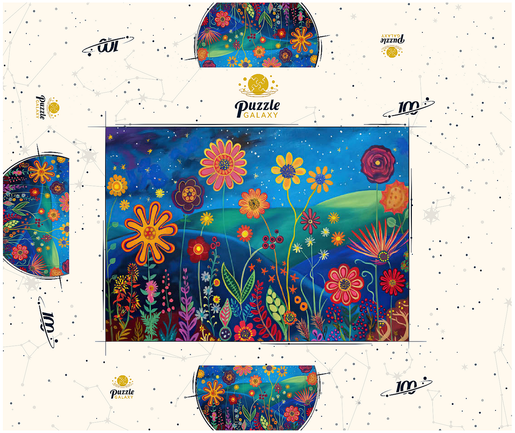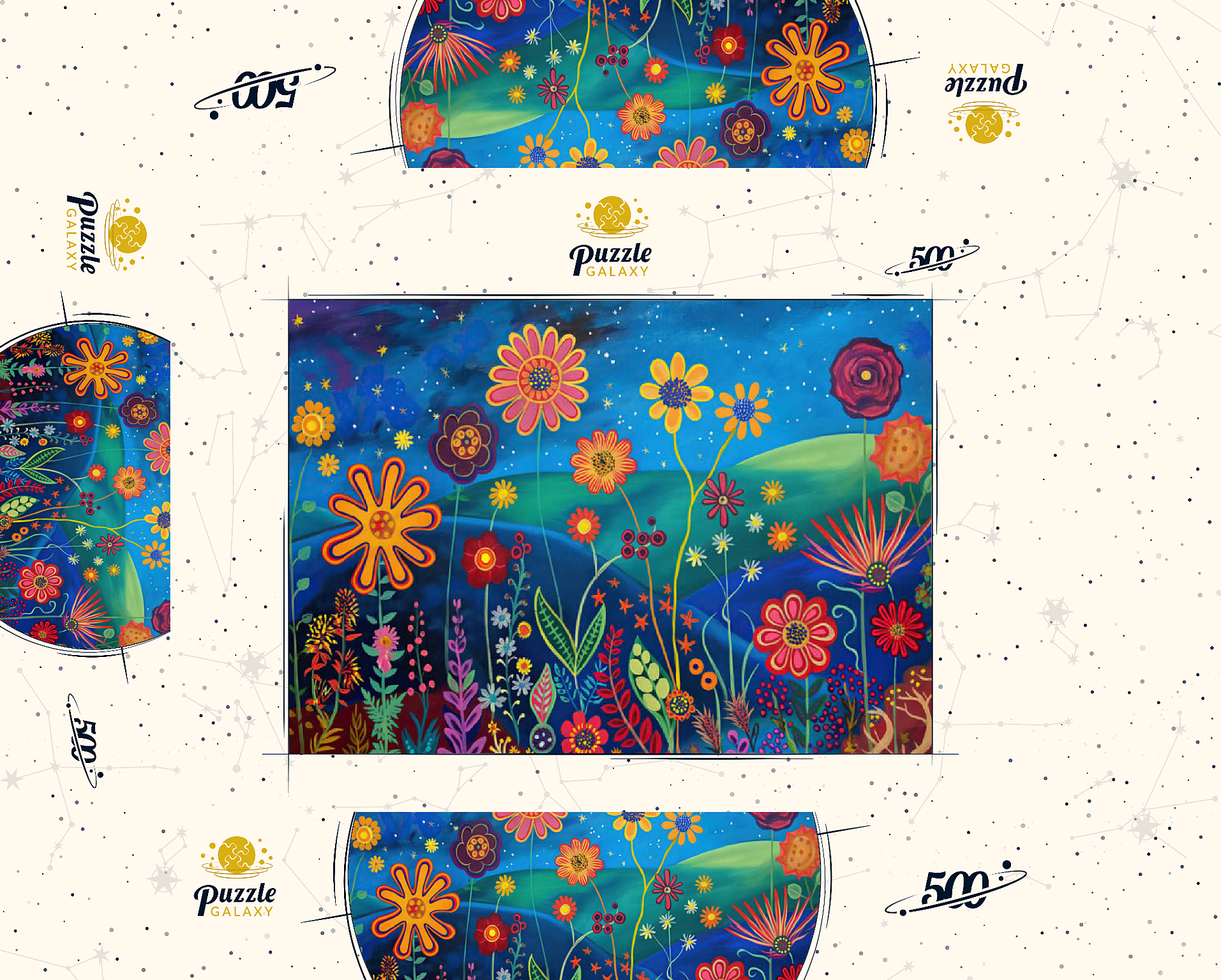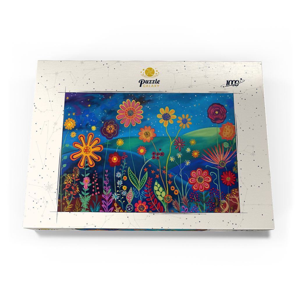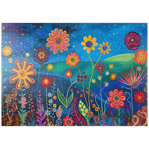 Dieses bezaubernde Kunstwerk zeigt eine skurrile Wiese voller farbenfroher Blumen vor einem sternenklaren Nachthimmel. Jede Blume ist einzigartig mit verschlungenen Mustern verziert und strahlt Charme und Fantasie aus. Die sanften Hügel im Hintergrund verleihen der Szene Tiefe und Ruhe, während die verspielte Anordnung von Blüten und Laub eine bezaubernde Energie ausstrahlt. Der sternenbesprenkelte Himmel verstärkt die traumhafte Qualität und schafft ein perfektes Gleichgewicht zwischen Natur und Fantasie in dieser lebendigen, kreativen Komposition.