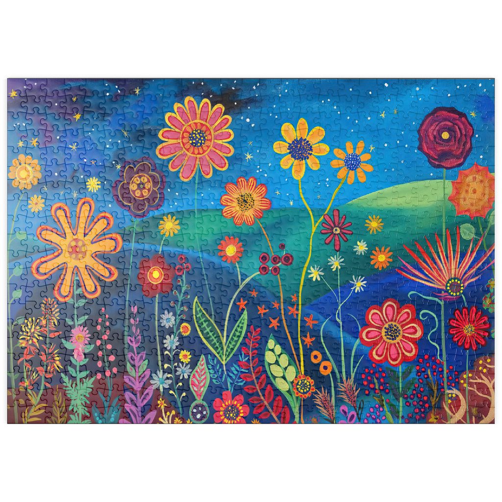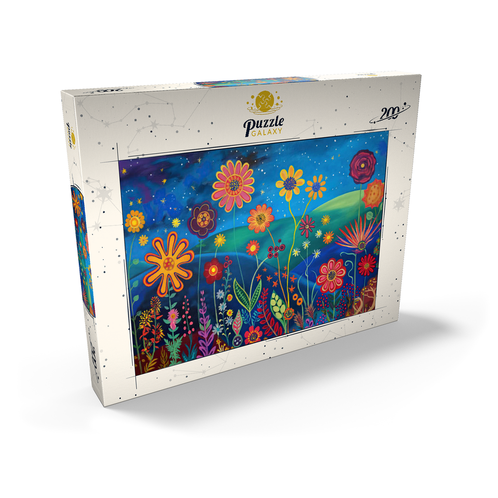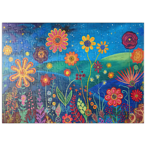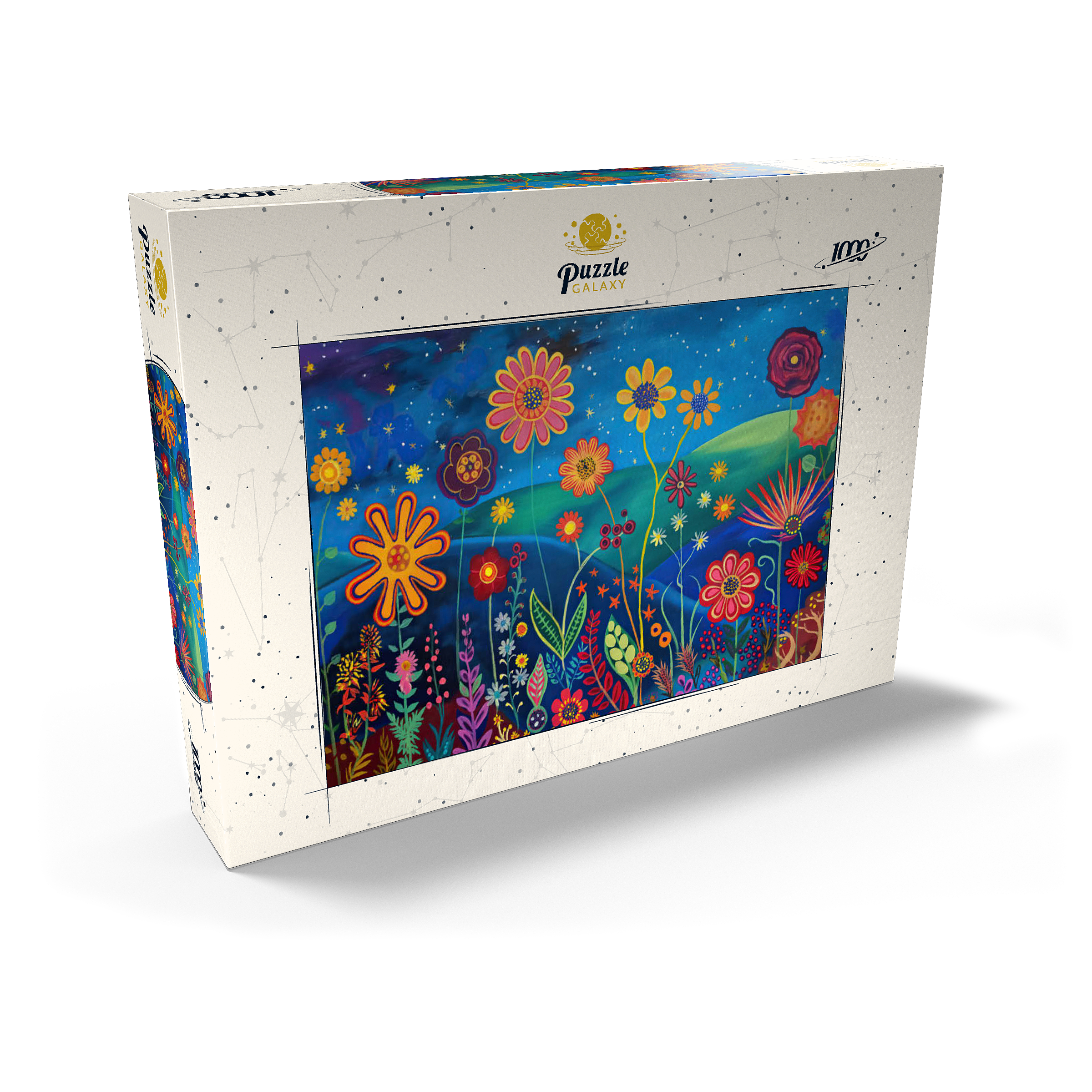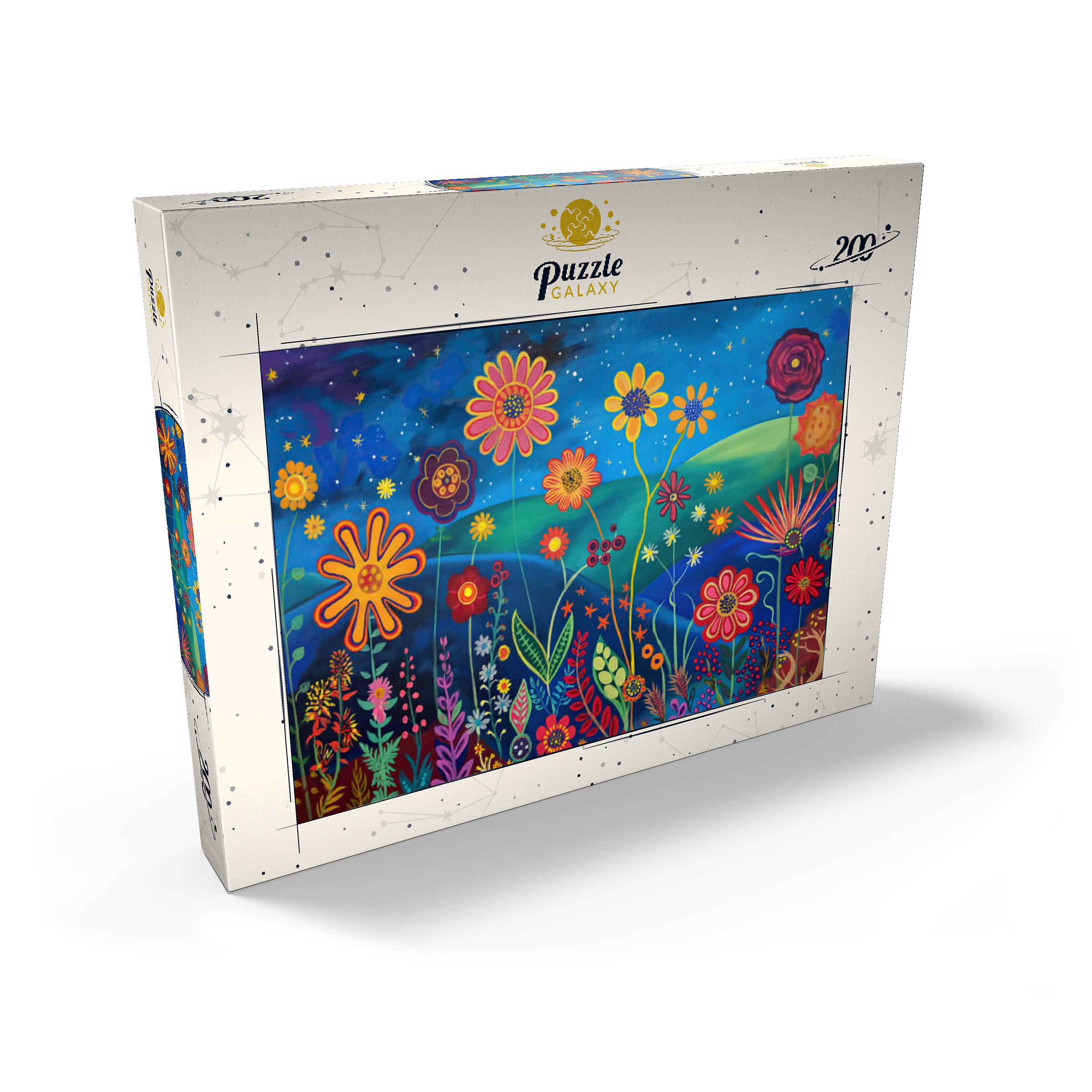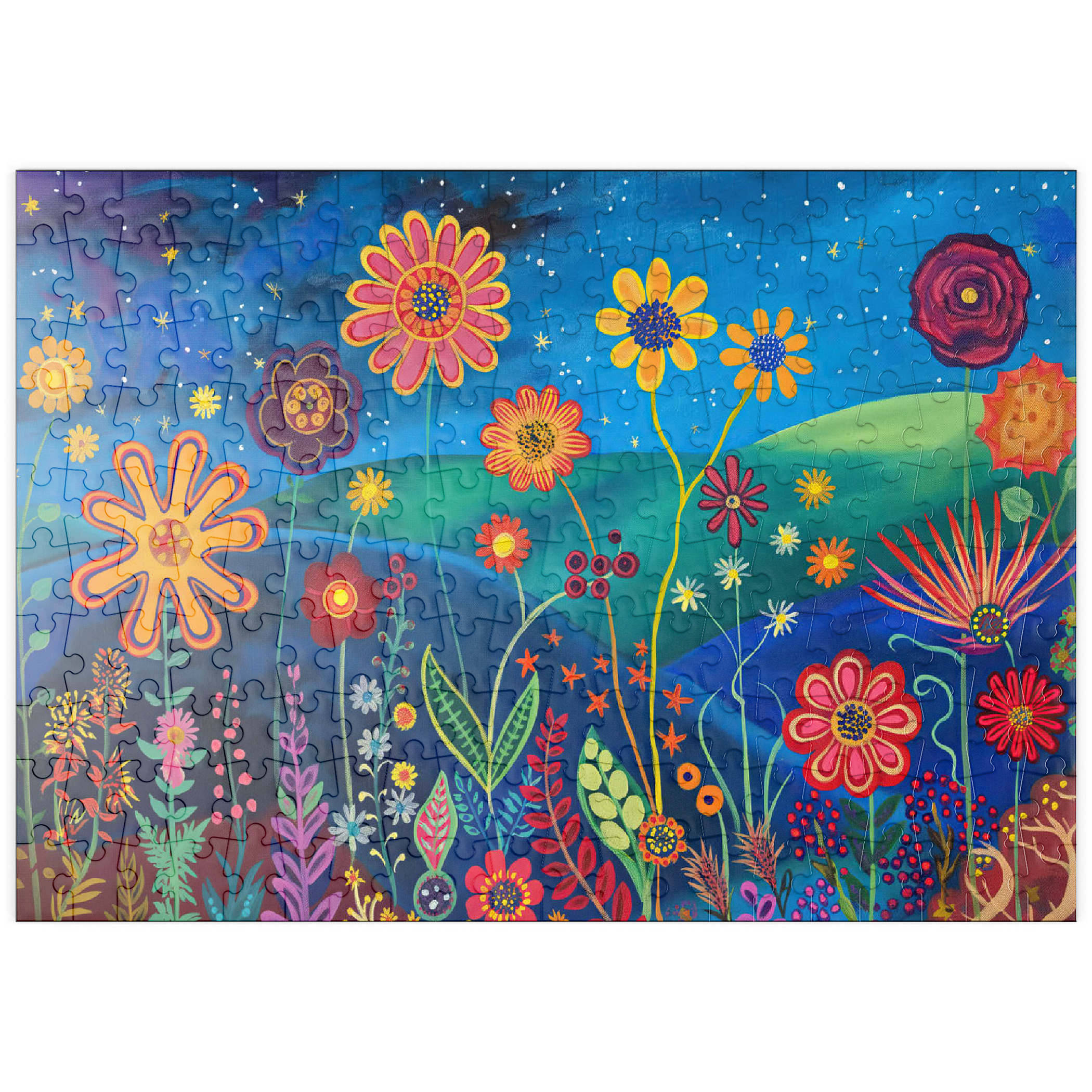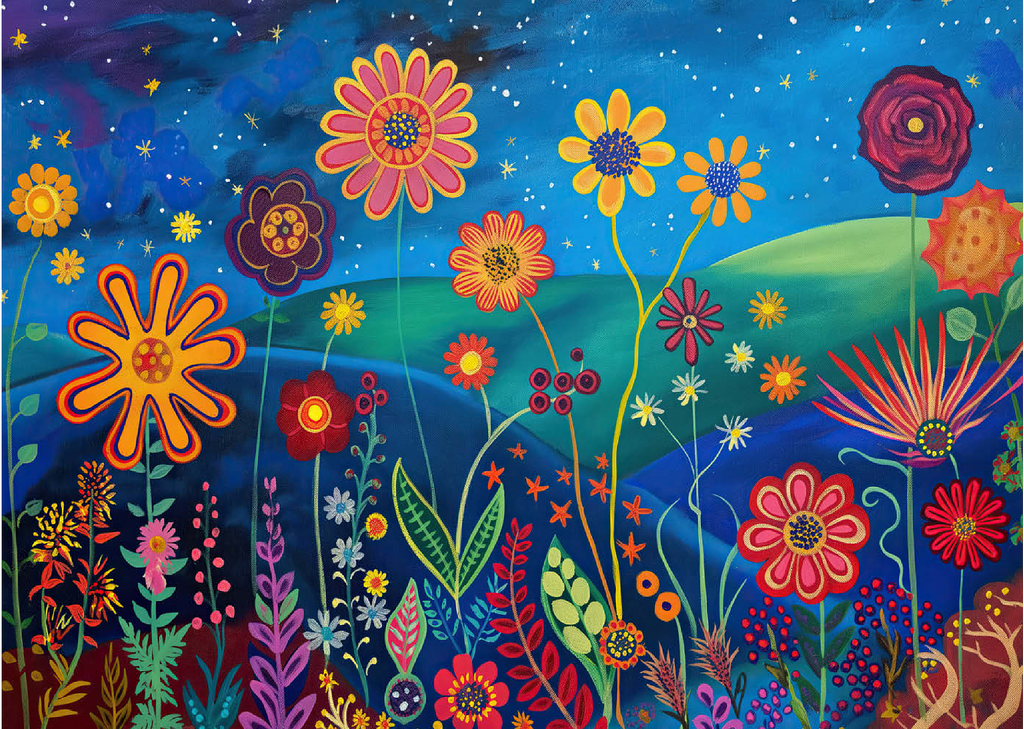 Dieses bezaubernde Kunstwerk zeigt eine skurrile Wiese voller farbenfroher Blumen vor einem sternenklaren Nachthimmel. Jede Blume ist einzigartig mit verschlungenen Mustern verziert und strahlt Charme und Fantasie aus. Die sanften Hügel im Hintergrund verleihen der Szene Tiefe und Ruhe, während die verspielte Anordnung von Blüten und Laub eine bezaubernde Energie ausstrahlt. Der sternenbesprenkelte Himmel verstärkt die traumhafte Qualität und schafft ein perfektes Gleichgewicht zwischen Natur und Fantasie in dieser lebendigen, kreativen Komposition.