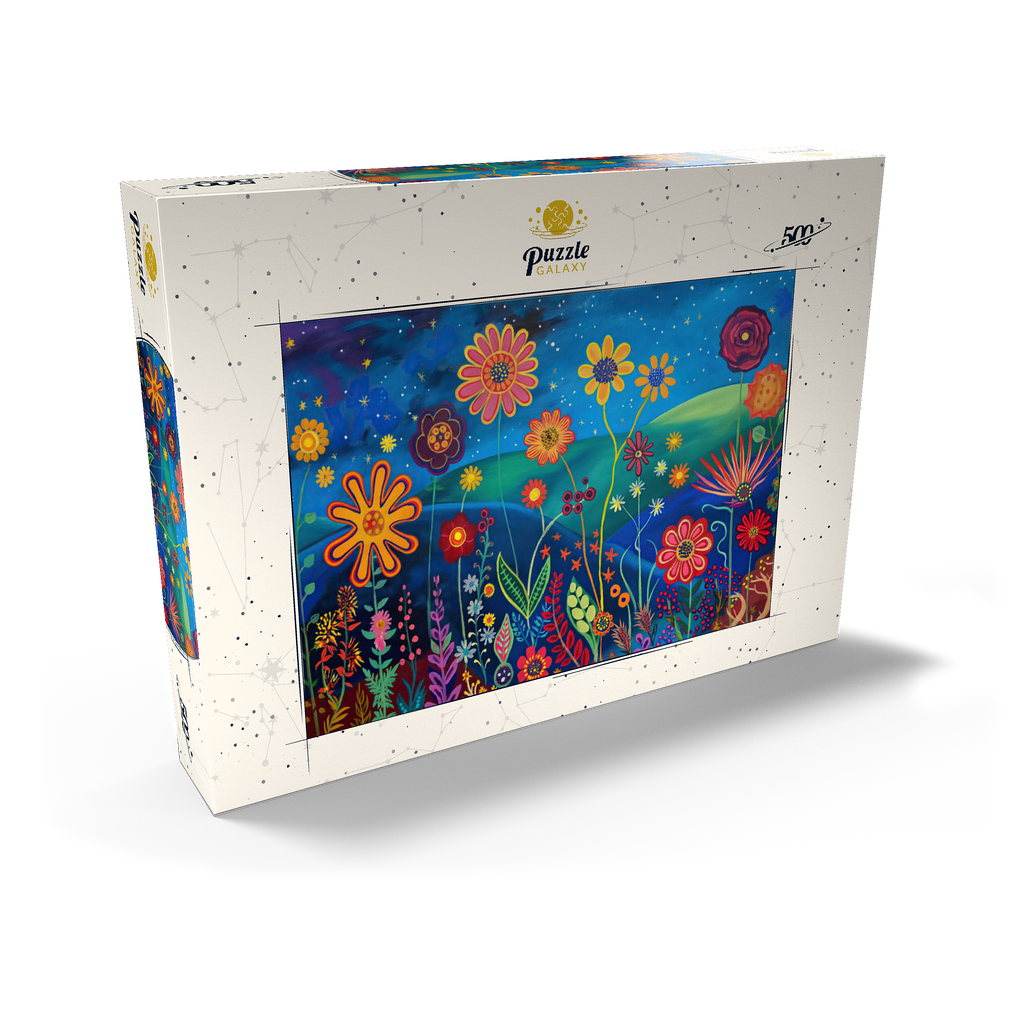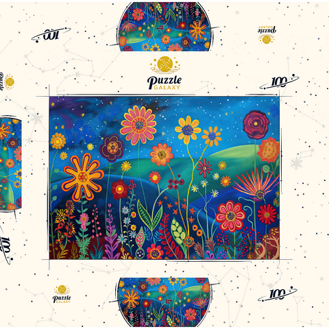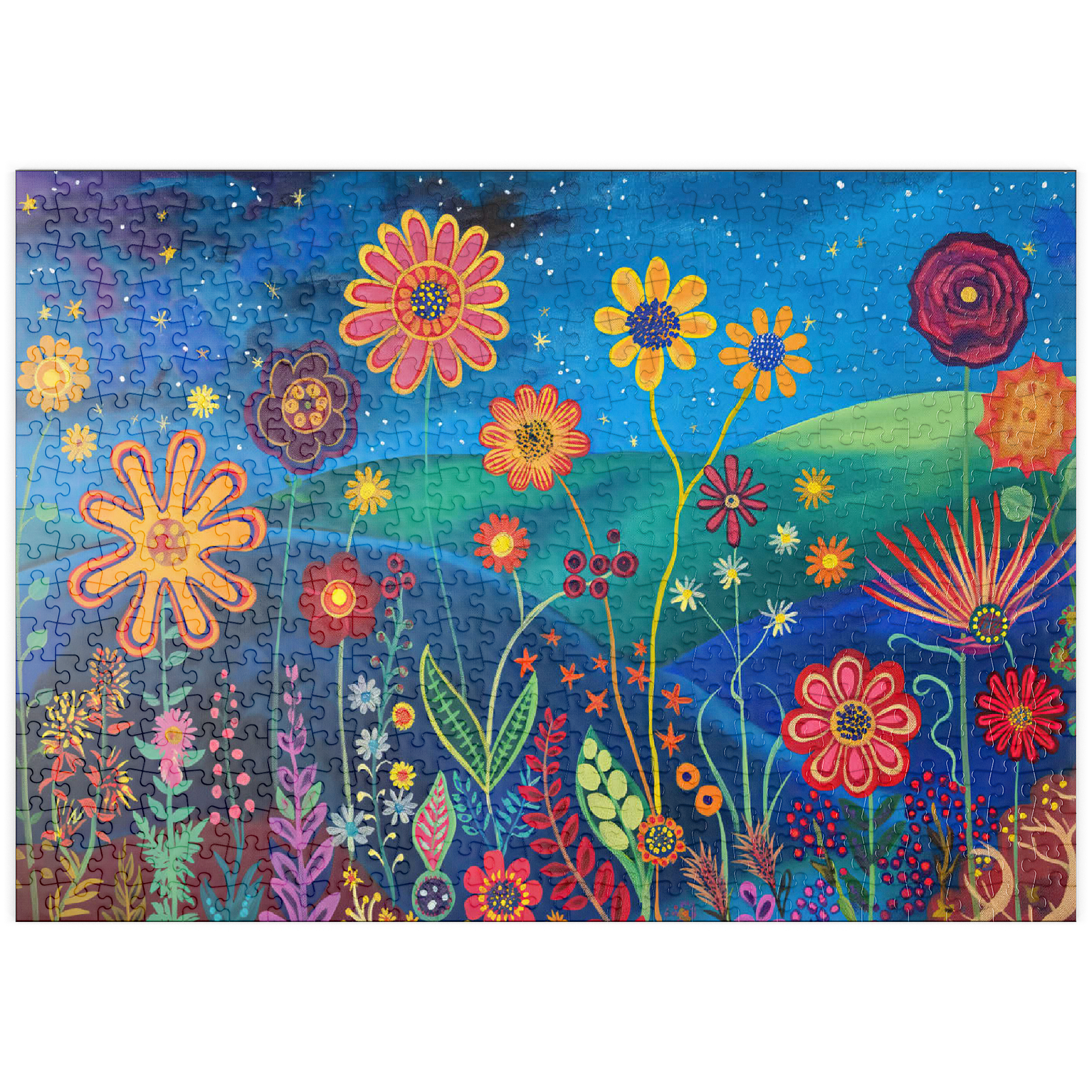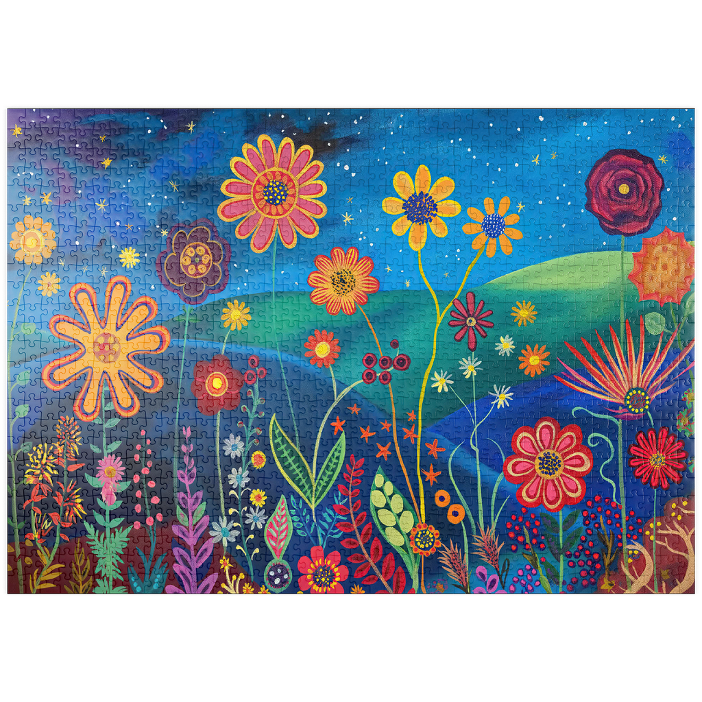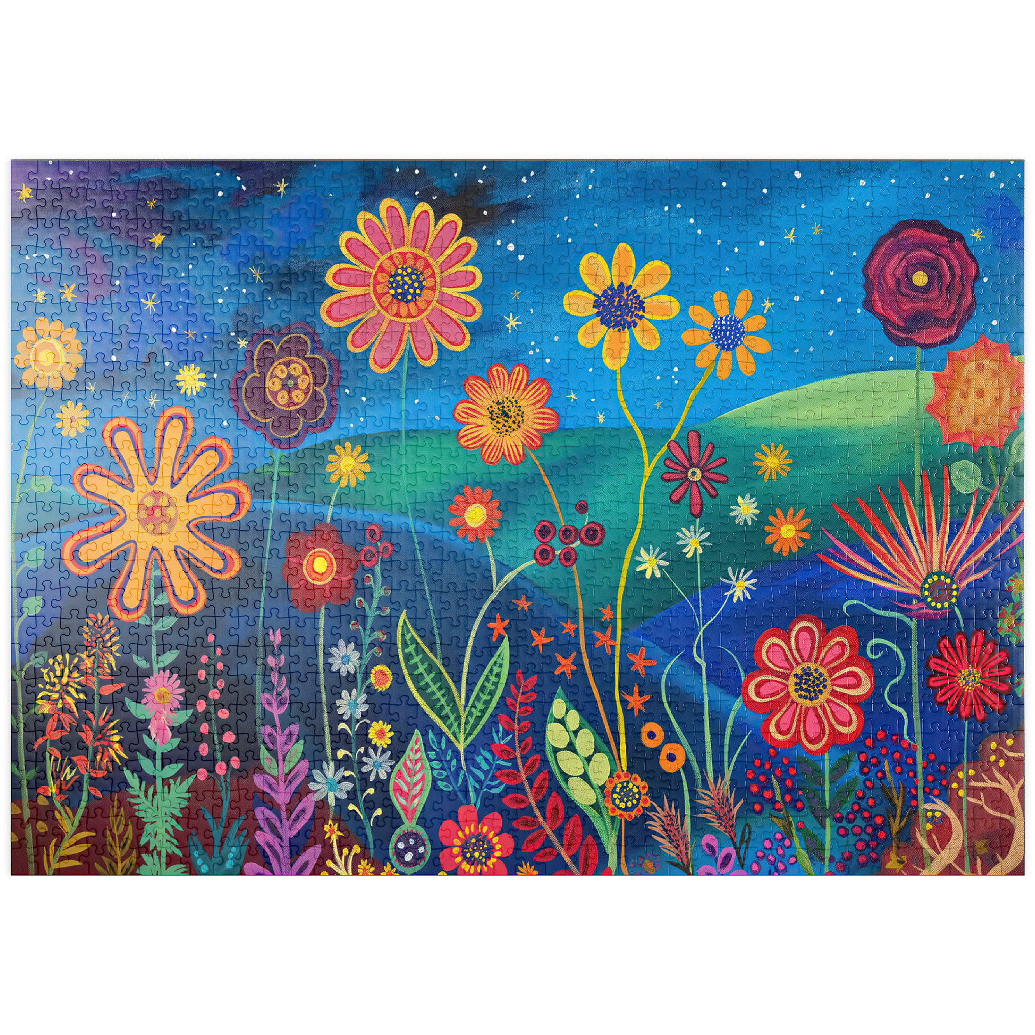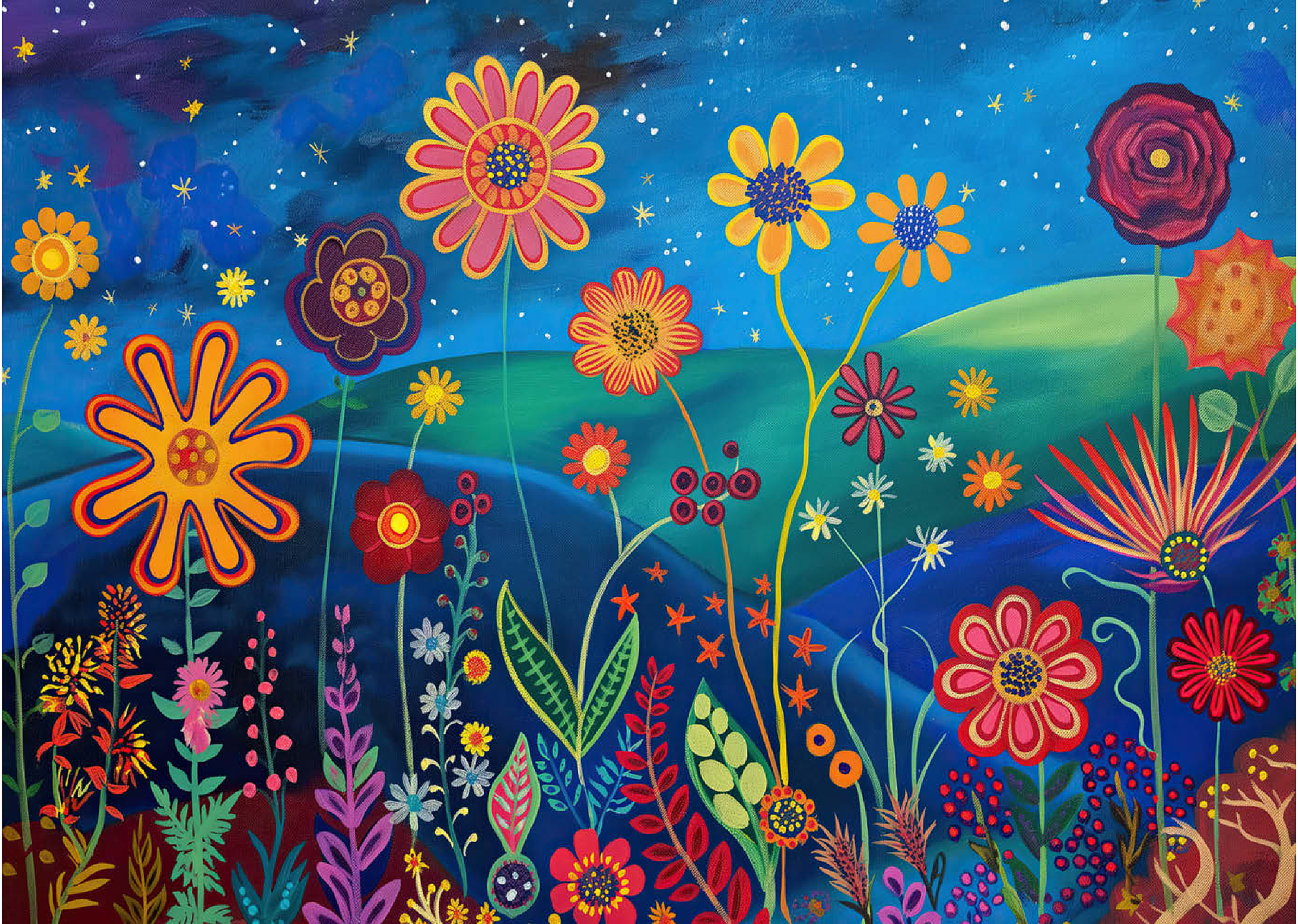 Dieses bezaubernde Kunstwerk zeigt eine skurrile Wiese voller farbenfroher Blumen vor einem sternenklaren Nachthimmel. Jede Blume ist einzigartig mit verschlungenen Mustern verziert und strahlt Charme und Fantasie aus. Die sanften Hügel im Hintergrund verleihen der Szene Tiefe und Ruhe, während die verspielte Anordnung von Blüten und Laub eine bezaubernde Energie ausstrahlt. Der sternenbesprenkelte Himmel verstärkt die traumhafte Qualität und schafft ein perfektes Gleichgewicht zwischen Natur und Fantasie in dieser lebendigen, kreativen Komposition.