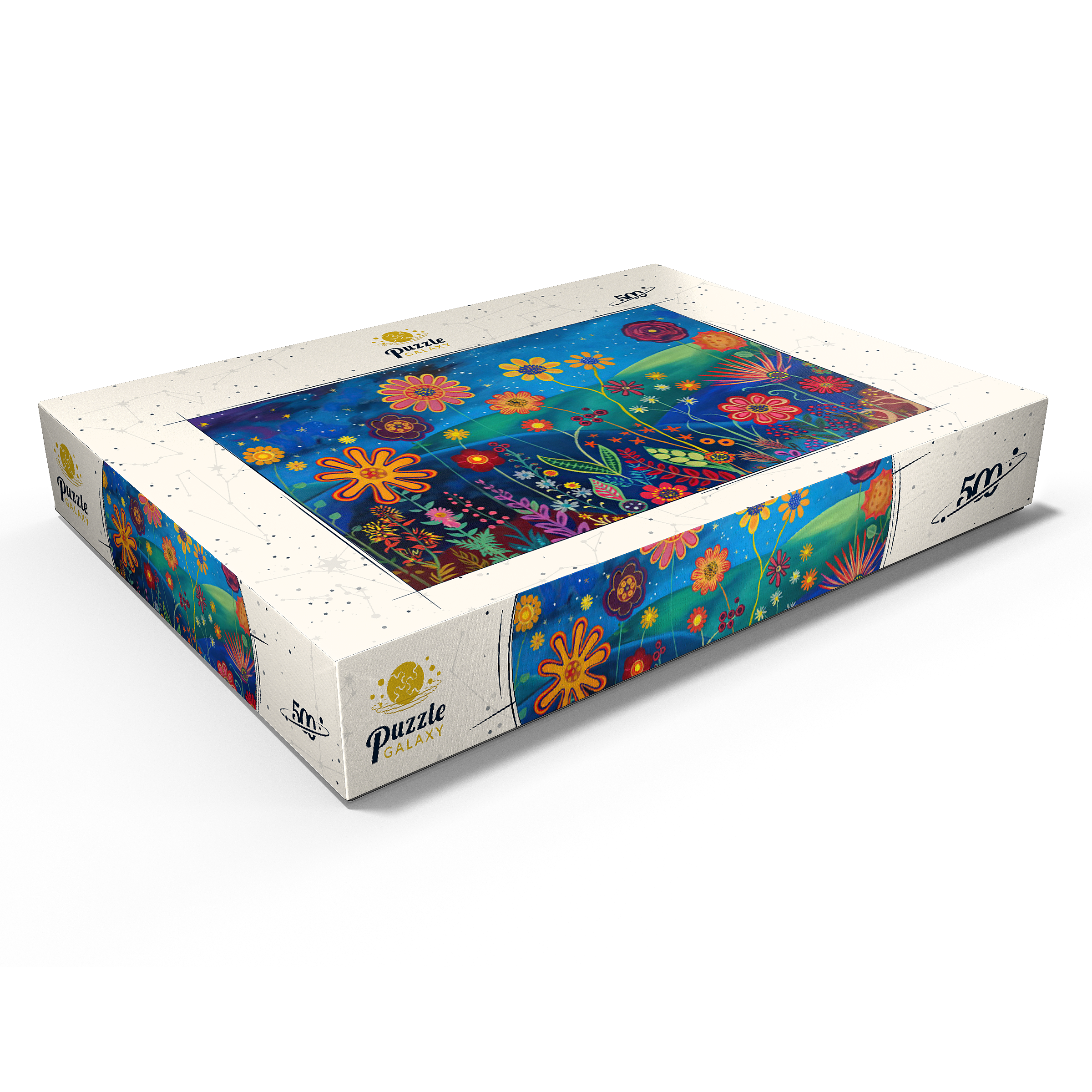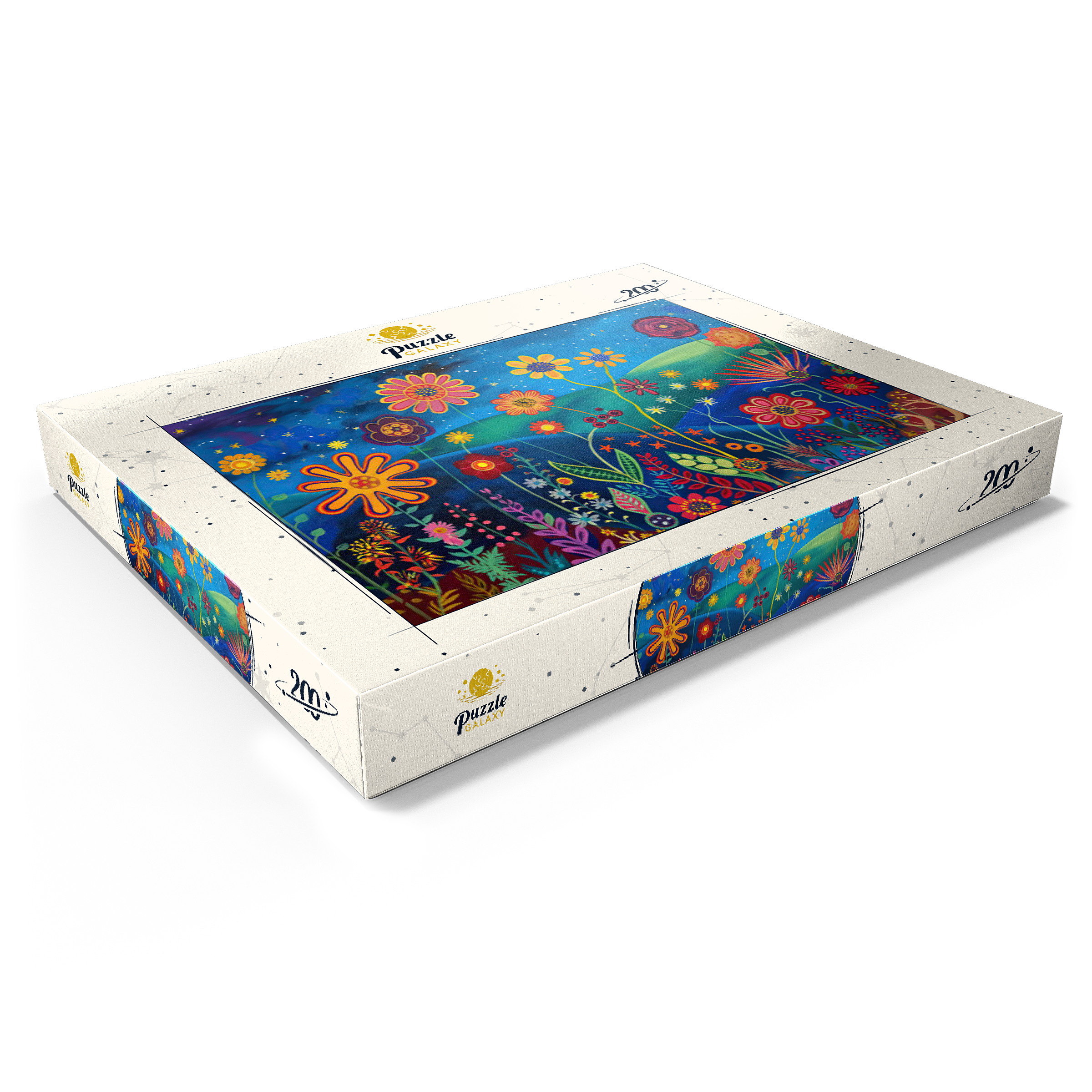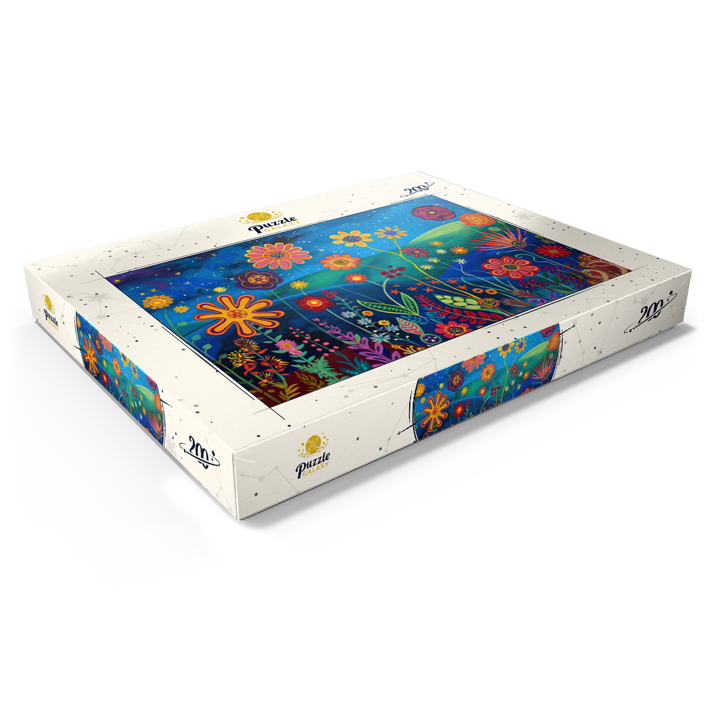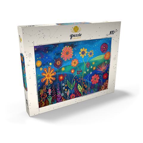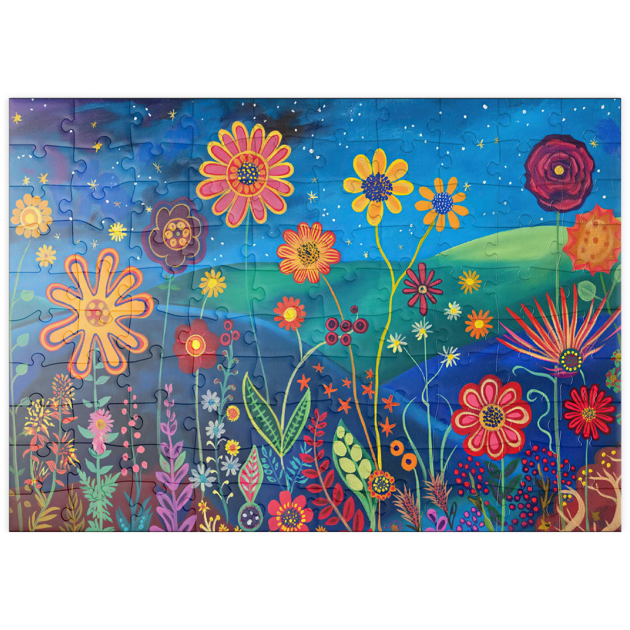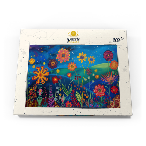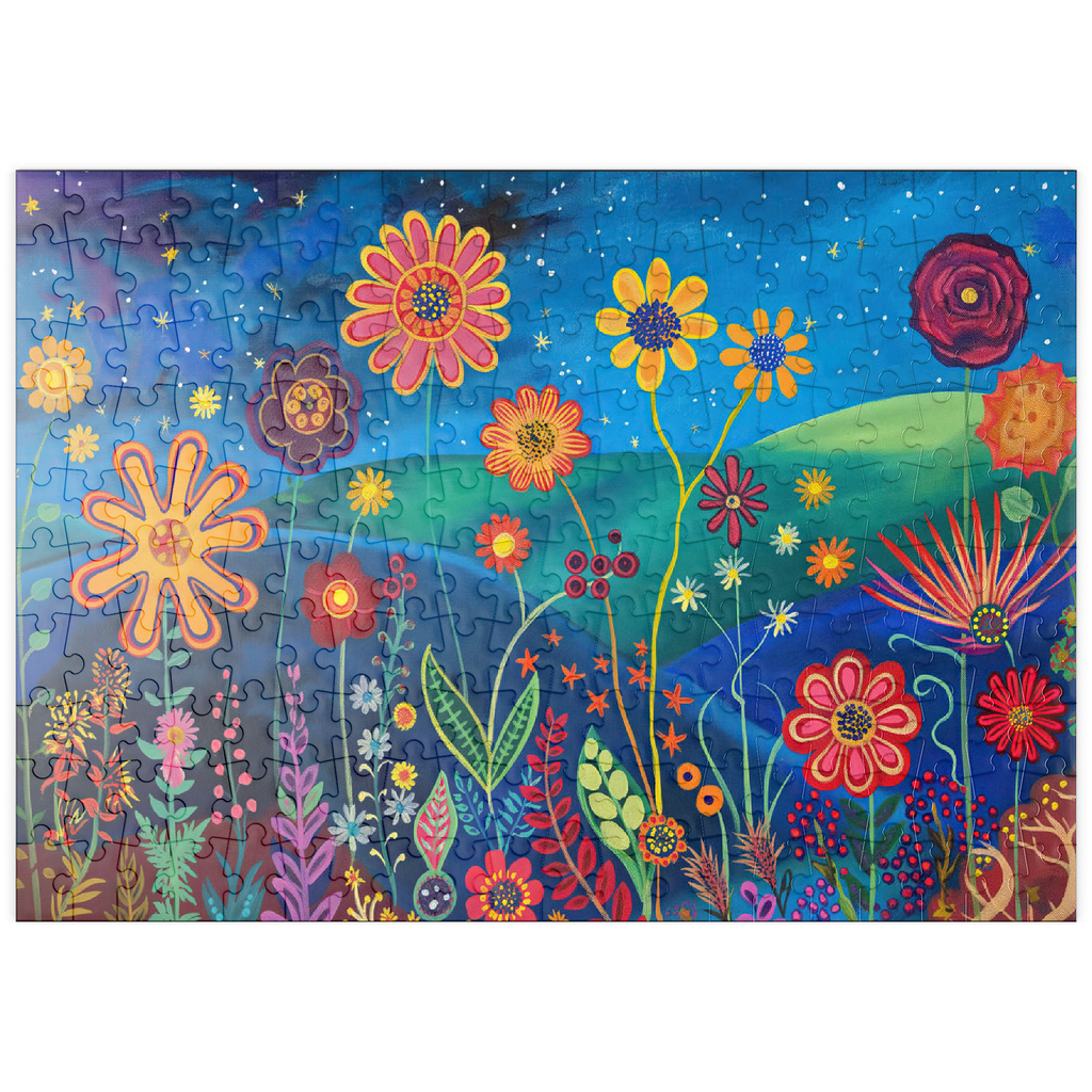 Dieses bezaubernde Kunstwerk zeigt eine skurrile Wiese voller farbenfroher Blumen vor einem sternenklaren Nachthimmel. Jede Blume ist einzigartig mit verschlungenen Mustern verziert und strahlt Charme und Fantasie aus. Die sanften Hügel im Hintergrund verleihen der Szene Tiefe und Ruhe, während die verspielte Anordnung von Blüten und Laub eine bezaubernde Energie ausstrahlt. Der sternenbesprenkelte Himmel verstärkt die traumhafte Qualität und schafft ein perfektes Gleichgewicht zwischen Natur und Fantasie in dieser lebendigen, kreativen Komposition.