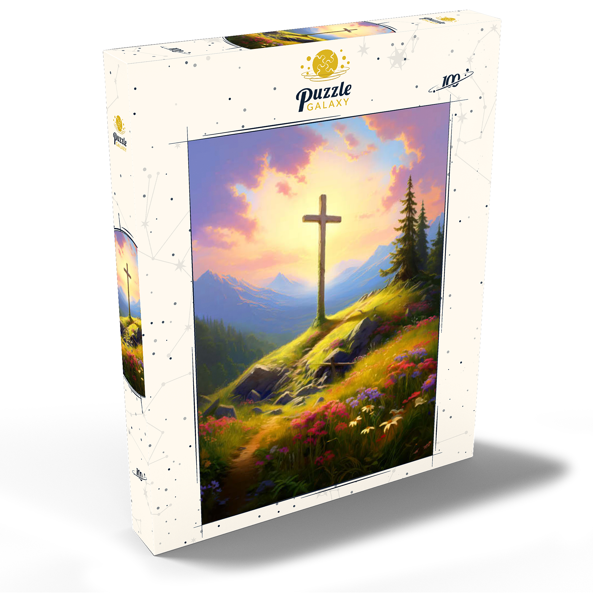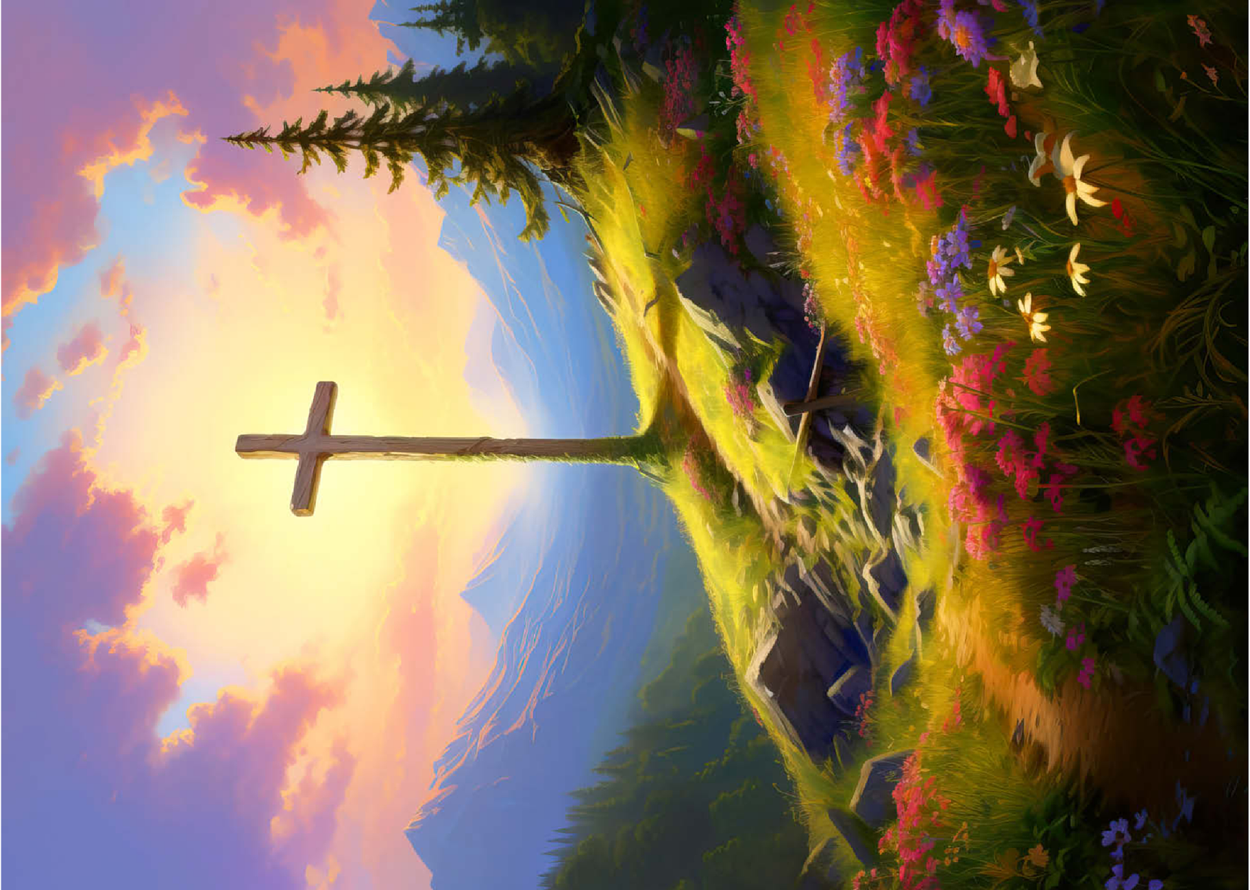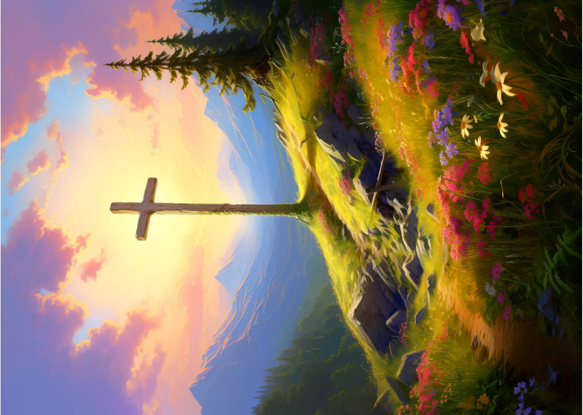Eine heitere Berggipfel-Szene mit einem Holzkreuz, das hoch auf einem grasbewachsenen Hügel steht und in warmes Sonnenlicht getaucht ist. Im Vordergrund blühen farbenfrohe Wildblumen, während ein gewundener Pfad zum Kreuz führt. Hoch aufragende Berge und ein lebendiger, goldener Himmel mit weichen, leuchtenden Wolken vermitteln ein Gefühl von Frieden und Ehrfurcht. Diese atemberaubende Landschaft fängt die Harmonie von Natur und Spiritualität ein.