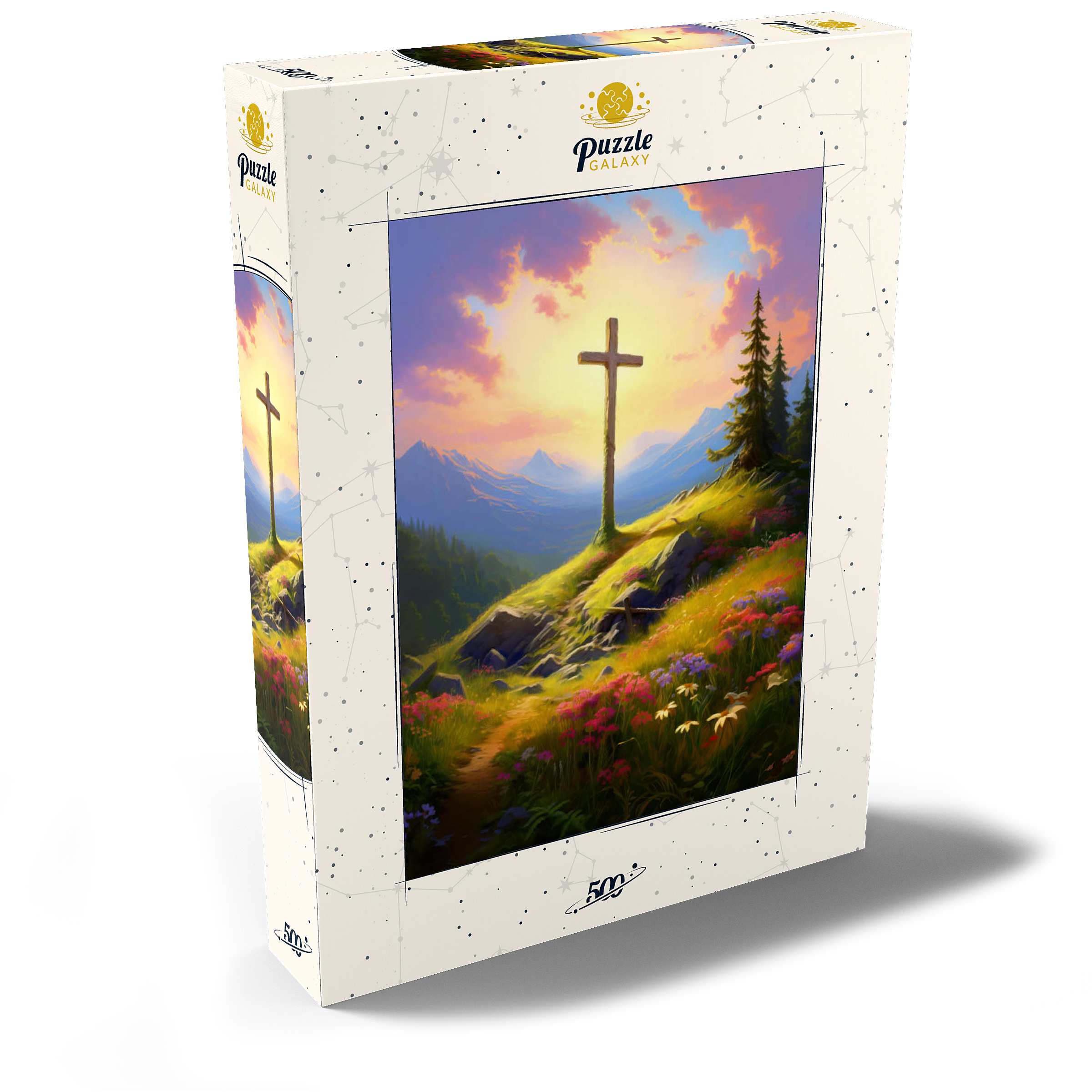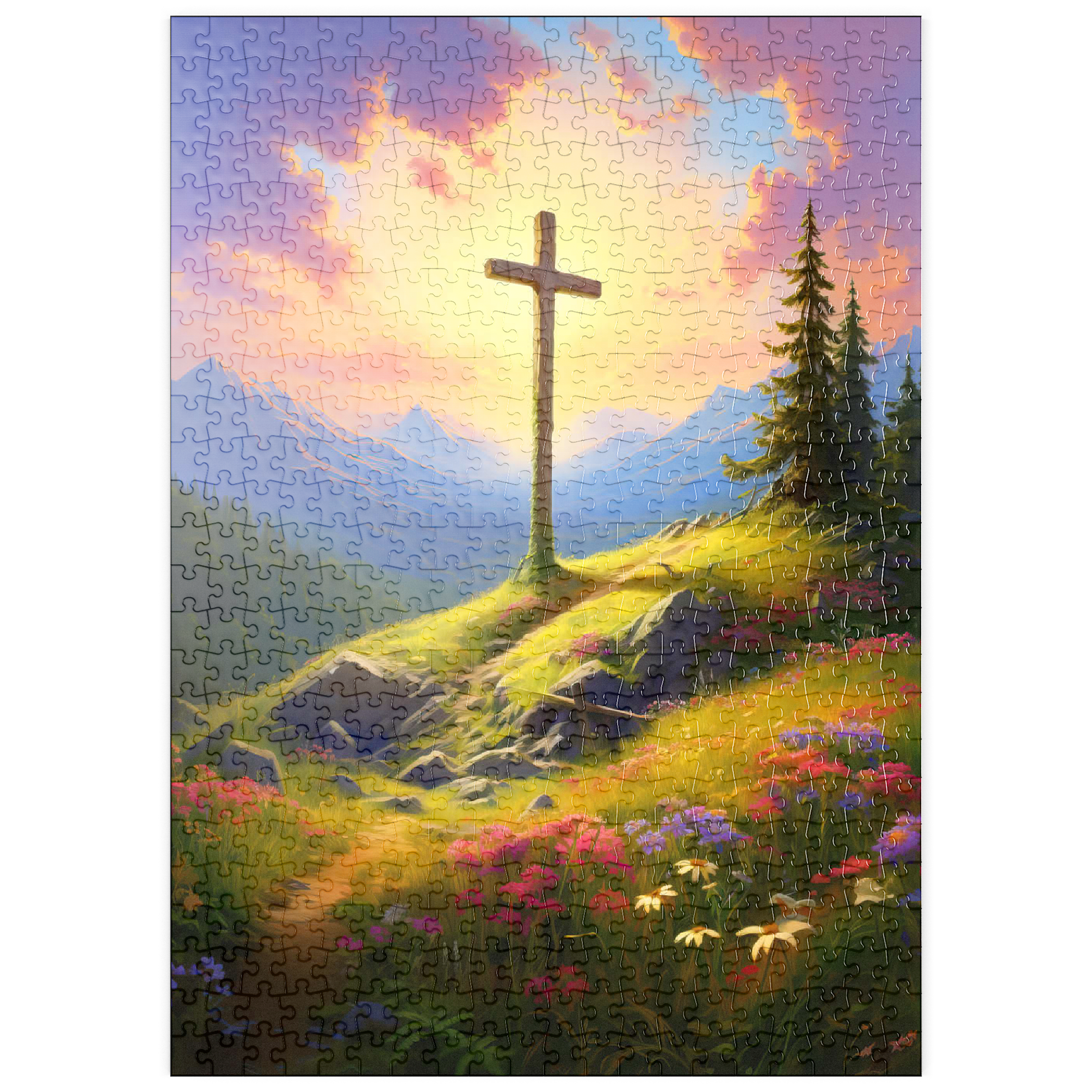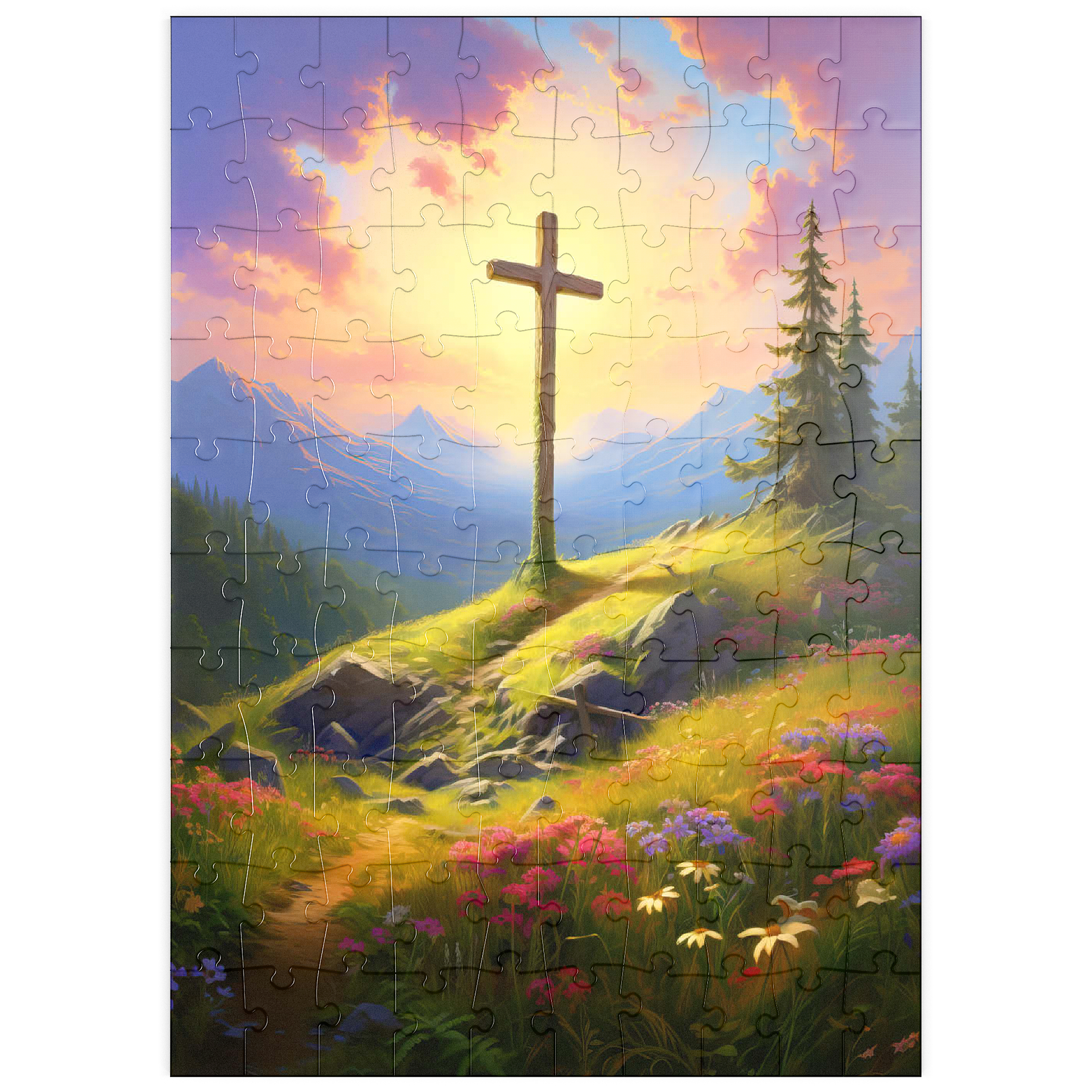 Eine heitere Berggipfel-Szene mit einem Holzkreuz, das hoch auf einem grasbewachsenen Hügel steht und in warmes Sonnenlicht getaucht ist. Im Vordergrund blühen farbenfrohe Wildblumen, während ein gewundener Pfad zum Kreuz führt. Hoch aufragende Berge und ein lebendiger, goldener Himmel mit weichen, leuchtenden Wolken vermitteln ein Gefühl von Frieden und Ehrfurcht. Diese atemberaubende Landschaft fängt die Harmonie von Natur und Spiritualität ein.