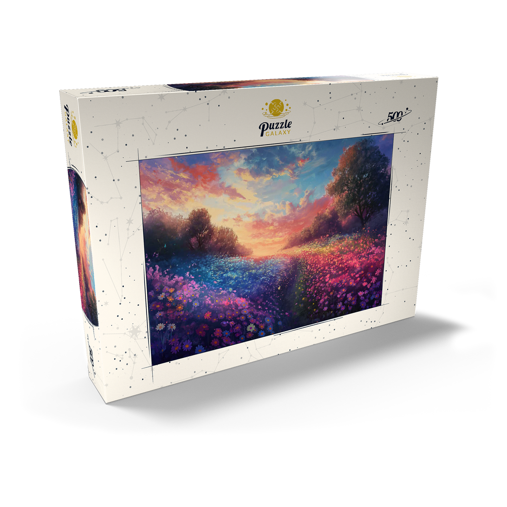 Eine faszinierende Szene einer blühenden Wiese, die sich im warmen Schein eines lebhaften Sonnenuntergangs sonnt. Der Himmel ist in leuchtenden Rosa-, Orange- und Violetttönen gehalten und geht nahtlos in die farbenfrohe Wildblumenpracht darunter über. Das üppige Feld dehnt sich endlos aus, eingerahmt von sanft schemenhaften Bäumen, die der traumhaften Landschaft Tiefe verleihen. Diese idyllische Umgebung fängt die ruhige Schönheit der Natur in ihrem magischsten Moment ein, in dem Licht und Farbe in perfekter Harmonie aufeinandertreffen.