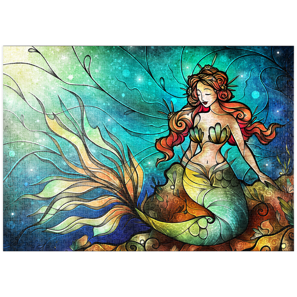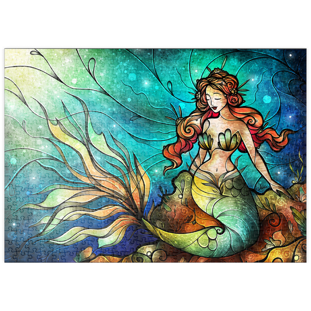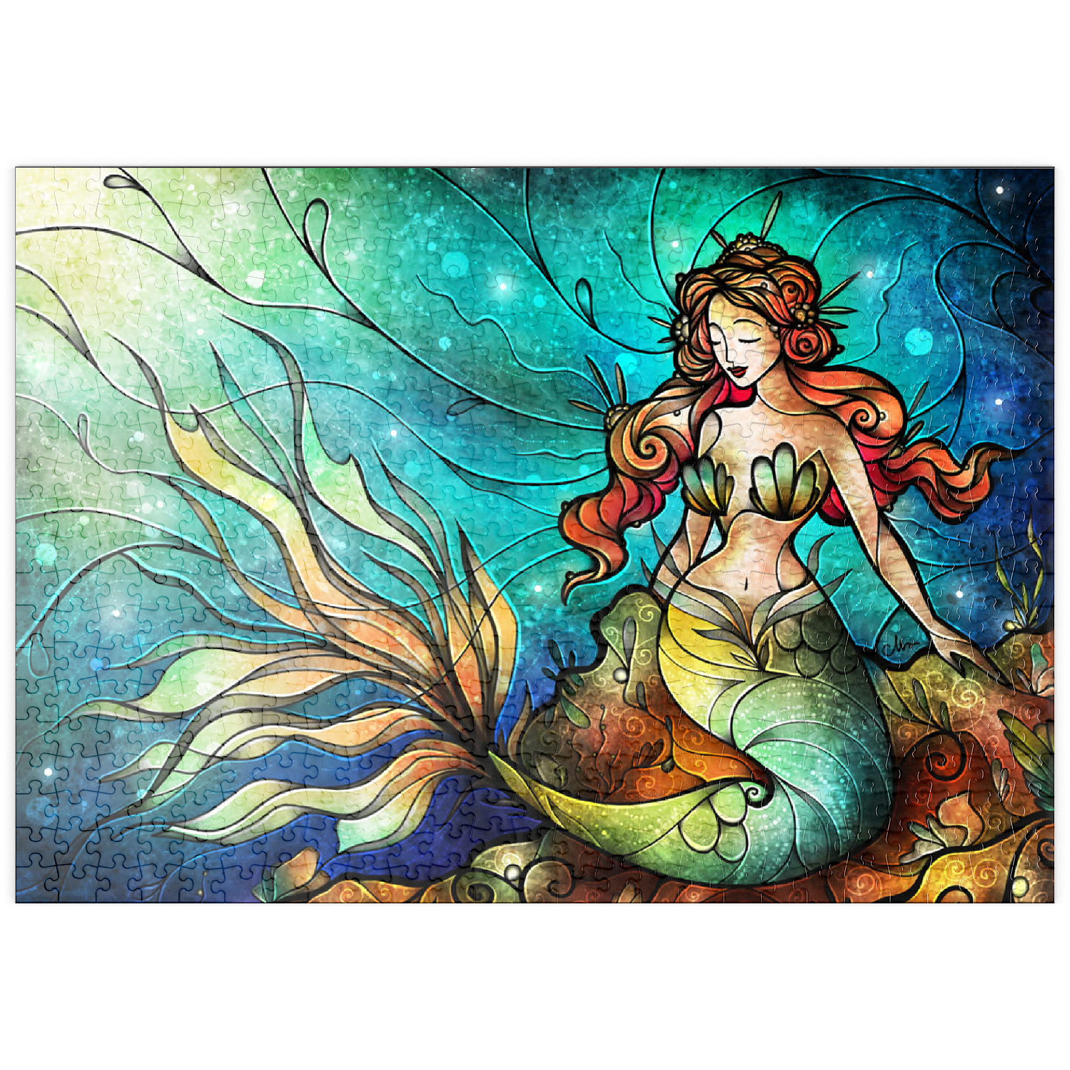 Tauchen Sie ein in die friedliche Schönheit dieser ruhigen Meerjungfrau. Mit wallendem rotbraunem Haar und einem sanften Ausdruck ruht sie auf einem bunten Korallenriff inmitten von wirbelnden türkisfarbenen Wellen und fleckigem Sonnenlicht. Ihr schimmernder grün-goldener Schwanz fächert sich anmutig auf. Setzen Sie diese ruhige Szene der Unterwasseridylle zusammen.