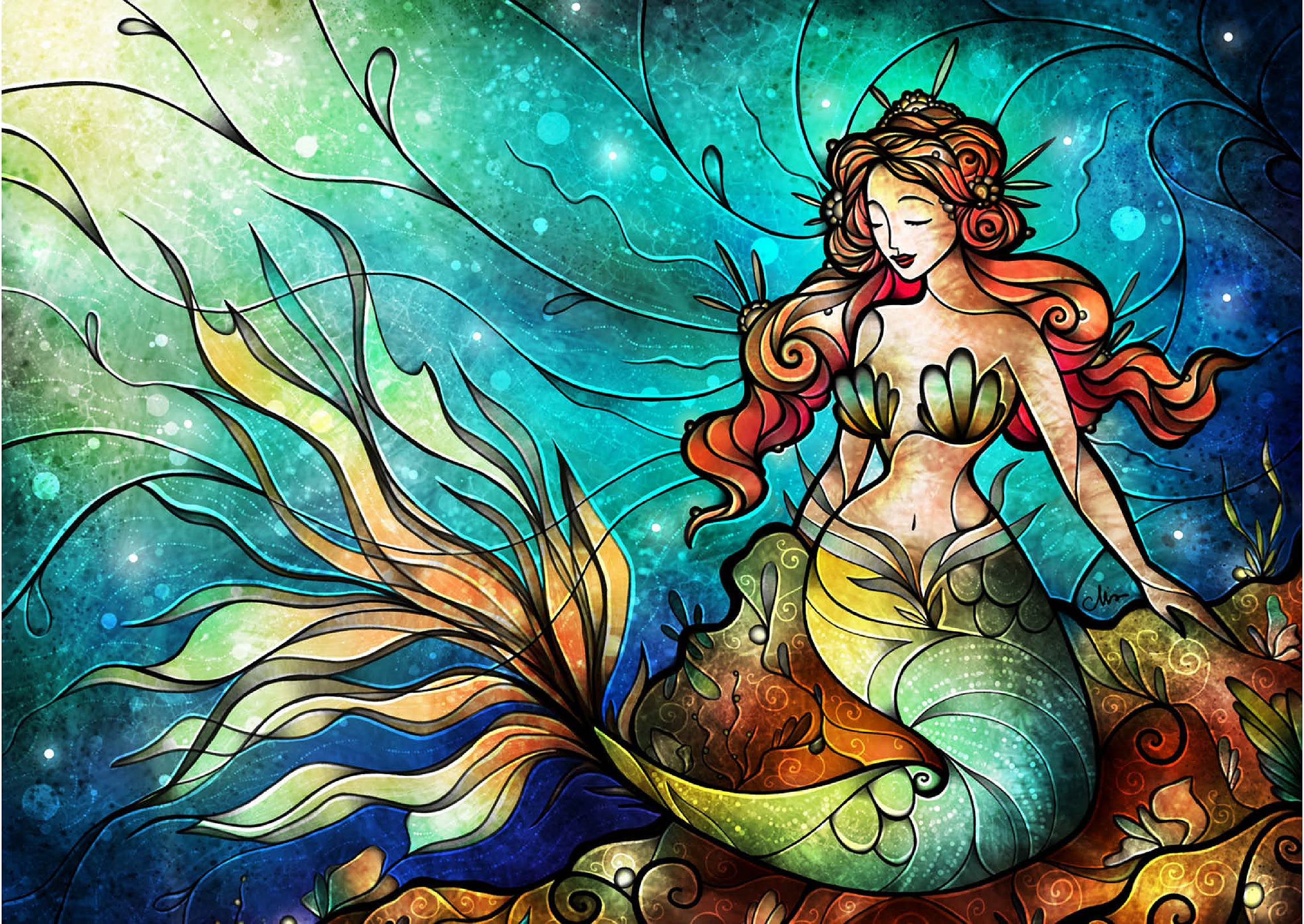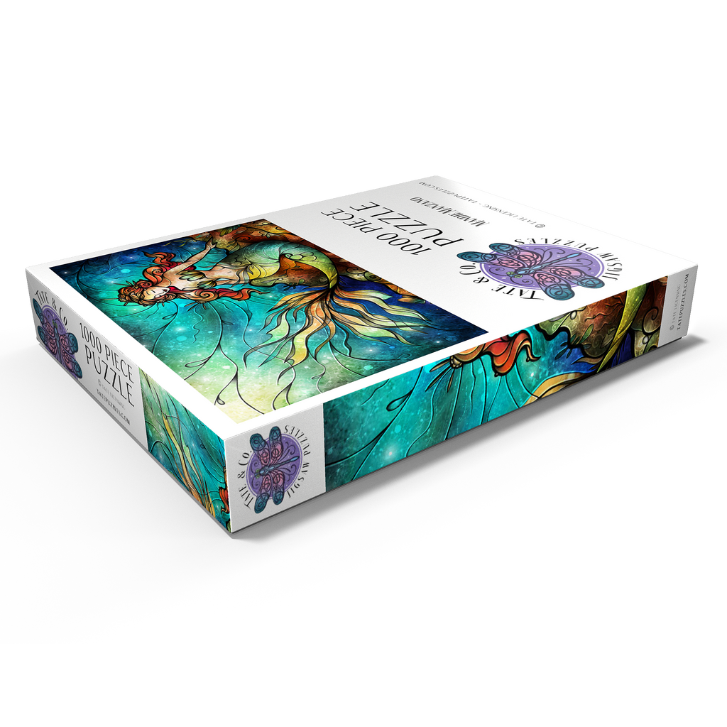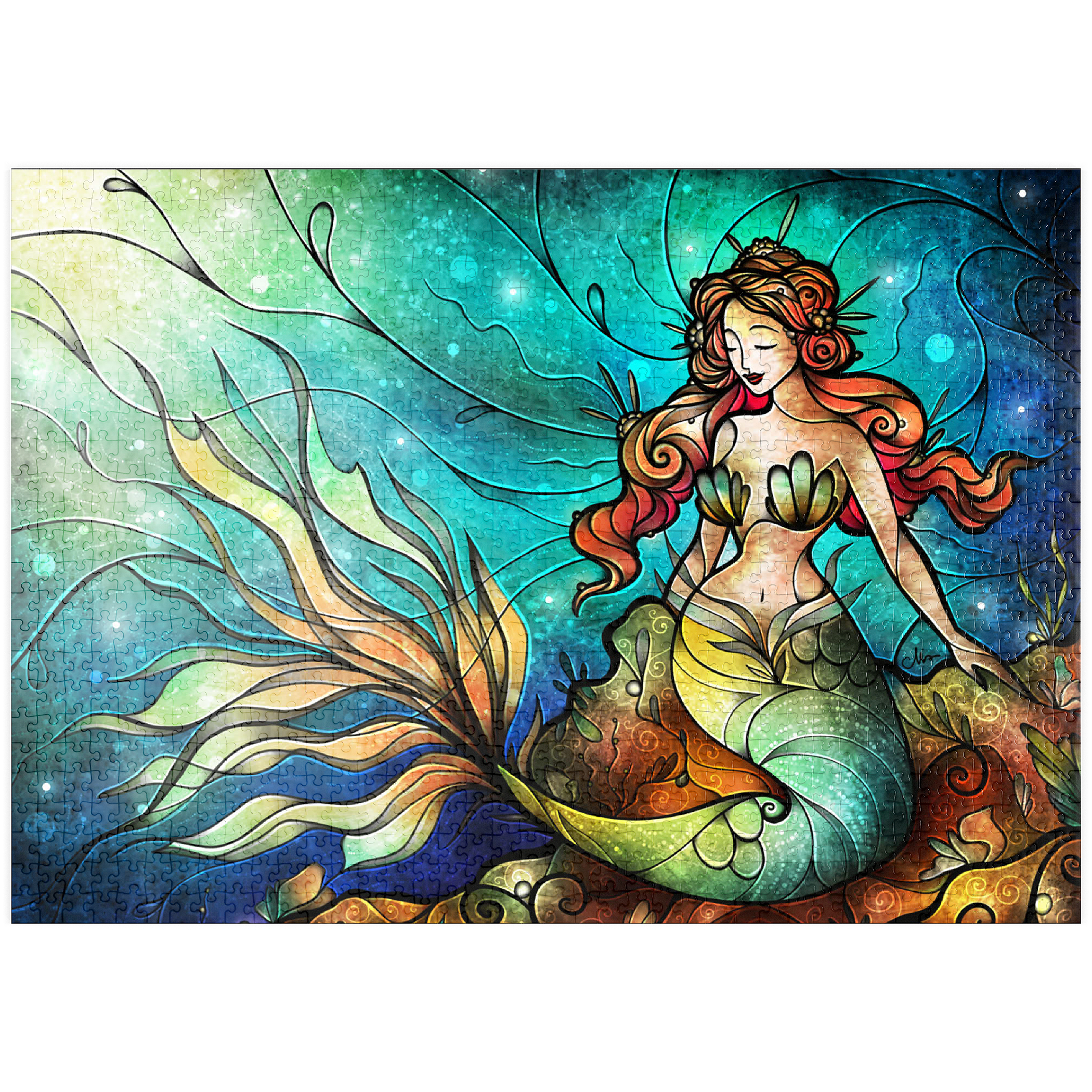 Tauchen Sie ein in die friedliche Schönheit dieser ruhigen Meerjungfrau. Mit wallendem rotbraunem Haar und einem sanften Ausdruck ruht sie auf einem bunten Korallenriff inmitten von wirbelnden türkisfarbenen Wellen und fleckigem Sonnenlicht. Ihr schimmernder grün-goldener Schwanz fächert sich anmutig auf. Setzen Sie diese ruhige Szene der Unterwasseridylle zusammen.