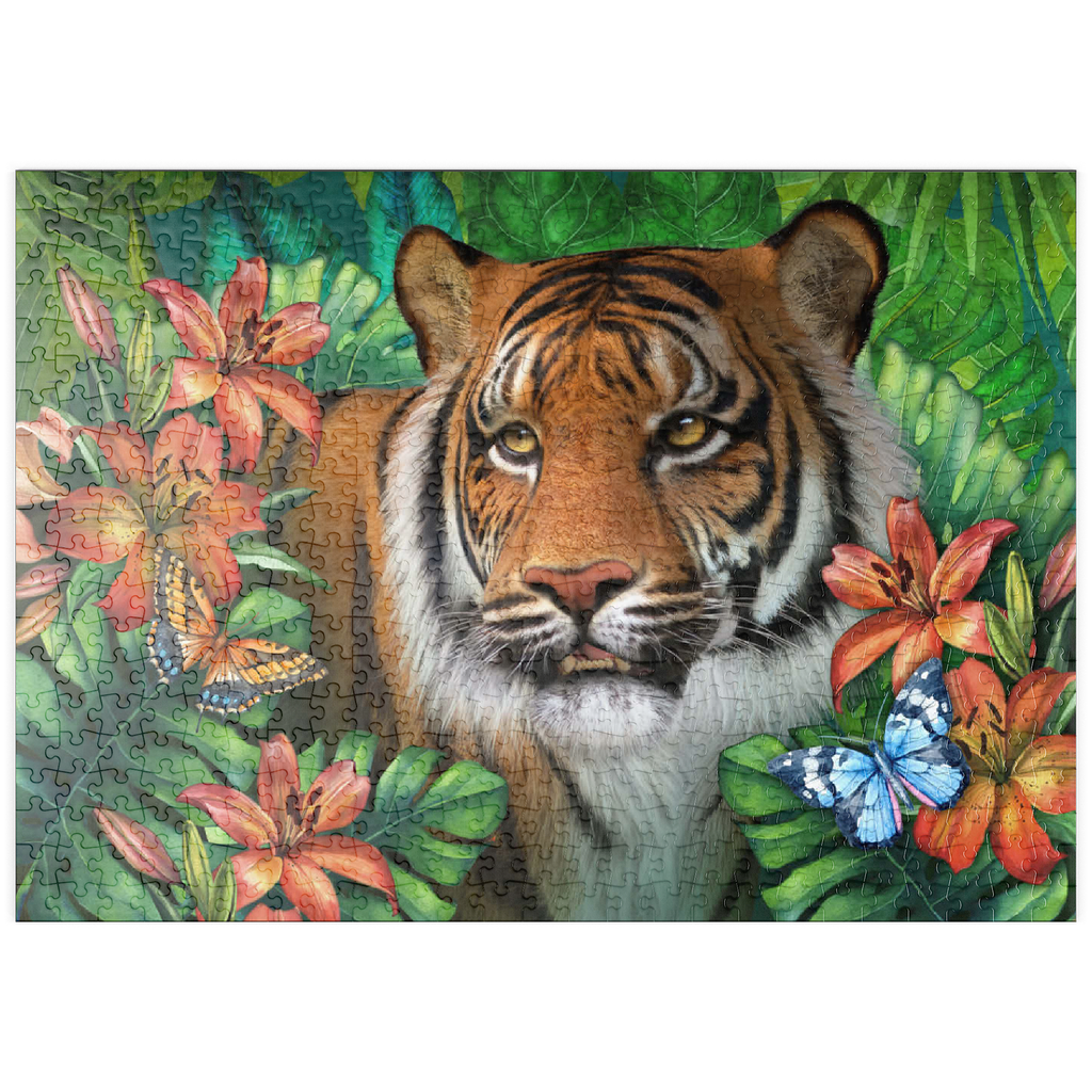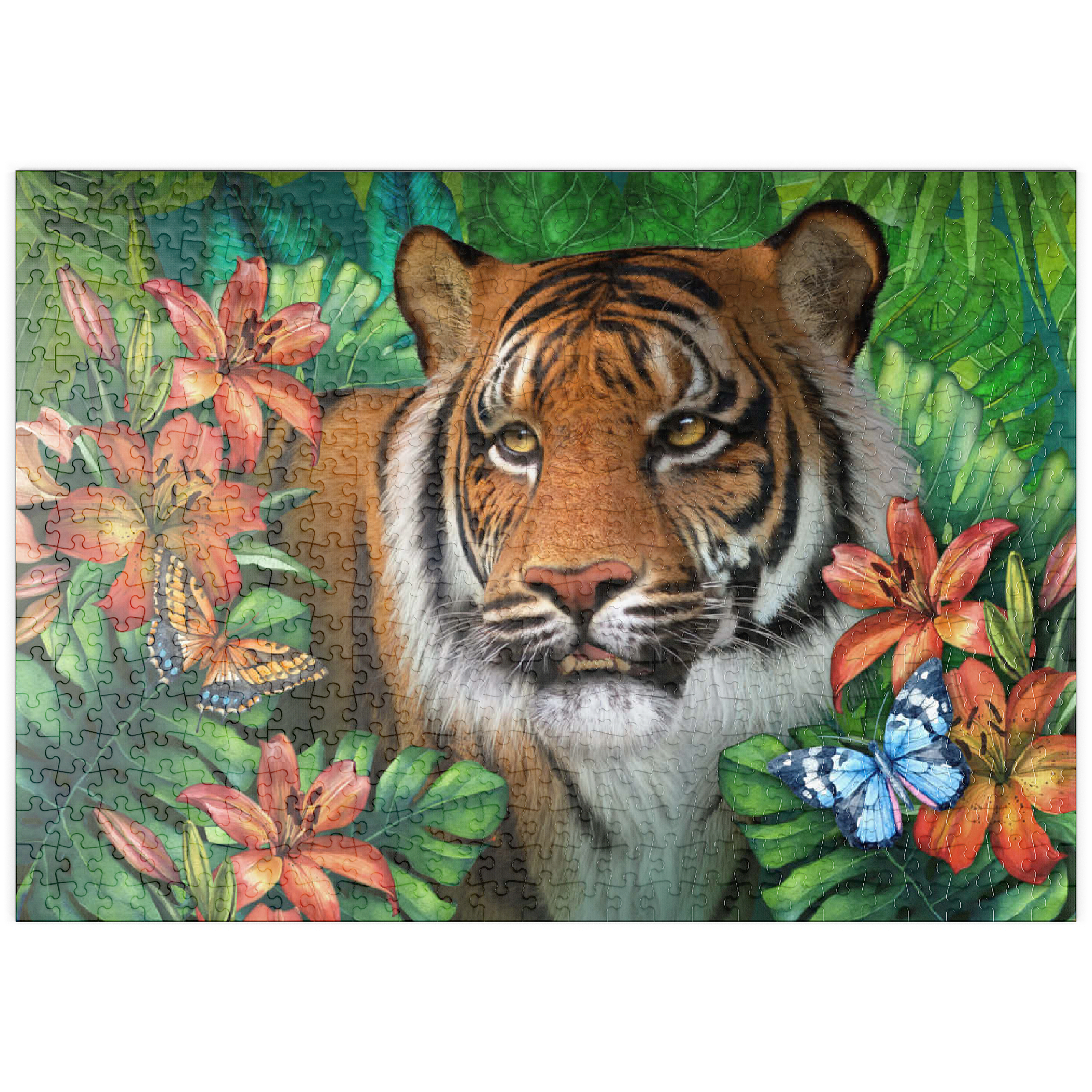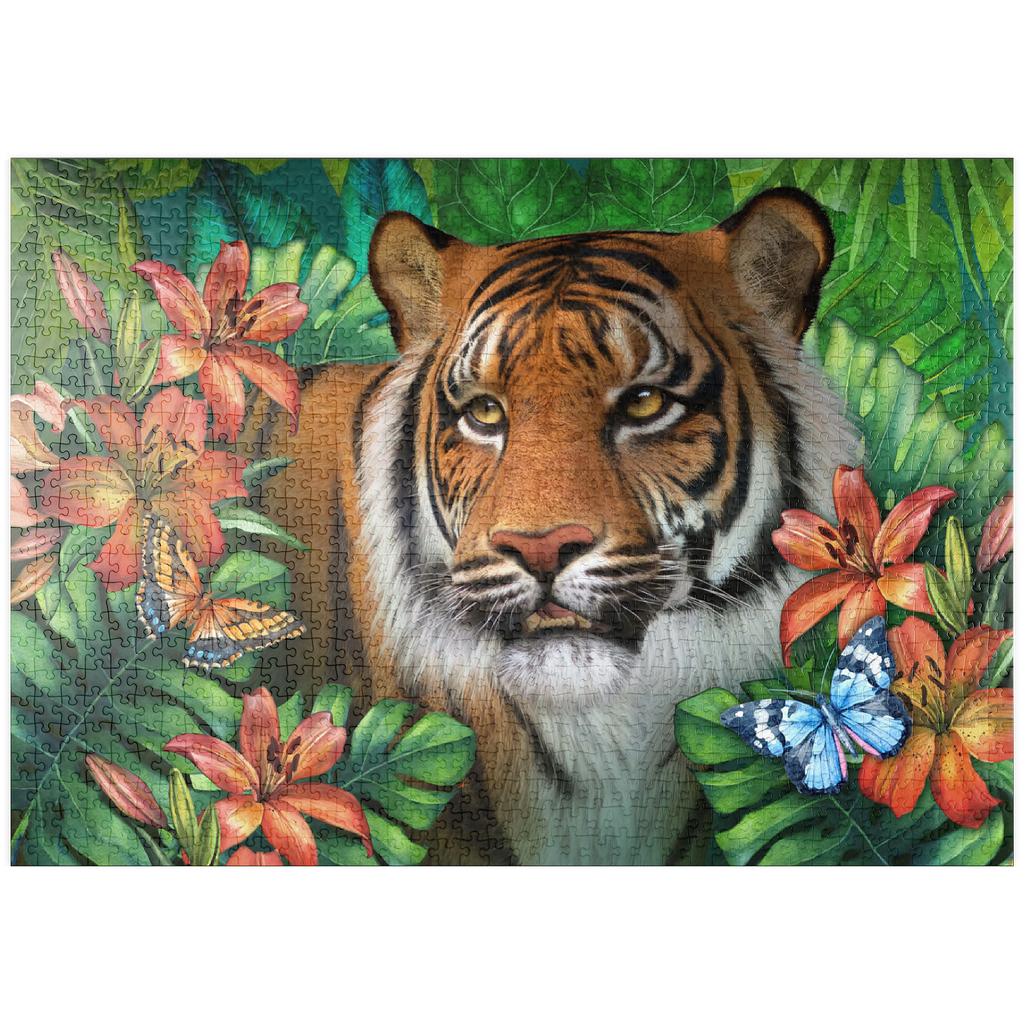 Ein majestätischer Tiger mit bernsteinfarbenen Augen ist umgeben von üppigem grünem Dschungelgebüsch dargestellt, in dem verschiedene bunte Schmetterlinge um die satten, samtigen orangefarbenen Tigerlilien flattern und einen Hauch von zarter Schönheit verleihen. Mit seiner verspielten Atmosphäre und dem Gefühl von üppigem Dschungel ist es wie geschaffen für Liebhaber von Wildtieren und Großkatzen.