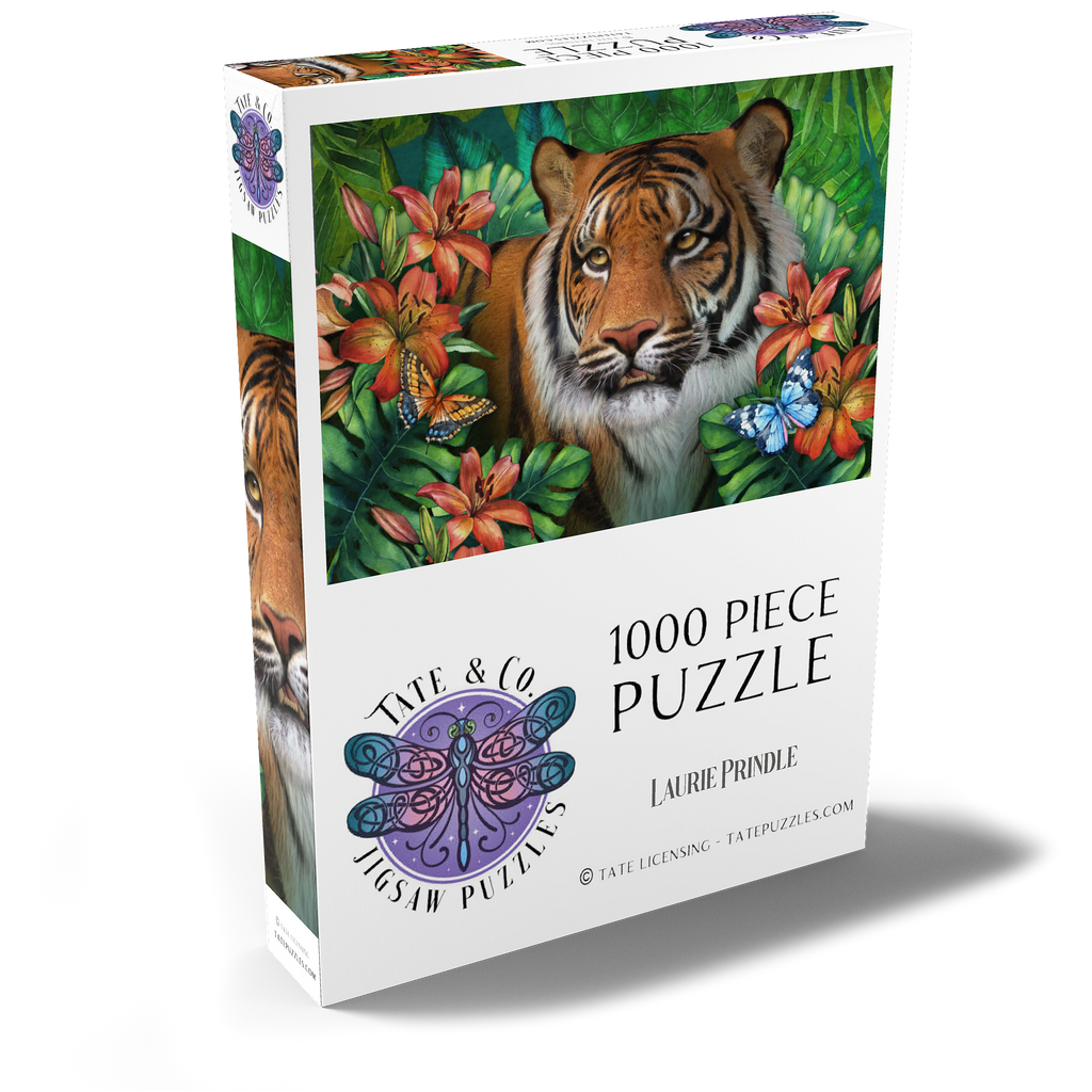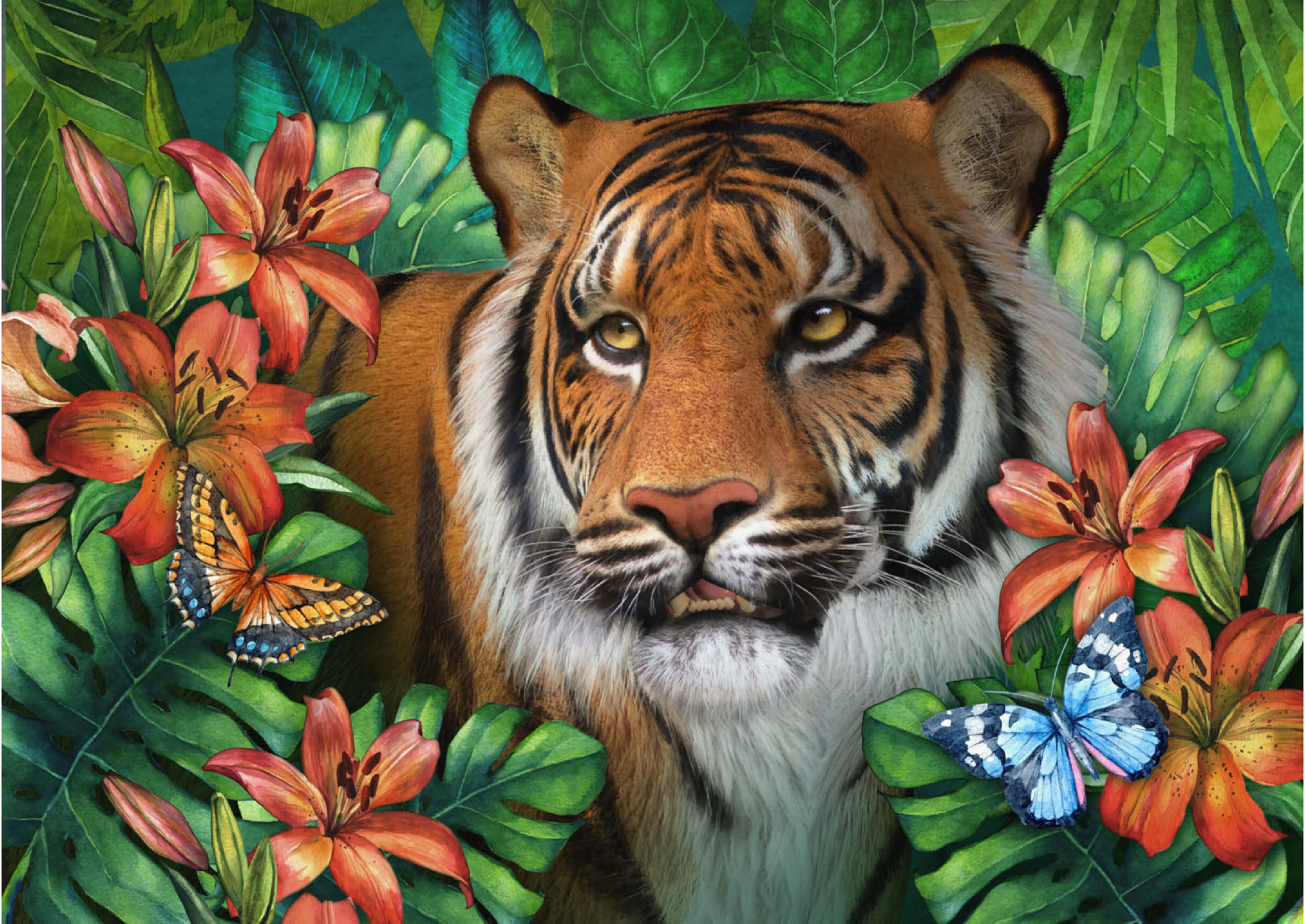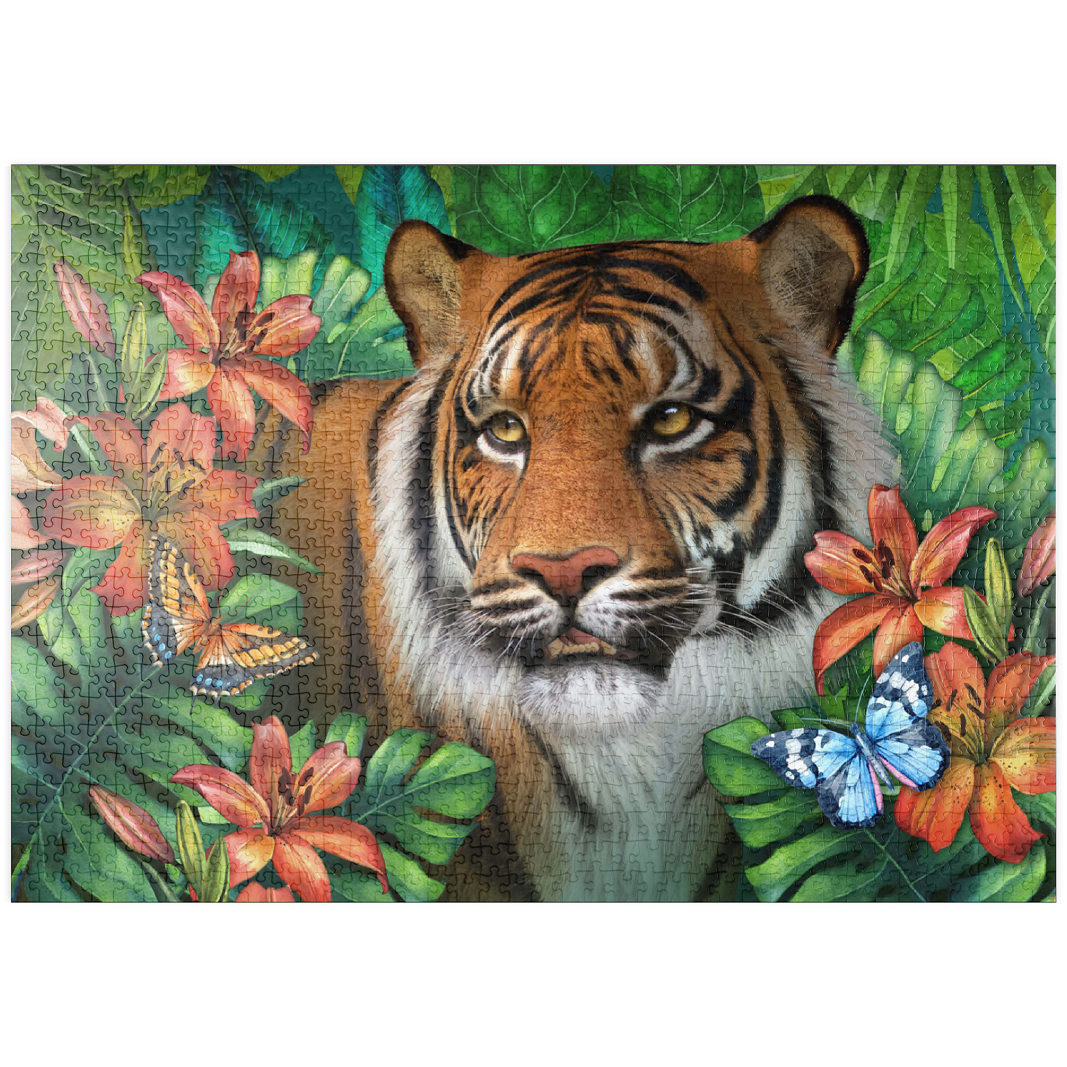 Ein majestätischer Tiger mit bernsteinfarbenen Augen ist umgeben von üppigem grünem Dschungelgebüsch dargestellt, in dem verschiedene bunte Schmetterlinge um die satten, samtigen orangefarbenen Tigerlilien flattern und einen Hauch von zarter Schönheit verleihen. Mit seiner verspielten Atmosphäre und dem Gefühl von üppigem Dschungel ist es wie geschaffen für Liebhaber von Wildtieren und Großkatzen.