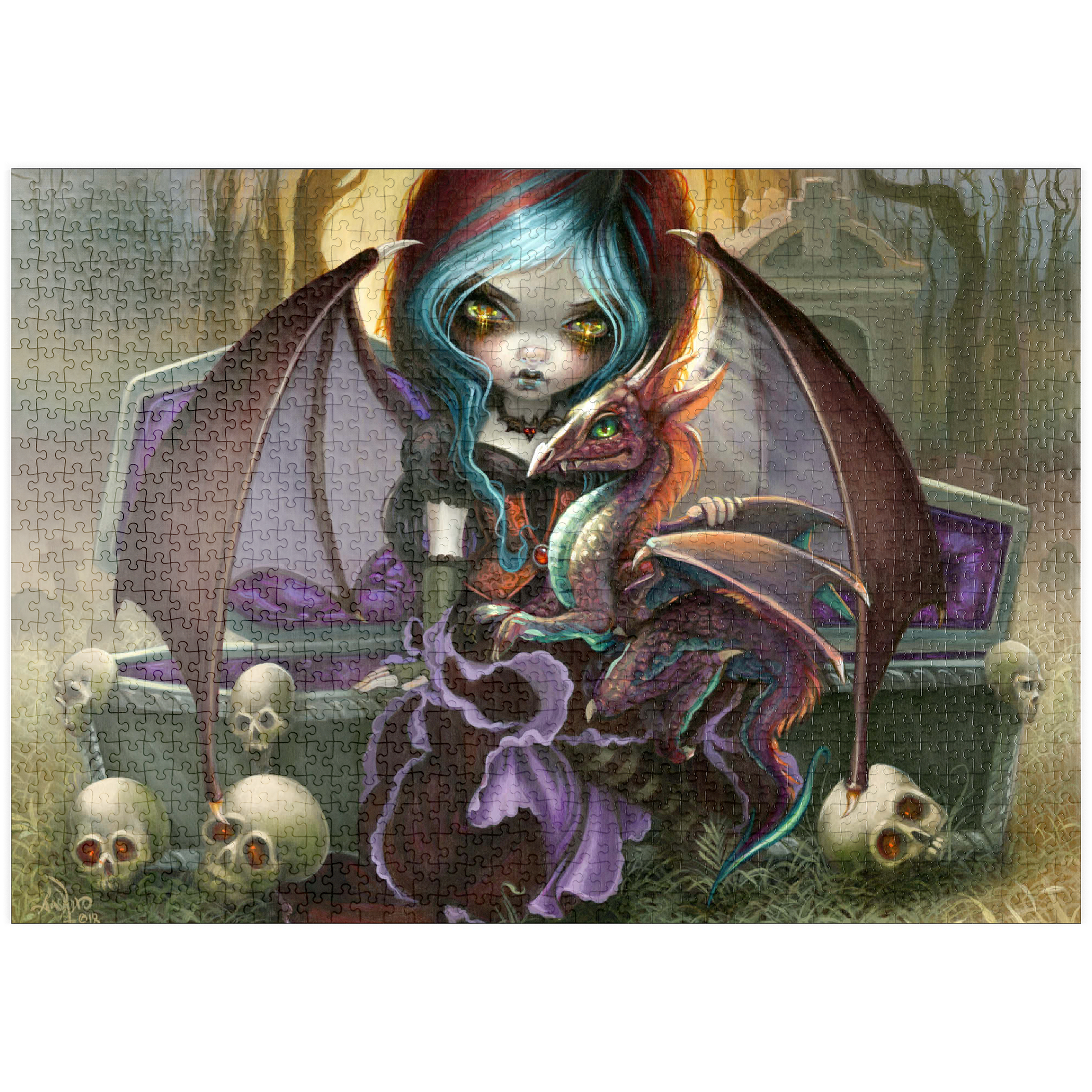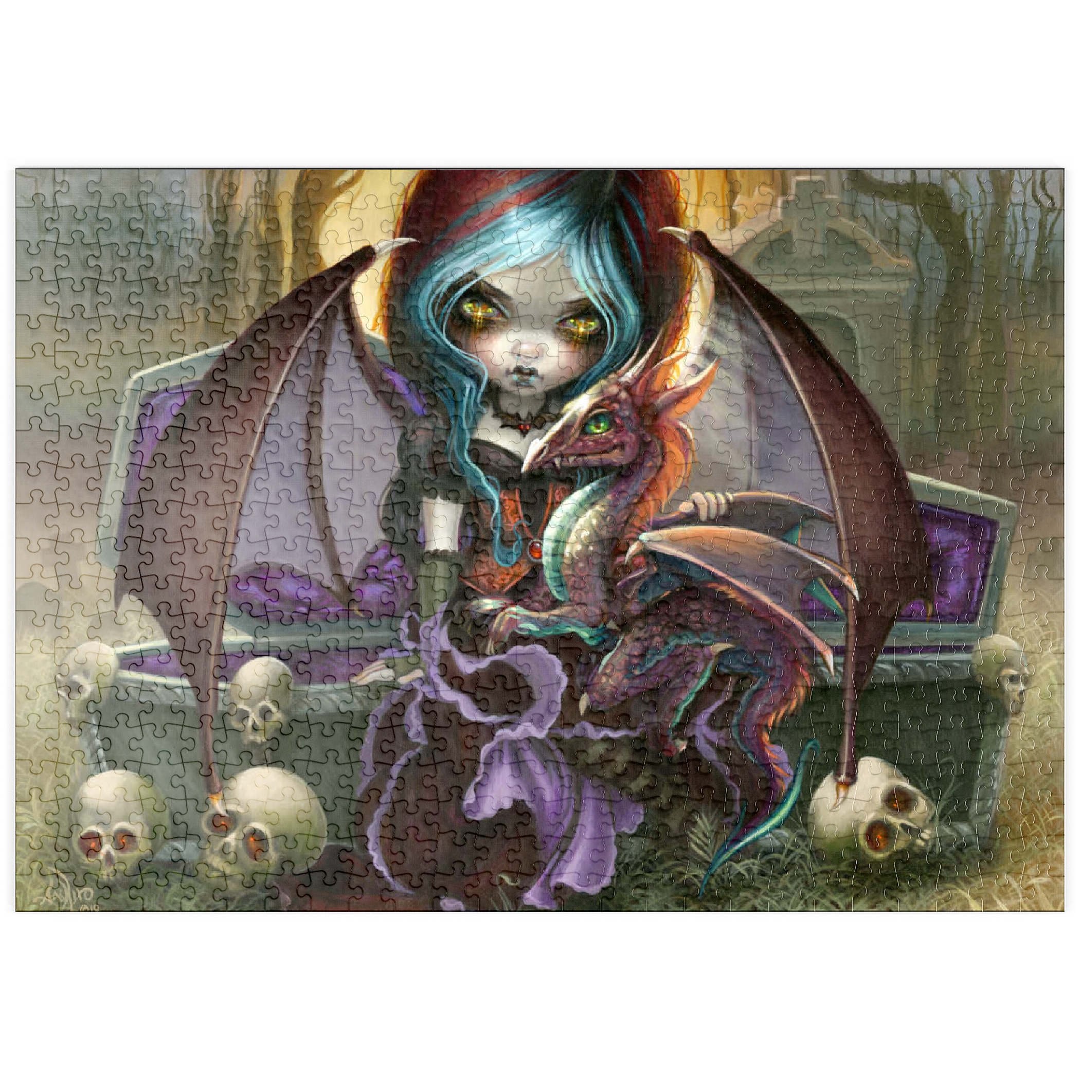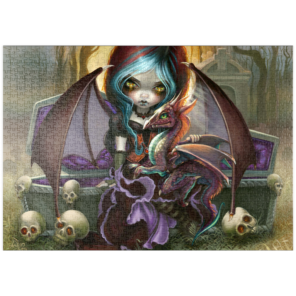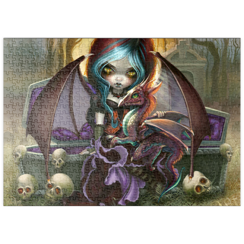 Entfesseln Sie die bezaubernde Dunkelheit des Puzzles „Vampire Dragonling“! Setzen Sie einen charmanten Vampir und seinen unheimlich niedlichen Drachenbegleiter zusammen, die in einem nebligen Friedhof bei Sonnenuntergang erwachen. Entdecken Sie diese einzigartige Mischung aus Gothic und bezaubernder Fantasie. Ein herrlich gruseliges Puzzle-Abenteuer erwartet Sie!