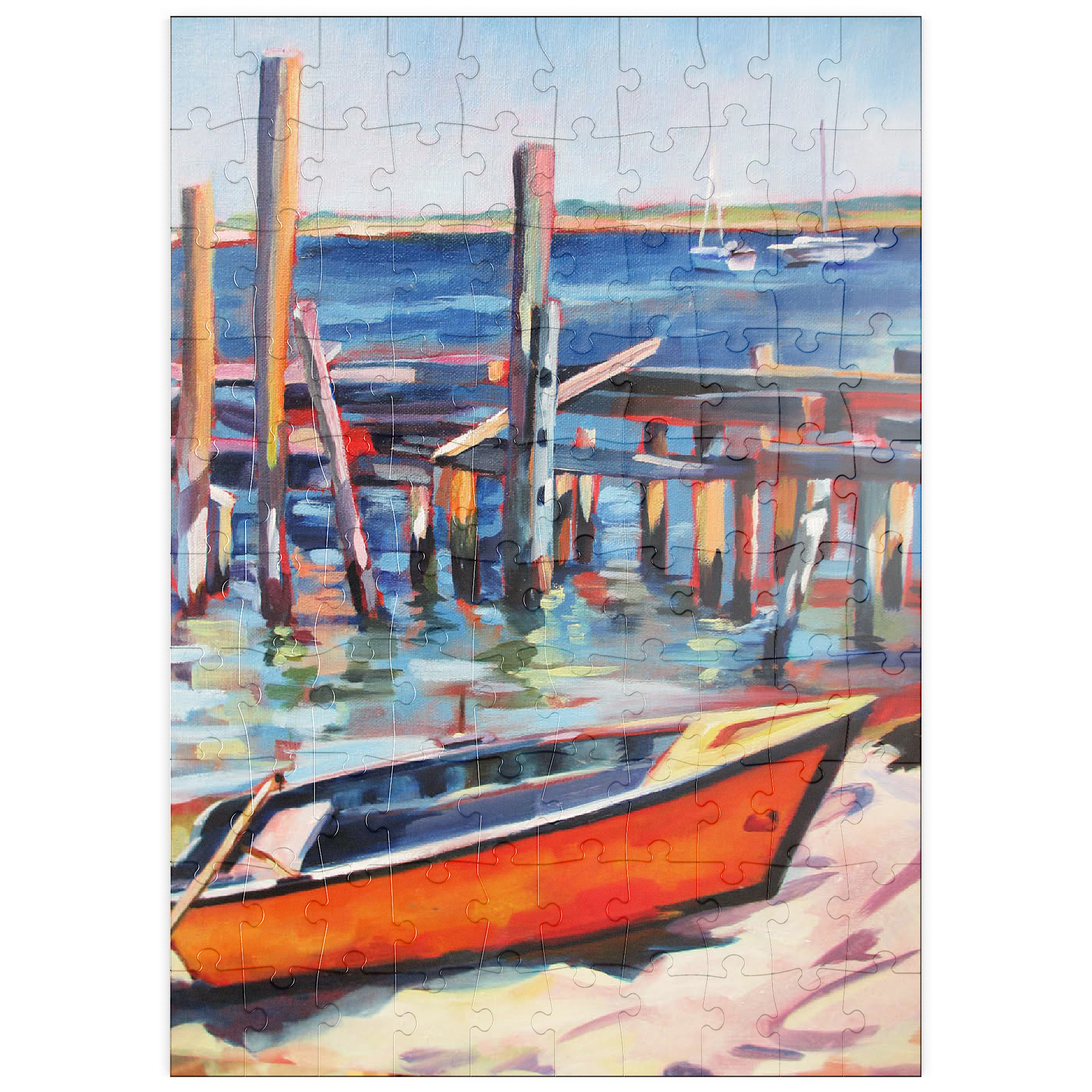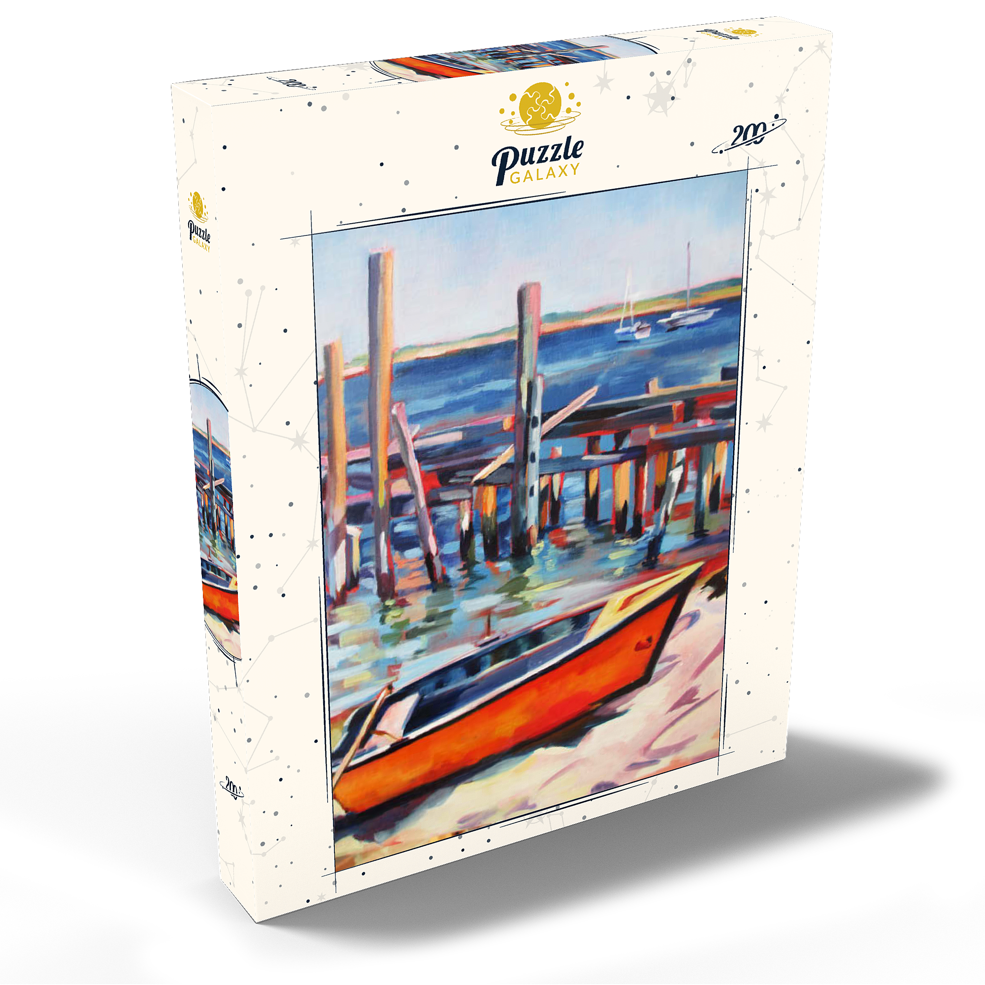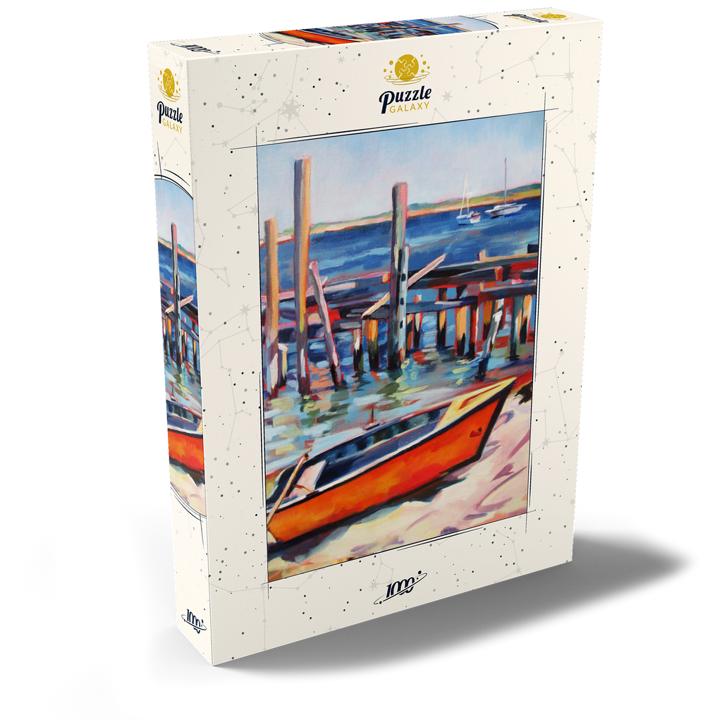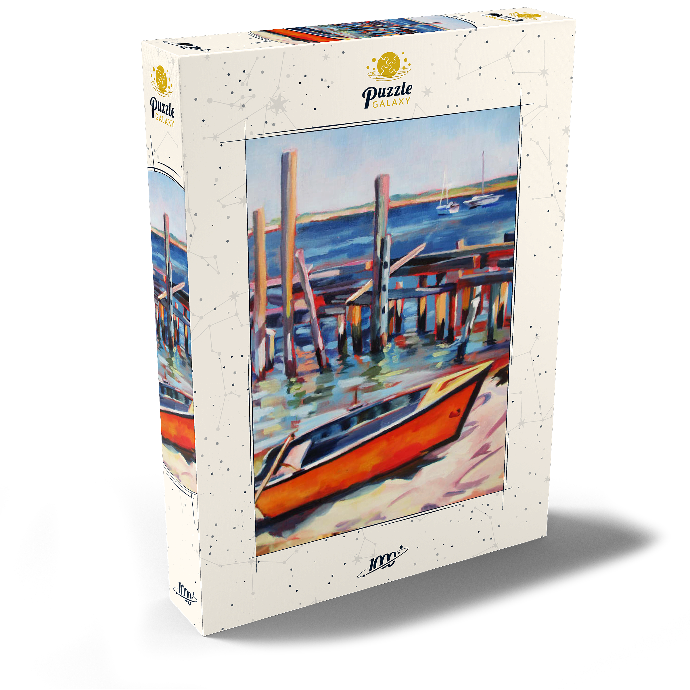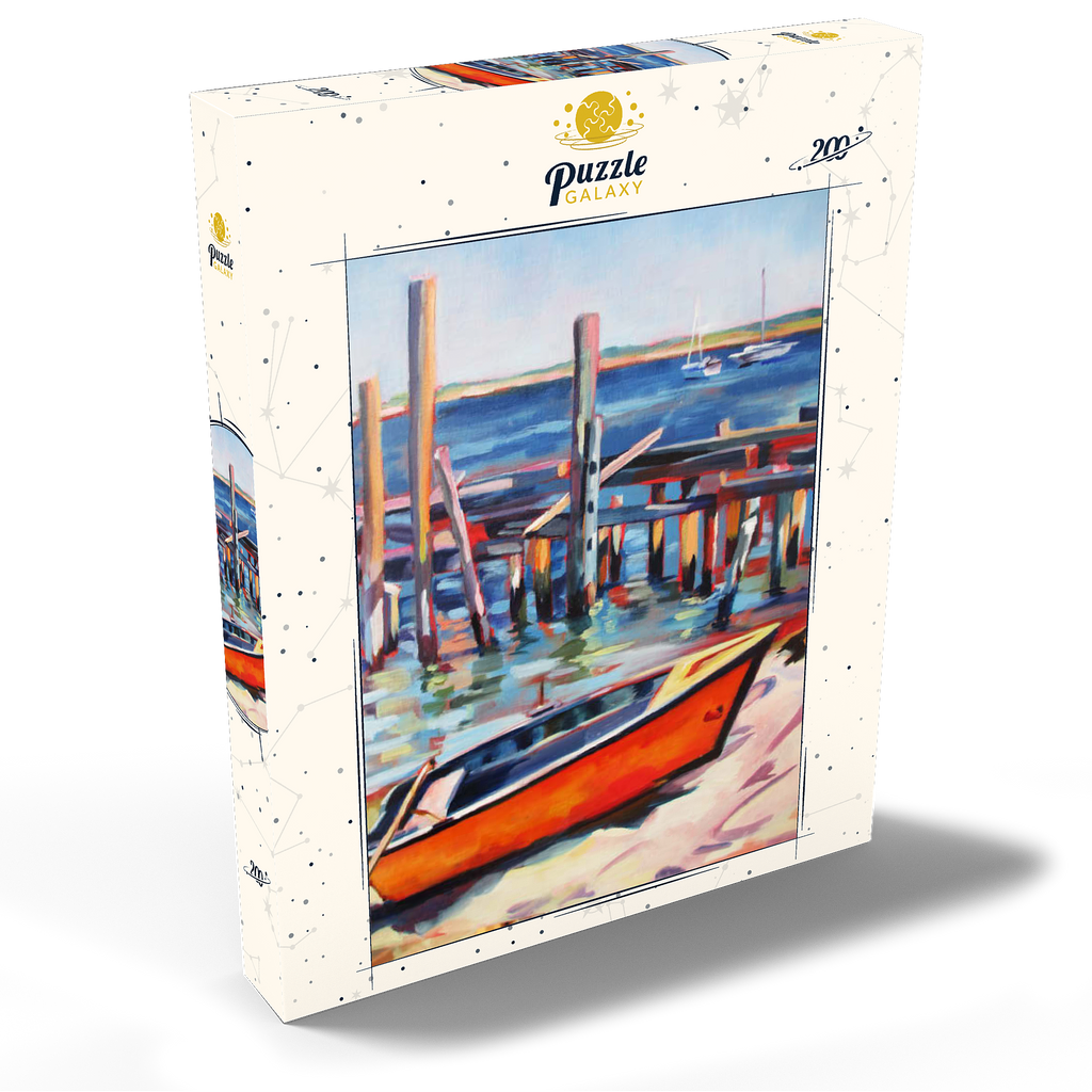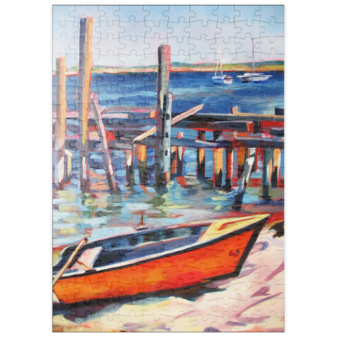 Dieses dynamische Gemälde fängt den Charme einer sonnenbeschienenen Hafenszene mit einem leuchtend orangefarbenen Ruderboot ein, das auf dem Sandstrand ruht. Verwitterte Holzpfähle und ein teilweise gebauter Steg spiegeln sich im plätschernden blauen Wasser, während in der Ferne Segelboote ruhig vor sich hin treiben. Die kühnen Pinselstriche des Künstlers und die lebendige Farbpalette evozieren die Wärme und Ruhe eines Tages am Meer. Das Zusammenspiel von Licht und Schatten schafft Tiefe und verstärkt die heitere maritime Atmosphäre.
