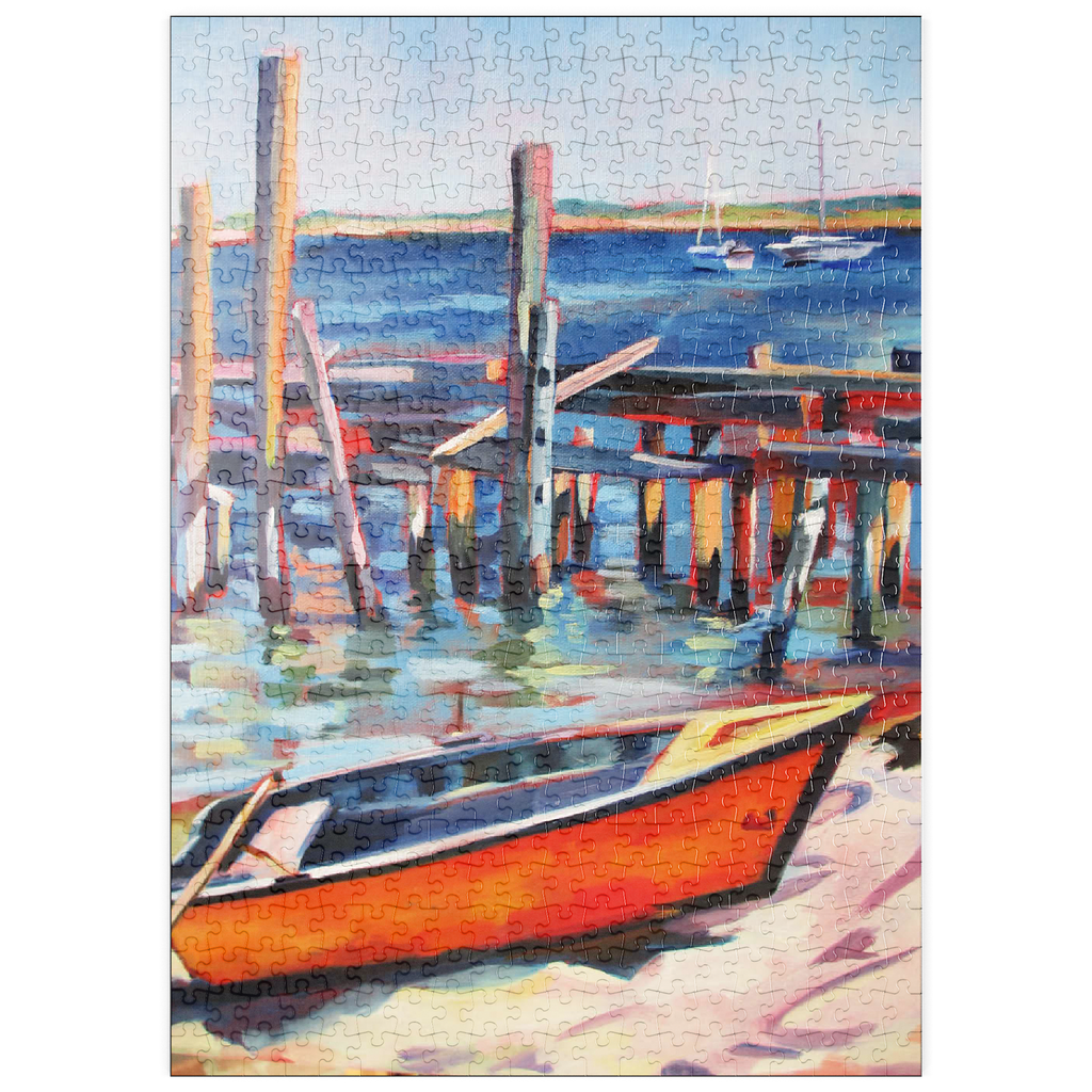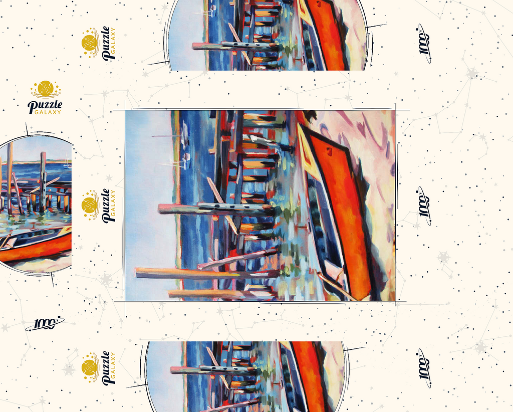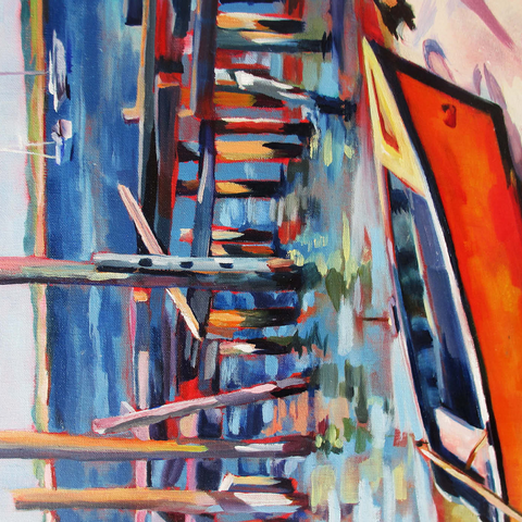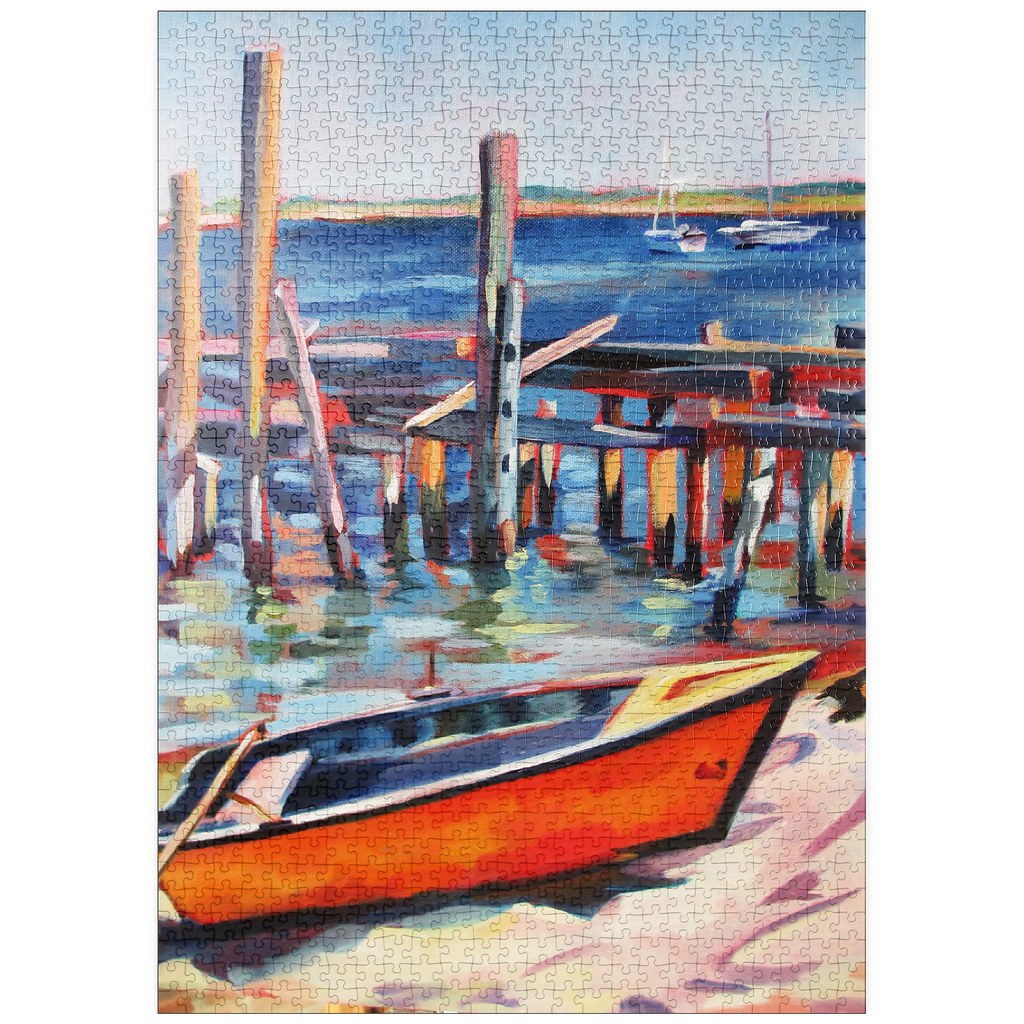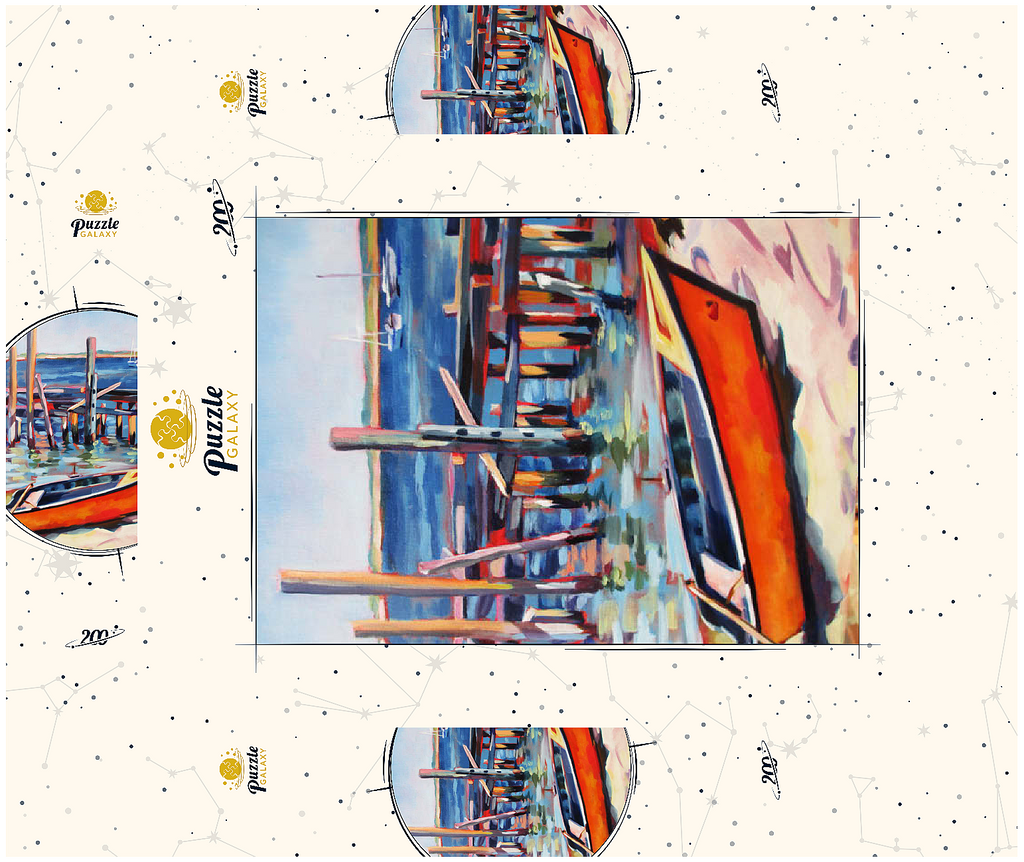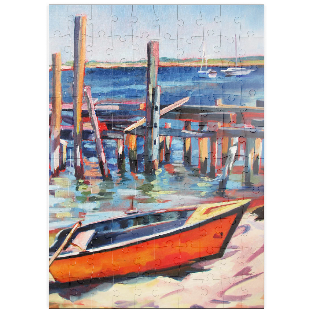 Dieses dynamische Gemälde fängt den Charme einer sonnenbeschienenen Hafenszene mit einem leuchtend orangefarbenen Ruderboot ein, das auf dem Sandstrand ruht. Verwitterte Holzpfähle und ein teilweise gebauter Steg spiegeln sich im plätschernden blauen Wasser, während in der Ferne Segelboote ruhig vor sich hin treiben. Die kühnen Pinselstriche des Künstlers und die lebendige Farbpalette evozieren die Wärme und Ruhe eines Tages am Meer. Das Zusammenspiel von Licht und Schatten schafft Tiefe und verstärkt die heitere maritime Atmosphäre.