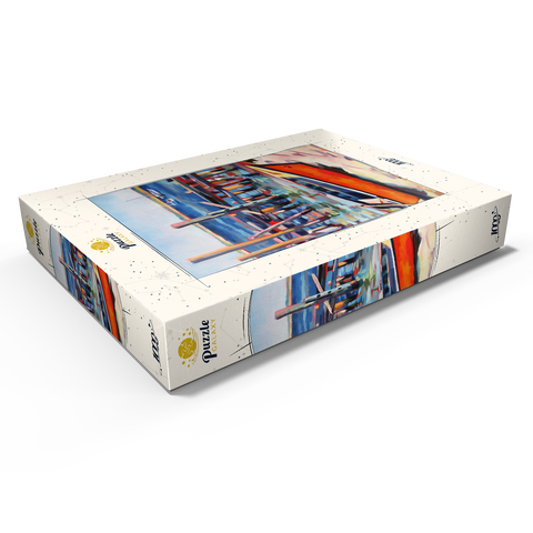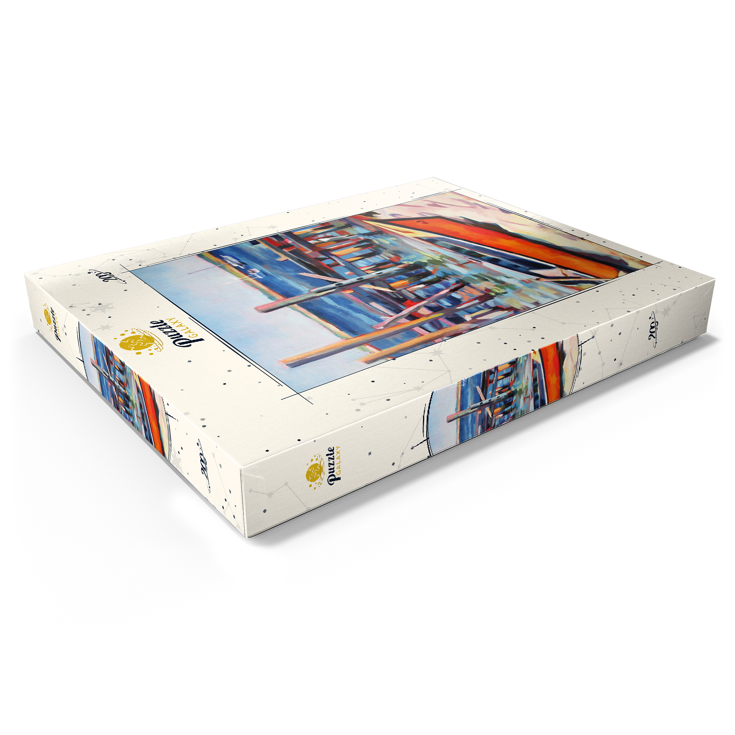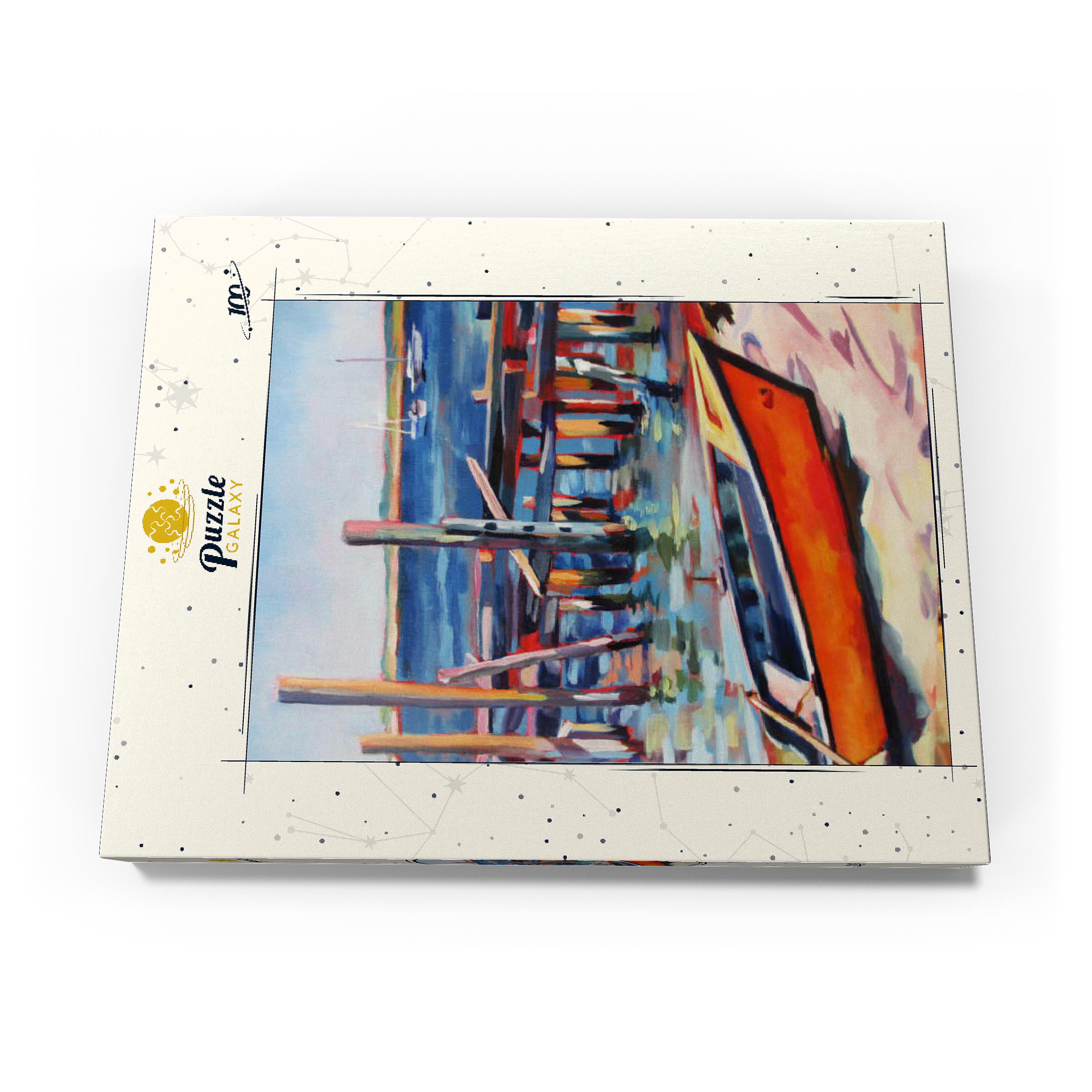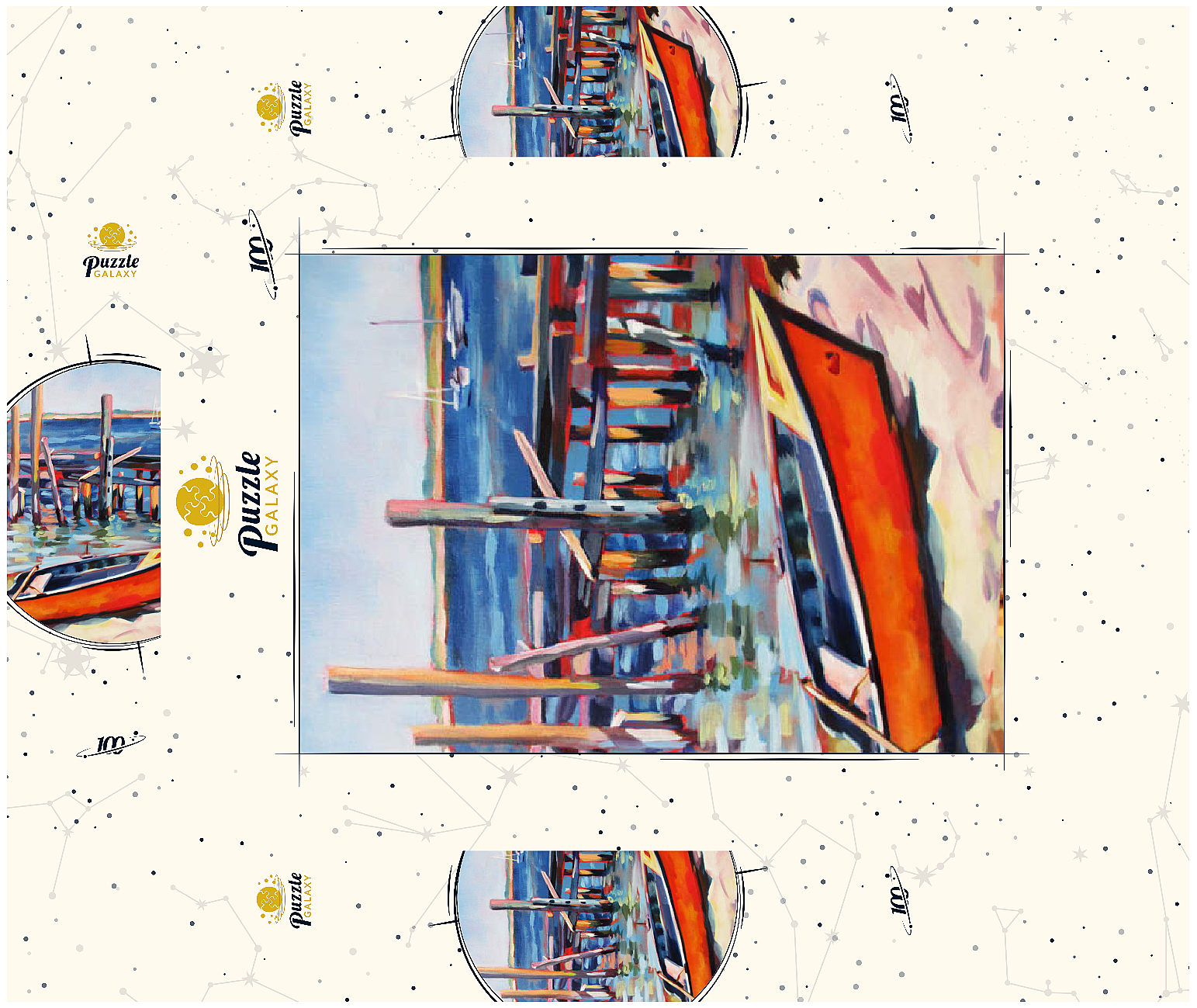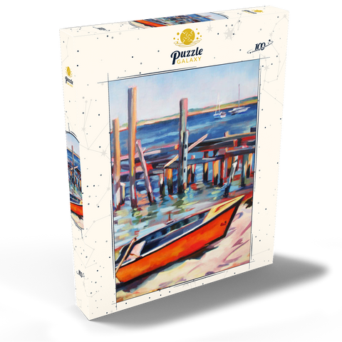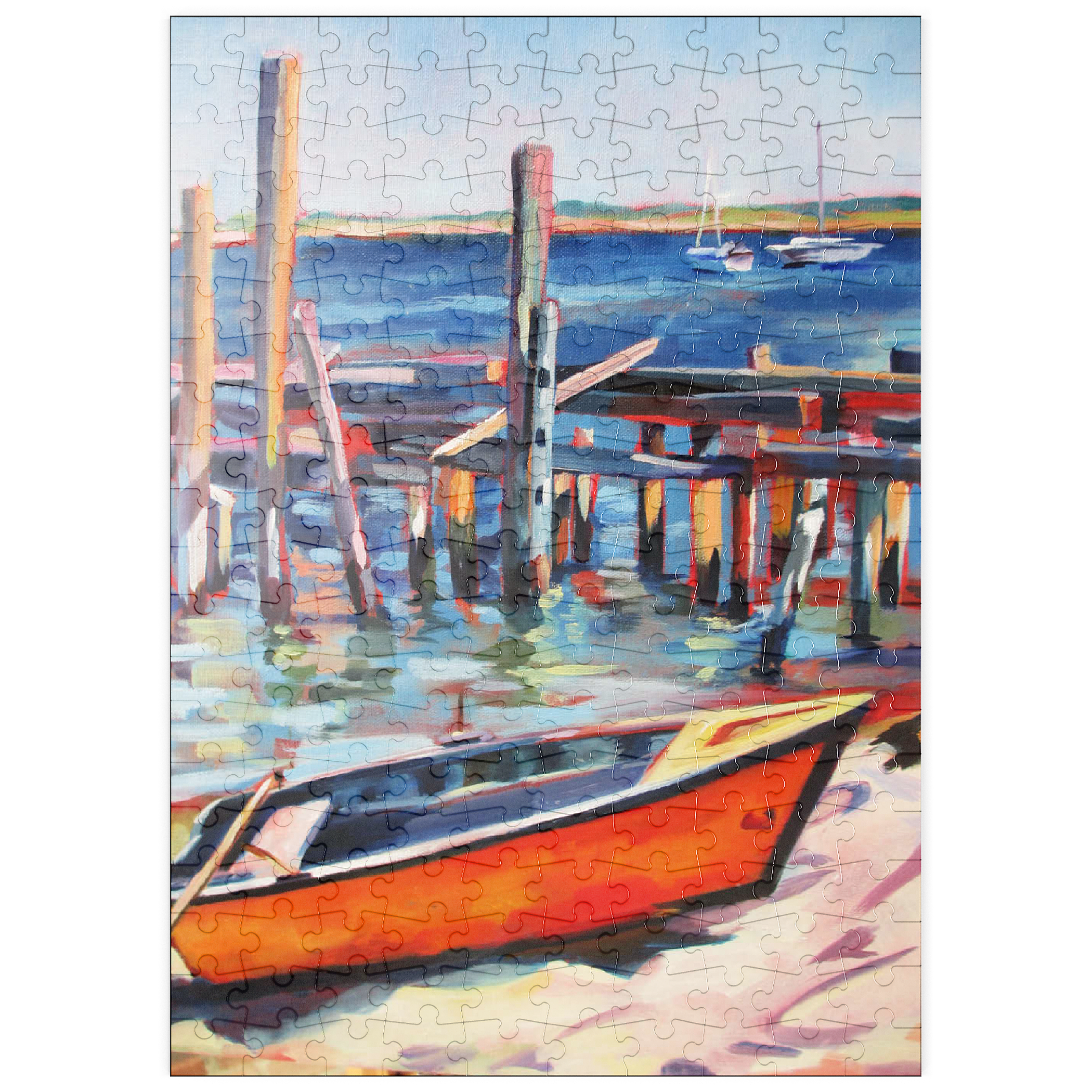 Dieses dynamische Gemälde fängt den Charme einer sonnenbeschienenen Hafenszene mit einem leuchtend orangefarbenen Ruderboot ein, das auf dem Sandstrand ruht. Verwitterte Holzpfähle und ein teilweise gebauter Steg spiegeln sich im plätschernden blauen Wasser, während in der Ferne Segelboote ruhig vor sich hin treiben. Die kühnen Pinselstriche des Künstlers und die lebendige Farbpalette evozieren die Wärme und Ruhe eines Tages am Meer. Das Zusammenspiel von Licht und Schatten schafft Tiefe und verstärkt die heitere maritime Atmosphäre.