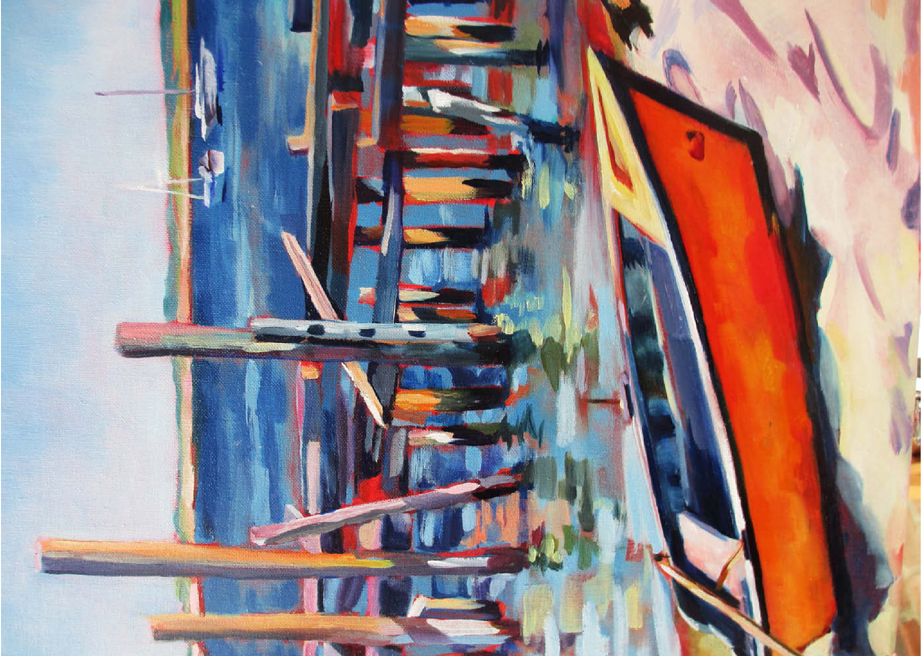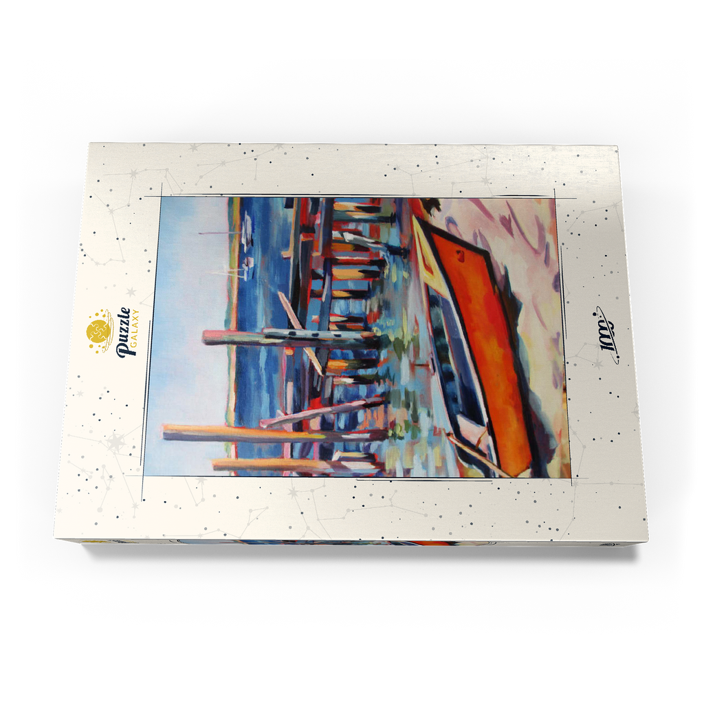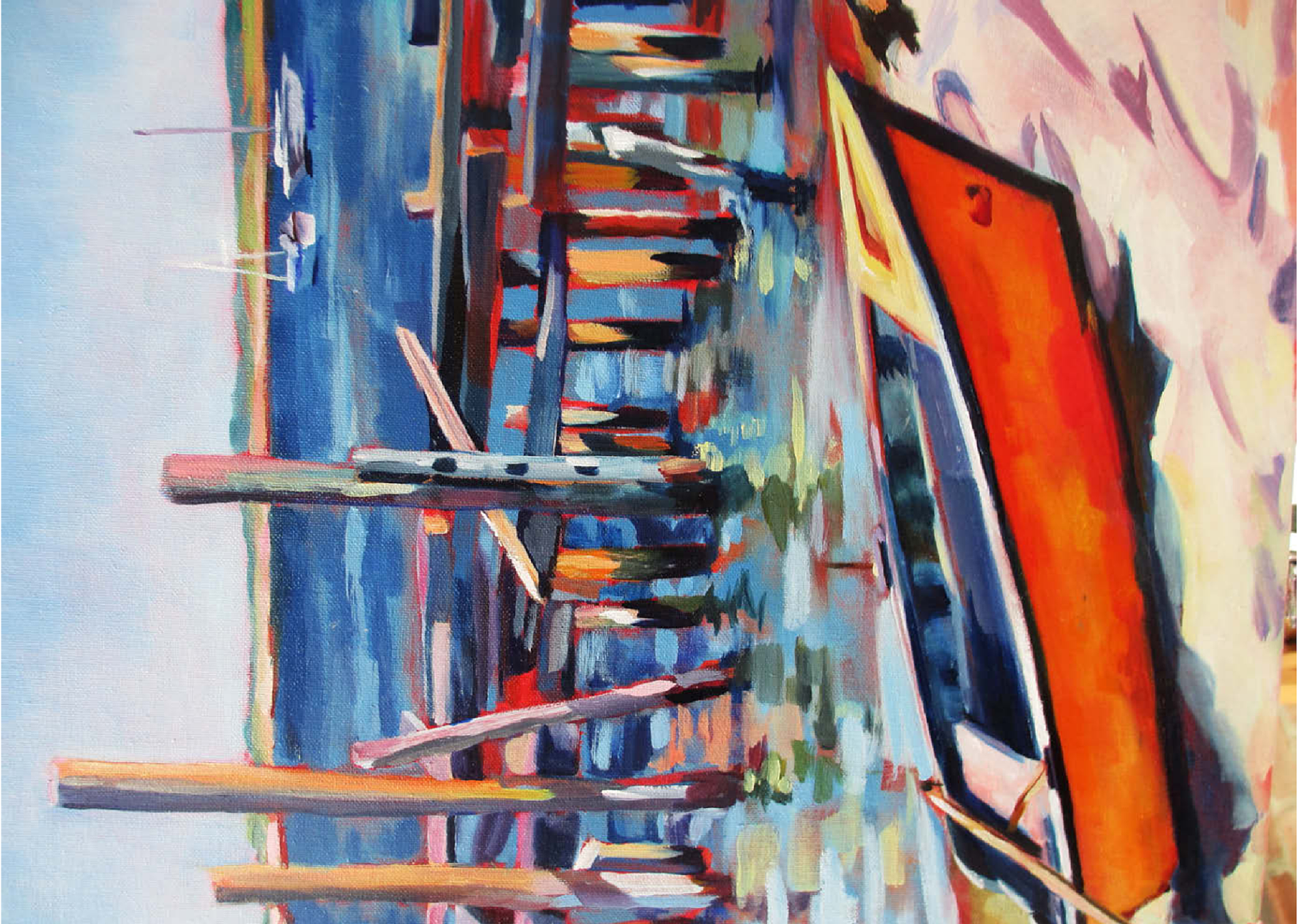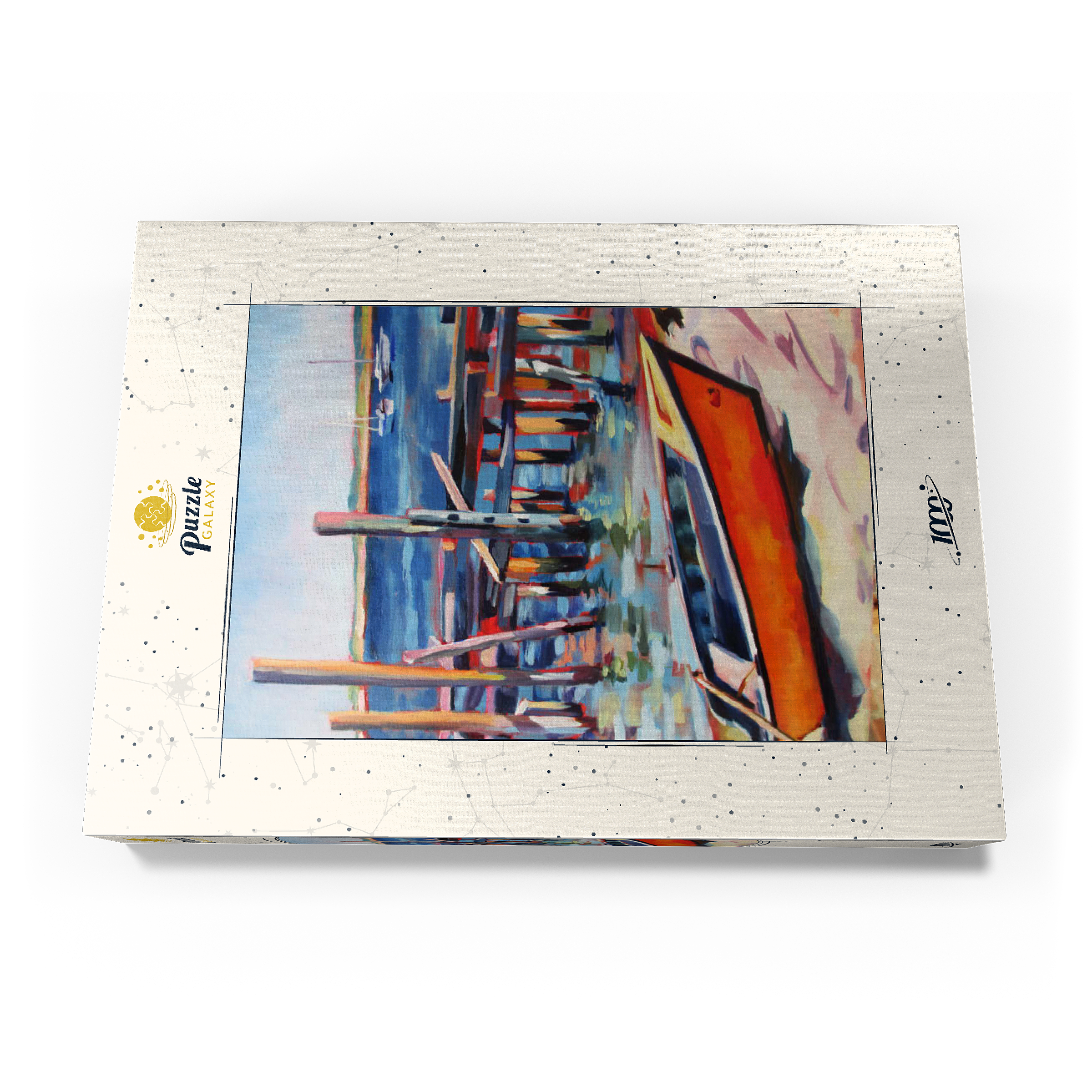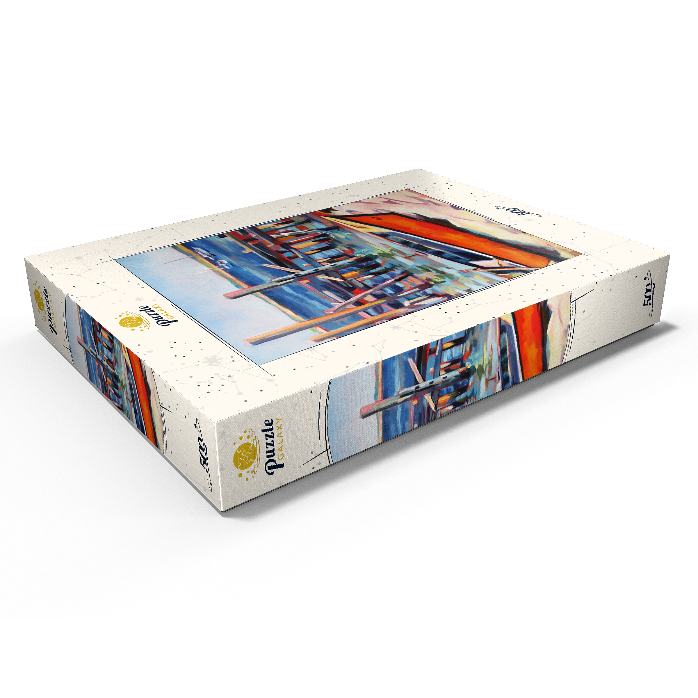 Dieses dynamische Gemälde fängt den Charme einer sonnenbeschienenen Hafenszene mit einem leuchtend orangefarbenen Ruderboot ein, das auf dem Sandstrand ruht. Verwitterte Holzpfähle und ein teilweise gebauter Steg spiegeln sich im plätschernden blauen Wasser, während in der Ferne Segelboote ruhig vor sich hin treiben. Die kühnen Pinselstriche des Künstlers und die lebendige Farbpalette evozieren die Wärme und Ruhe eines Tages am Meer. Das Zusammenspiel von Licht und Schatten schafft Tiefe und verstärkt die heitere maritime Atmosphäre.