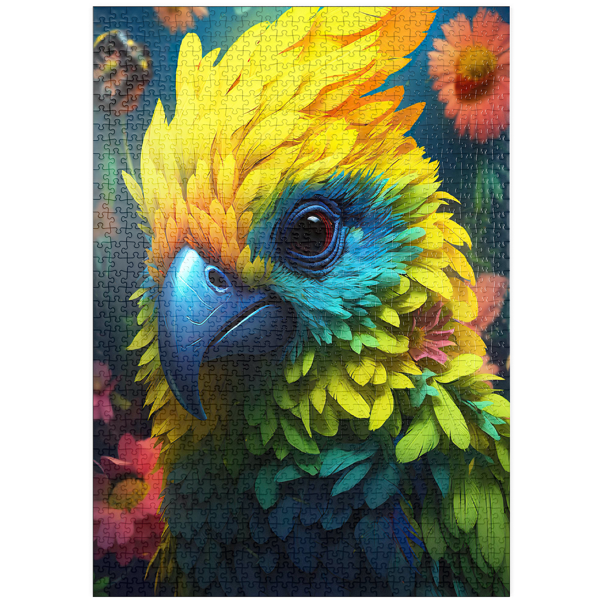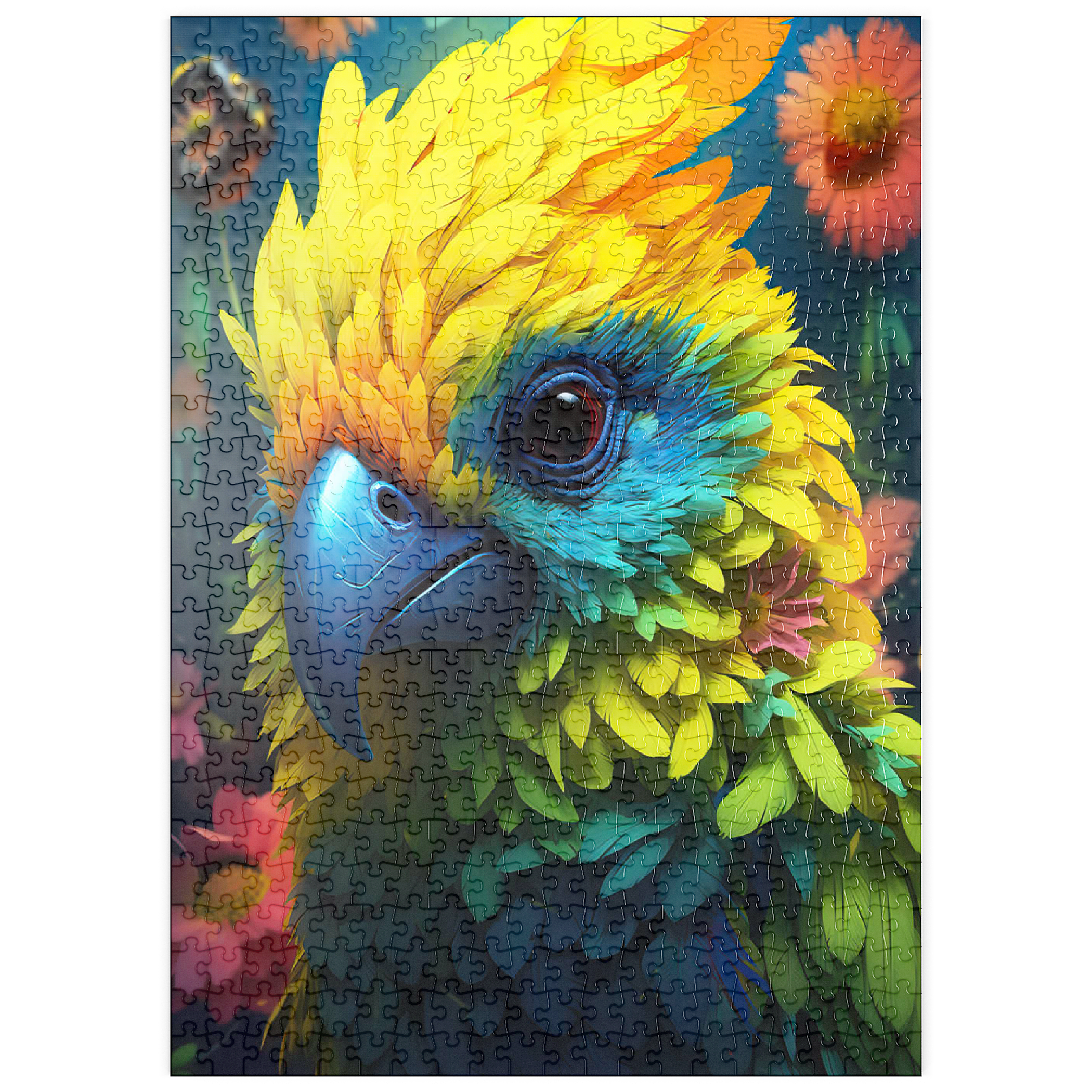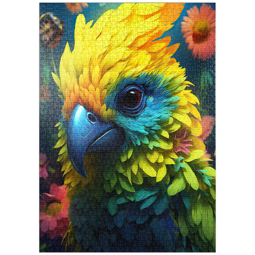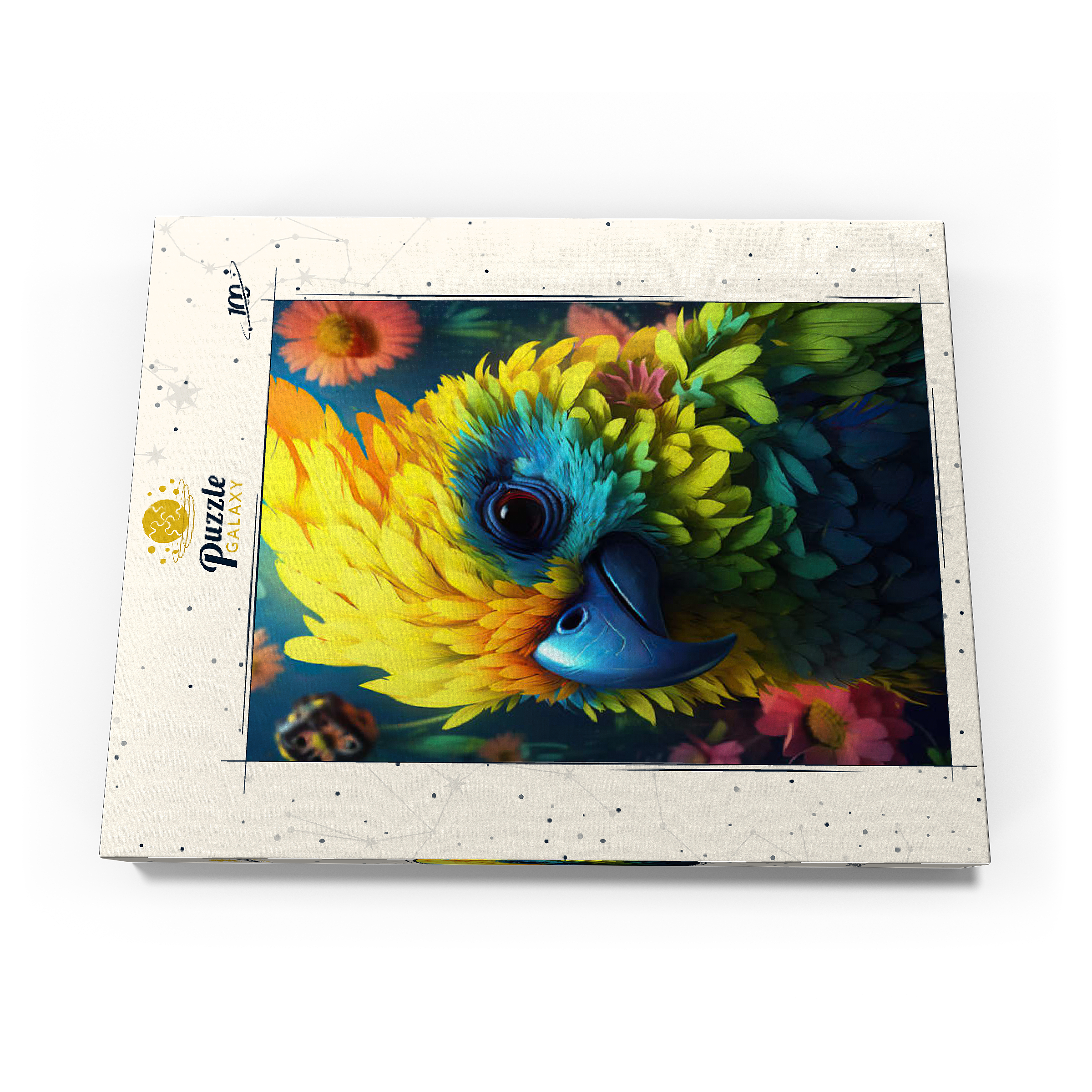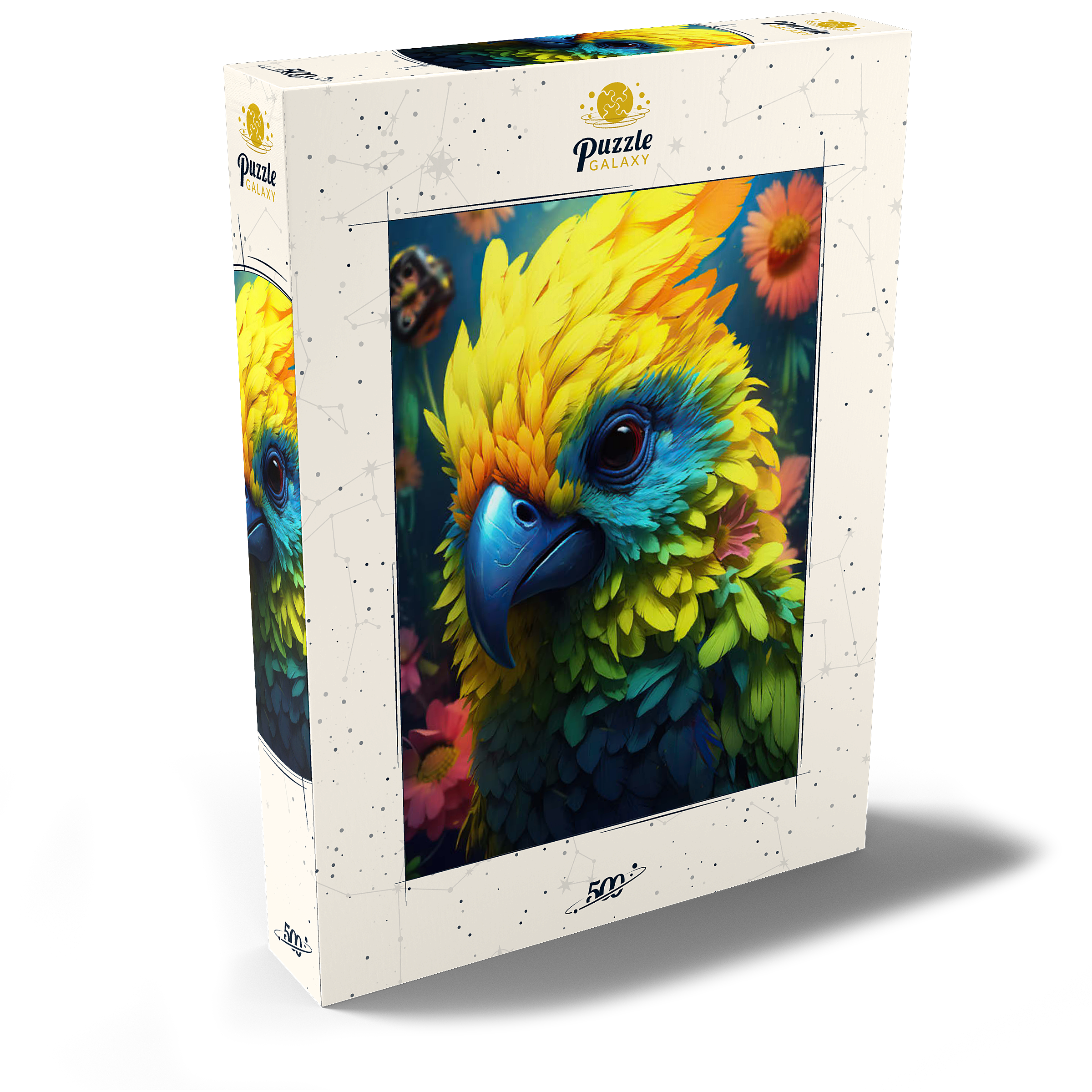 Erleben Sie die atemberaubende Schönheit dieses lebhaften tropischen Papageis, der mit auffälligen gelben, grünen und blauen Federn geschmückt ist. Die filigranen Details seines Gefieders sorgen für ein faszinierendes Farbenspiel, das durch den weichen Blumenhintergrund mit zarten Blüten in warmen, einladenden Tönen noch verstärkt wird. Der scharfe, metallische Schnabel und die stechenden Augen des Papageis verleihen ihm Tiefe und Realismus und machen ihn zu einem exquisiten Kunstwerk für Vogelliebhaber und Naturbegeisterte. Diese atemberaubende Darstellung fängt das Wesen der exotischen Tierwelt ein und verleiht jedem Raum einen Hauch von Wunder und tropischem Charme.