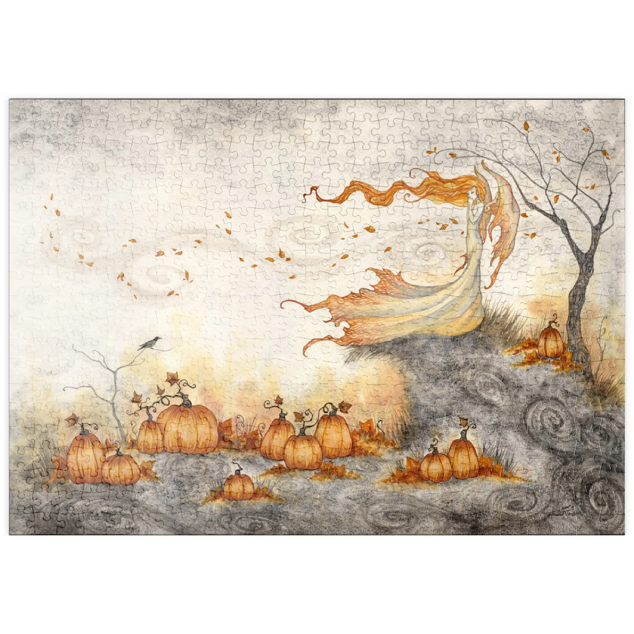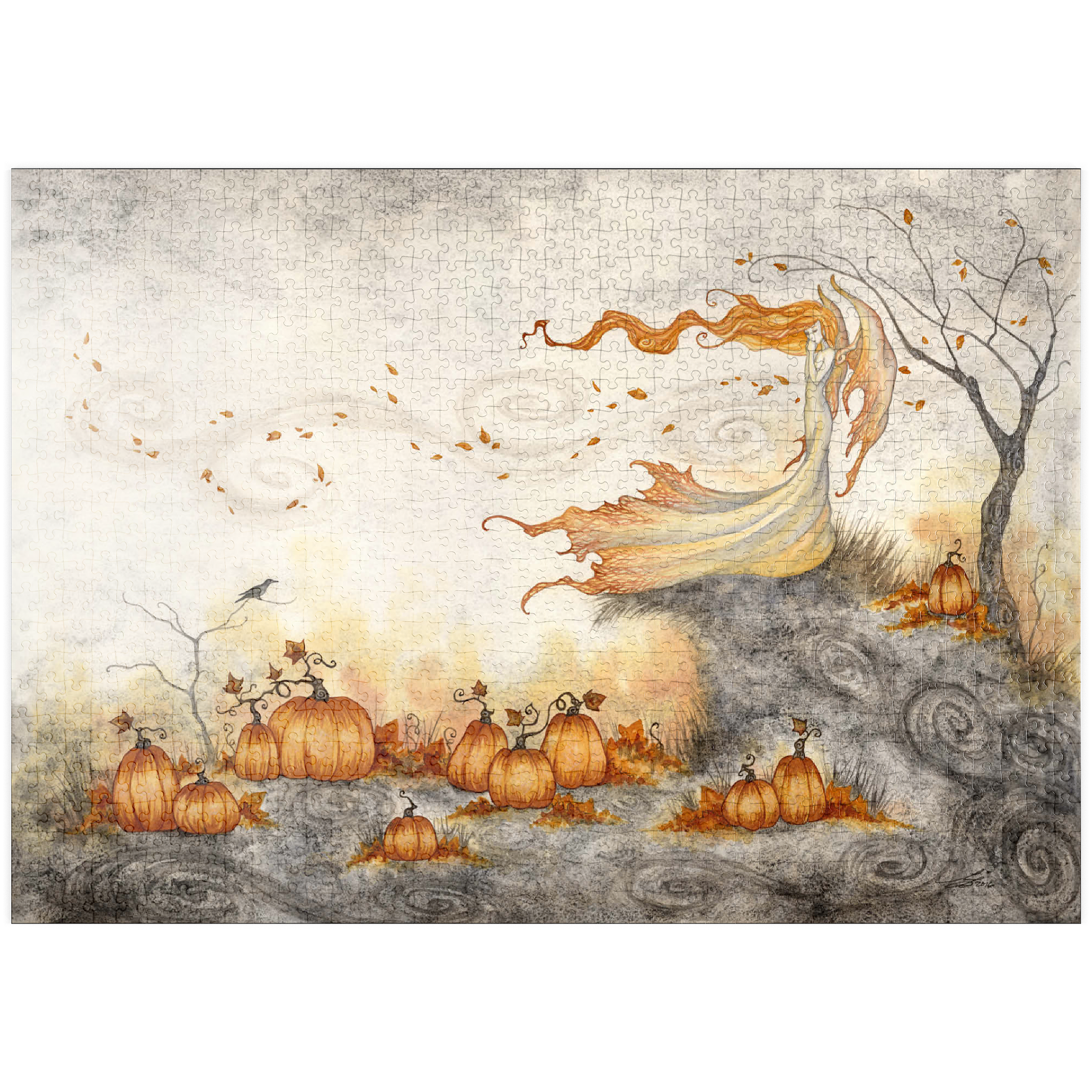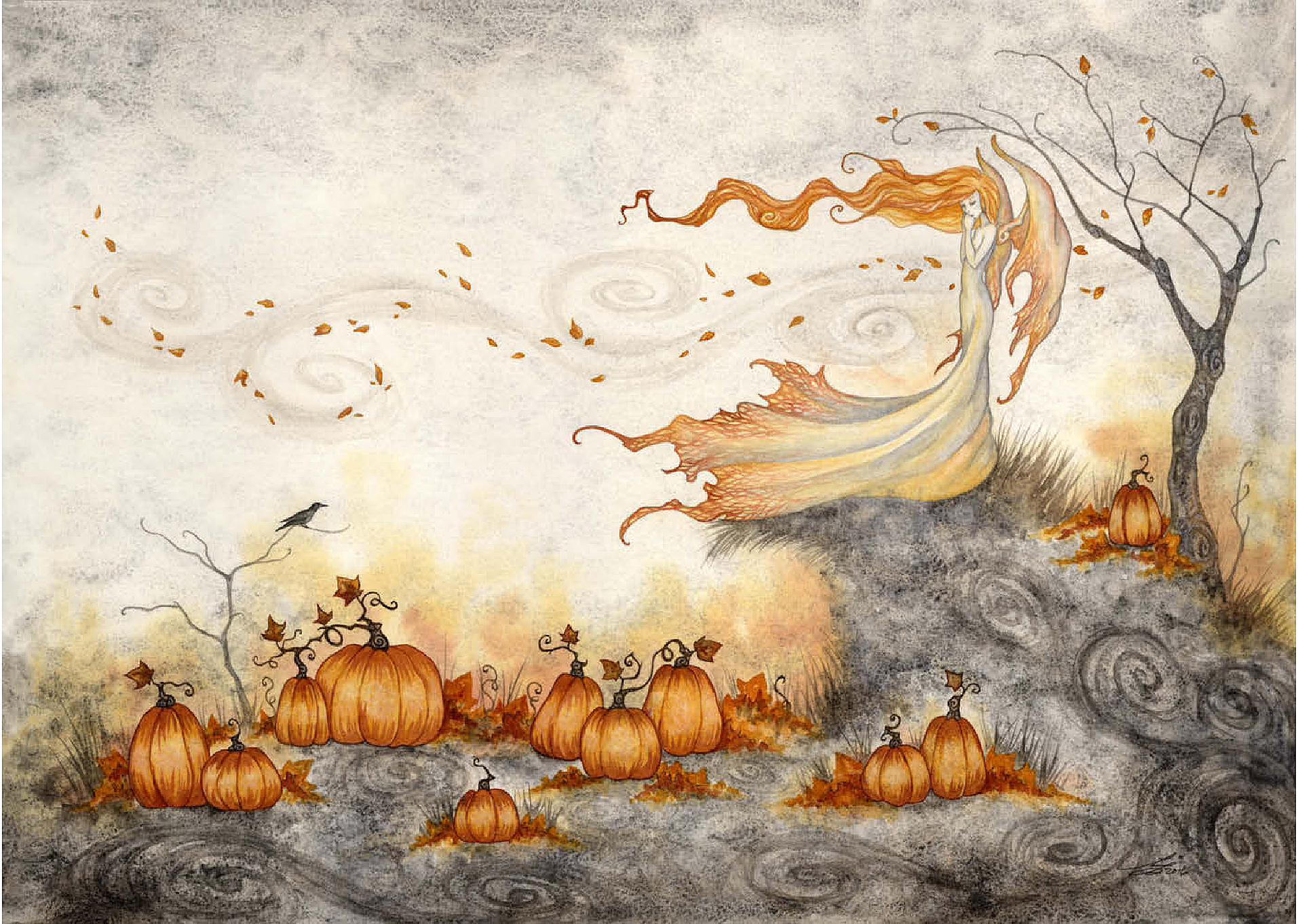 Eine anmutige Fee in einem wallenden Kleid steht auf einem windigen Hügel, ihr langes Haar und ihre Flügel wehen wie Feuer, während Herbstblätter um sie herumwirbeln. „Whispers in the Pumpkin Patch“ fängt einen Moment stiller Magie ein, während sie den Geheimnissen lauscht, die der Wind über einem leuchtenden Feld voller Kürbisse herüberweht.