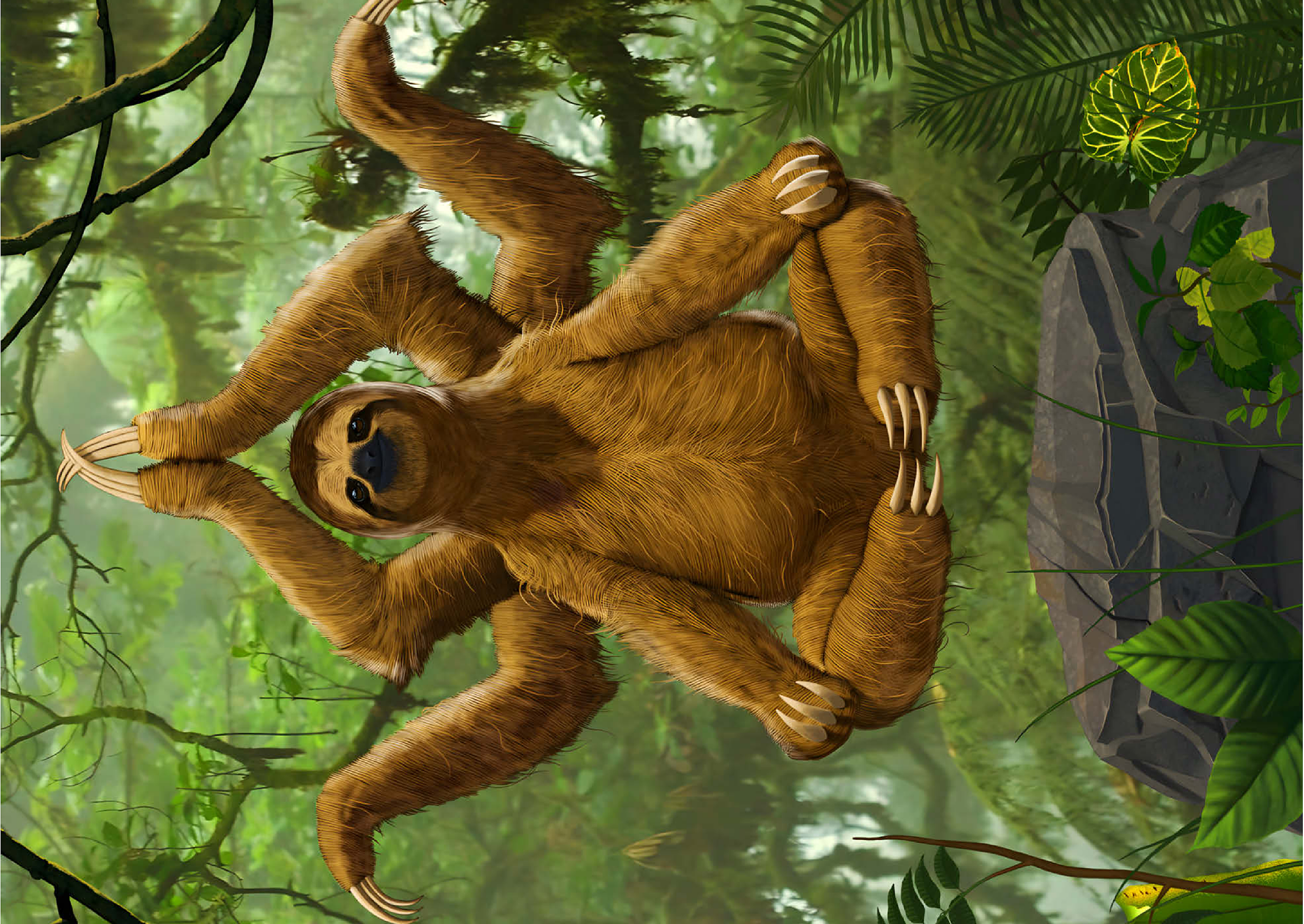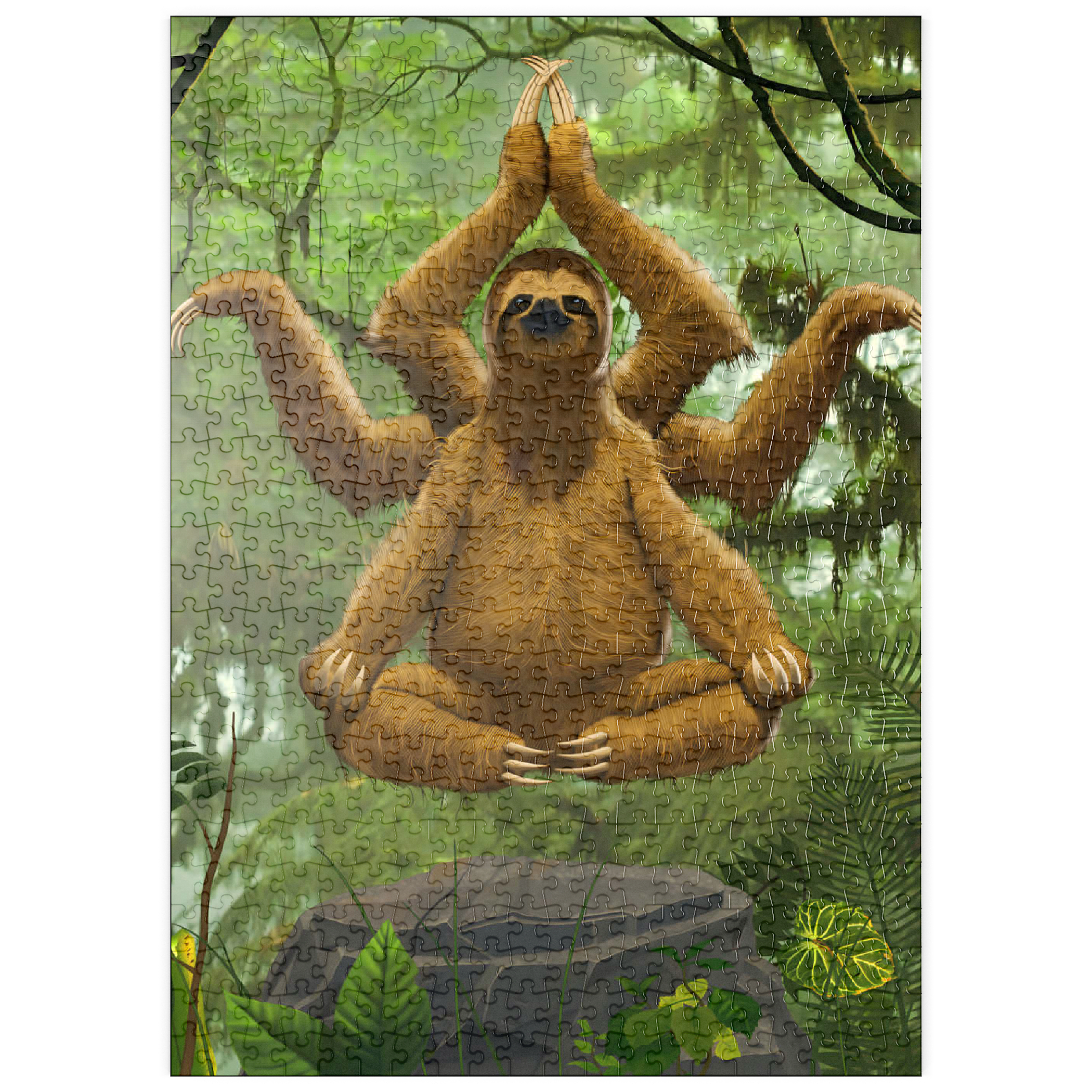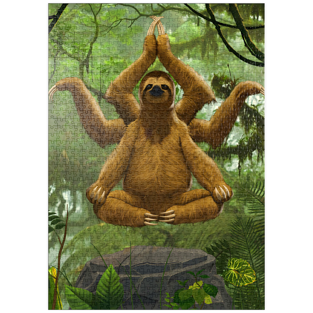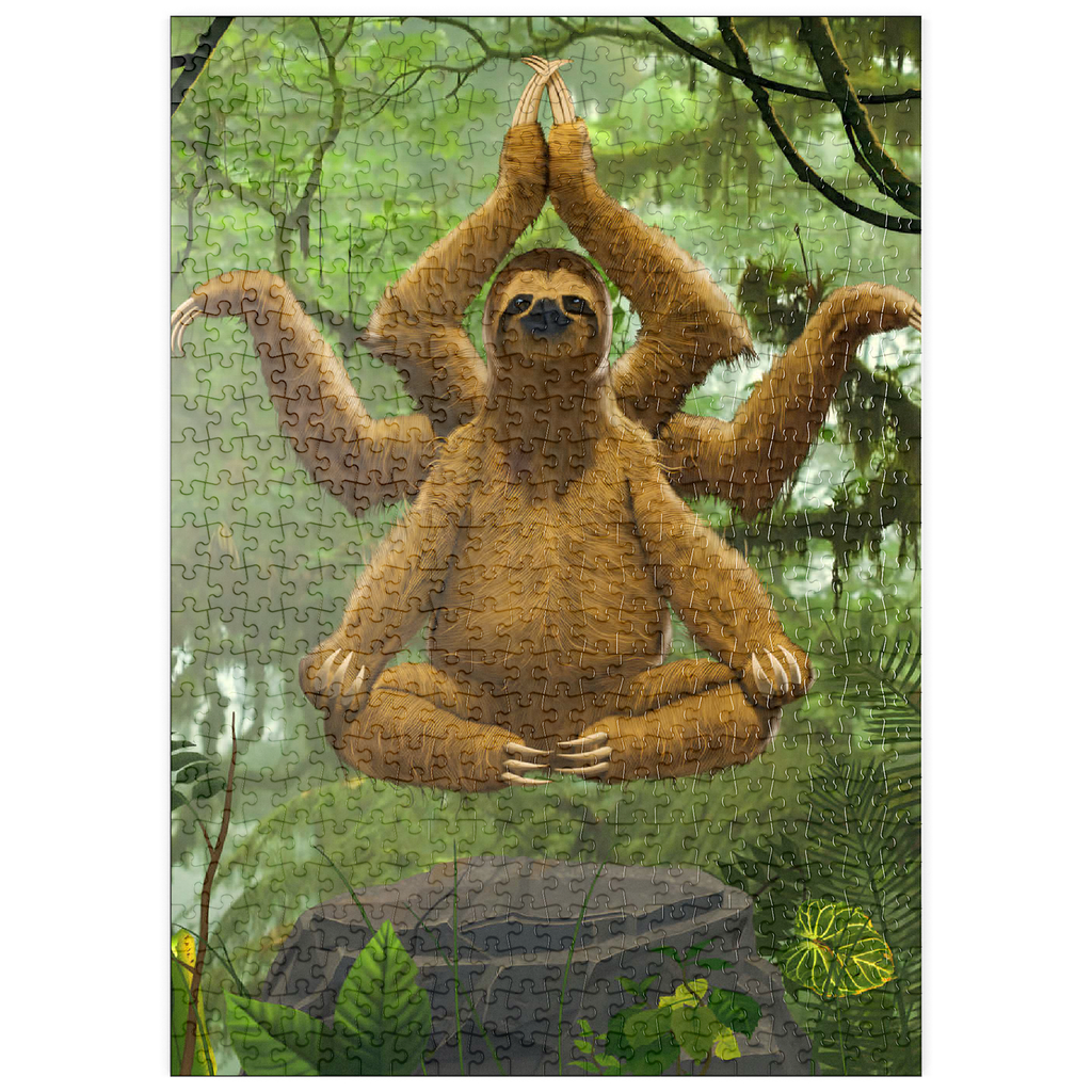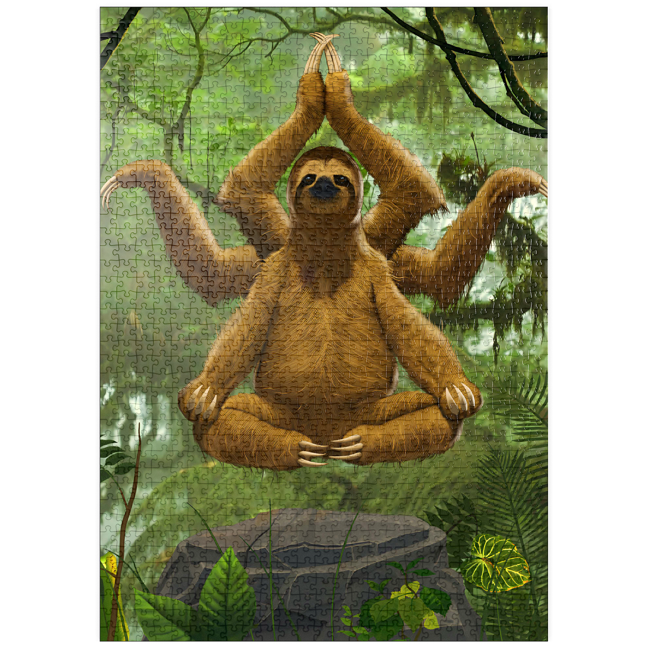 Das Kunstwerk zeigt ein Dreifingerfaultier in einer meditativen Yoga-Pose, das scheinbar über einem Felsen in einer üppigen Regenwaldkulisse schwebt. Das Faultier hat ein zusätzliches Paar Arme, das an einen indischen Hindu-Gott erinnert und dem Bild ein skurriles, surrealistisches Element verleiht. Die Gesamtatmosphäre ist ruhig und friedlich.