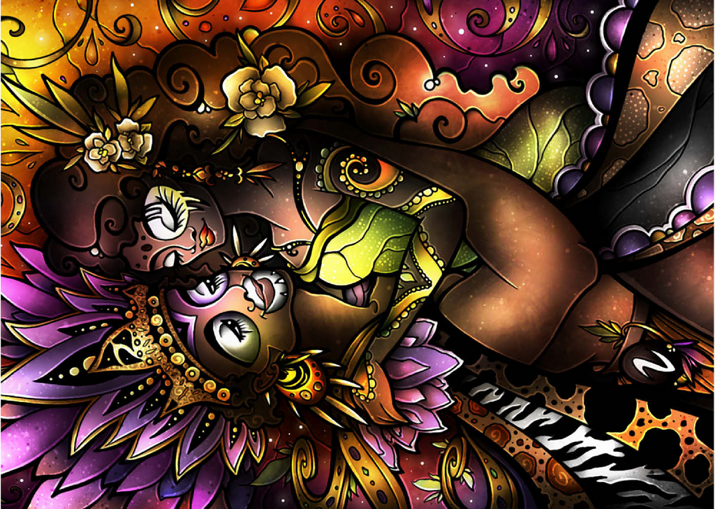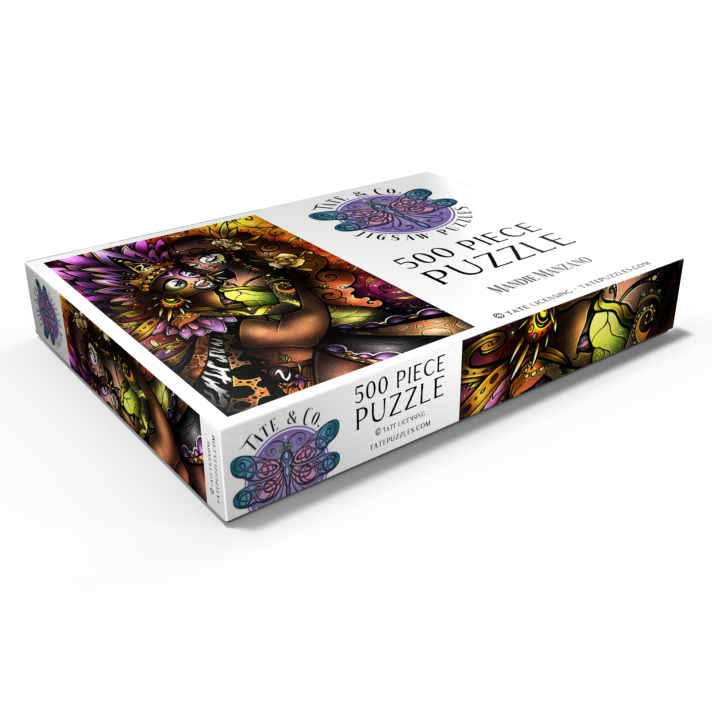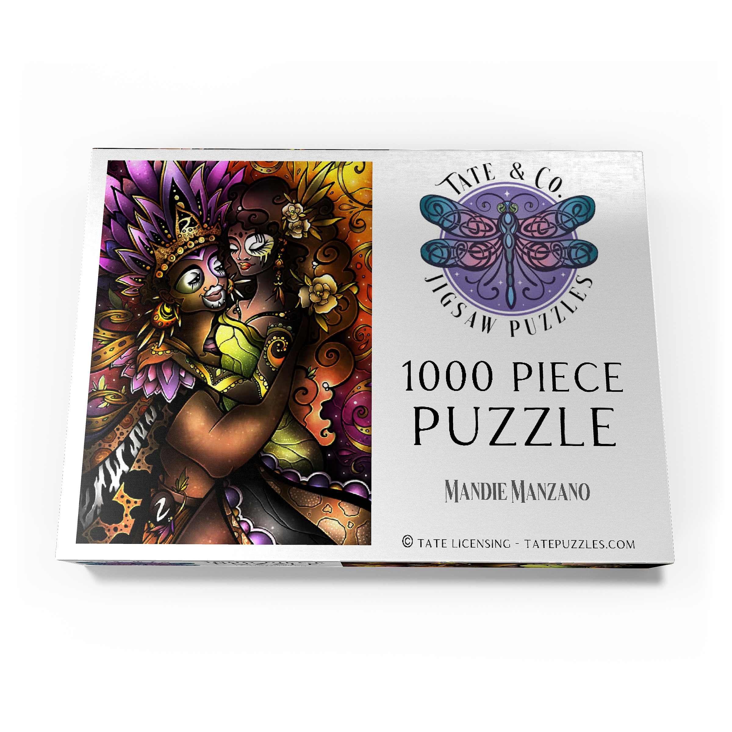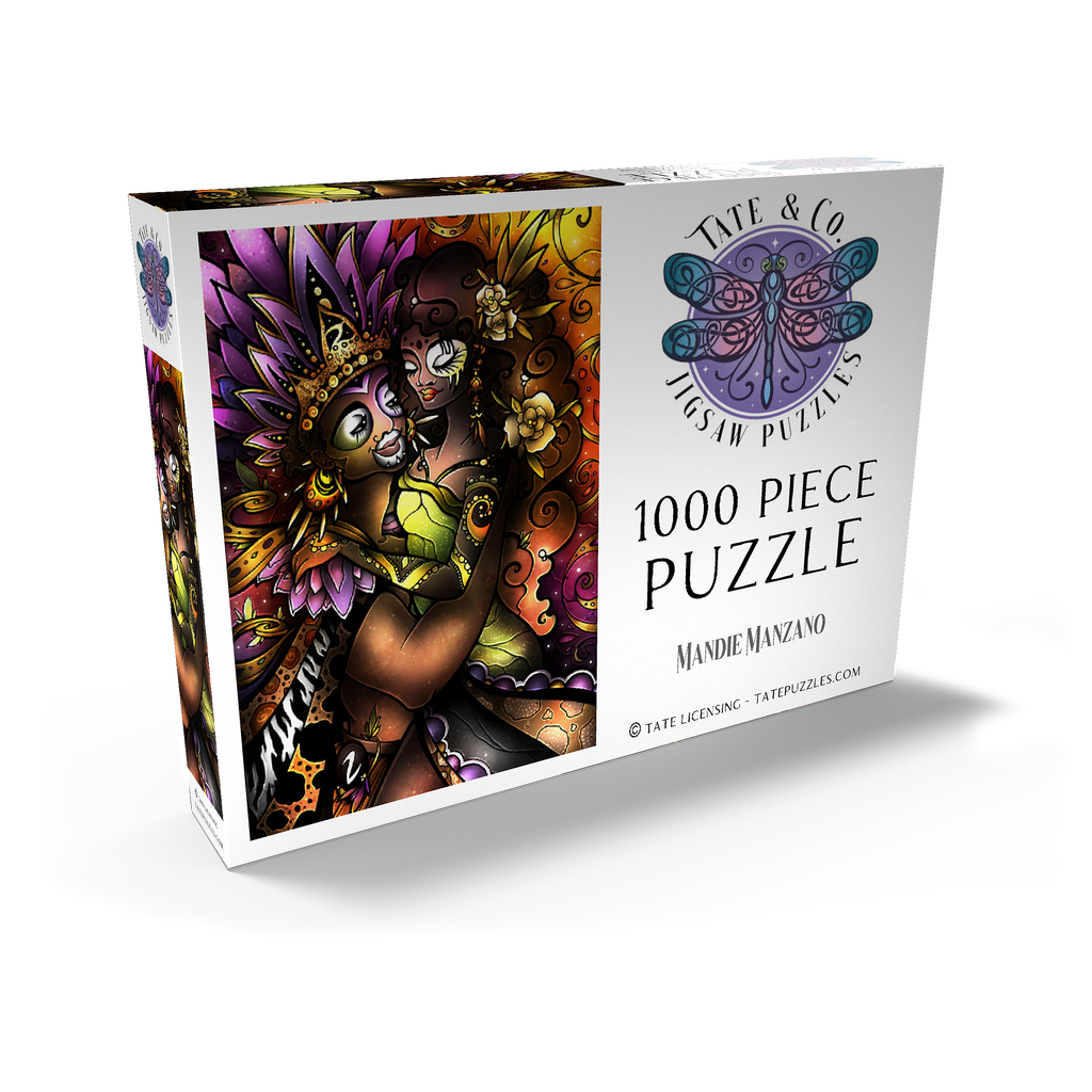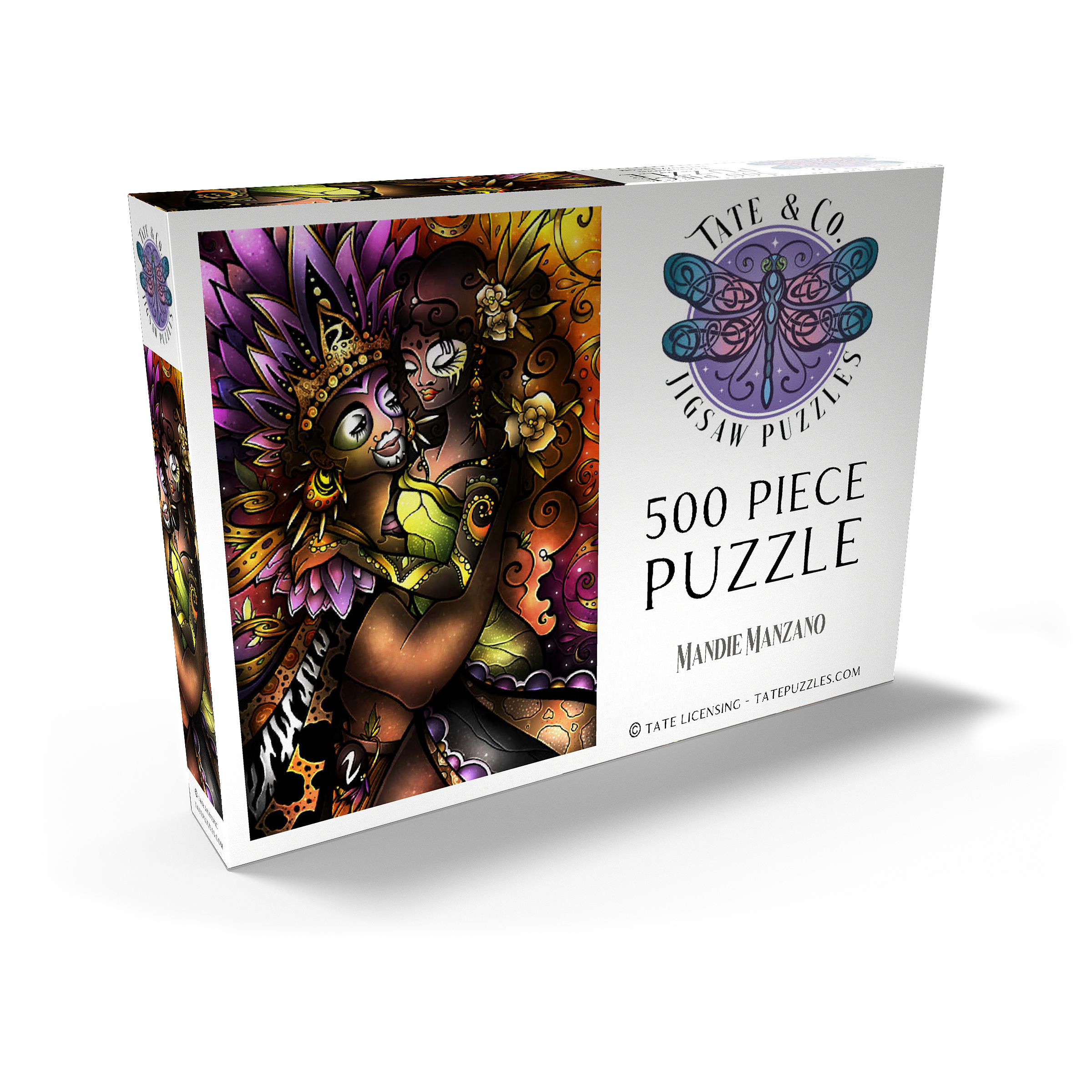Dieses lebhafte Gemälde der Künstlerin Mandie Manzano zeigt einen König und eine Königin des Krewe of Zulu, die im Mittelpunkt des Karnevals in New Orleans stehen. Das Kunstwerk strotzt vor Farben und zeigt ihre aufwendigen Kostüme: einen gefiederten Kopfschmuck für den König und Blumenschmuck für die Königin. Ihre Gesichter, die mit traditionellen Markierungen bemalt sind, zeigen einen zärtlichen Blick zwischen ihnen. Der Hintergrund wirbelt mit komplizierten, farbenfrohen Mustern und deutet auf die festliche Energie des Karnevals hin. Das Puzzle verspricht eine herausfordernde und visuell reichhaltige Zusammenstellung.